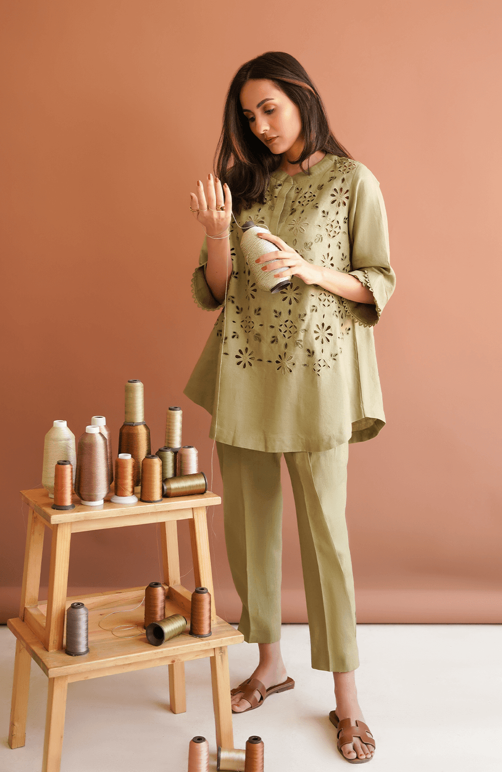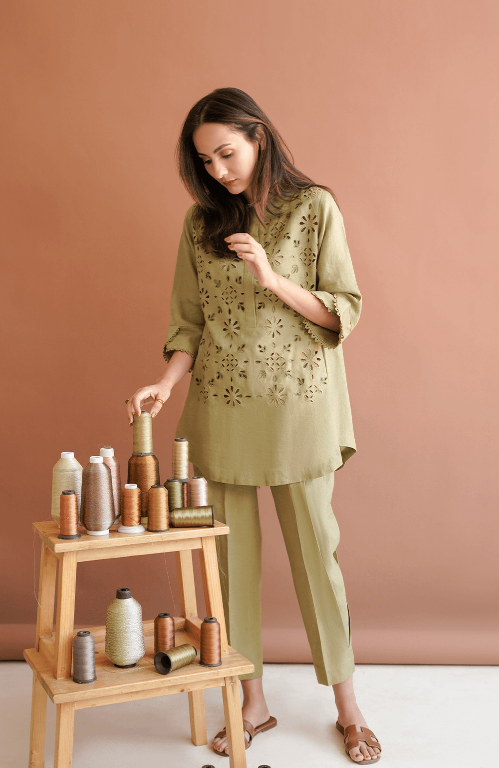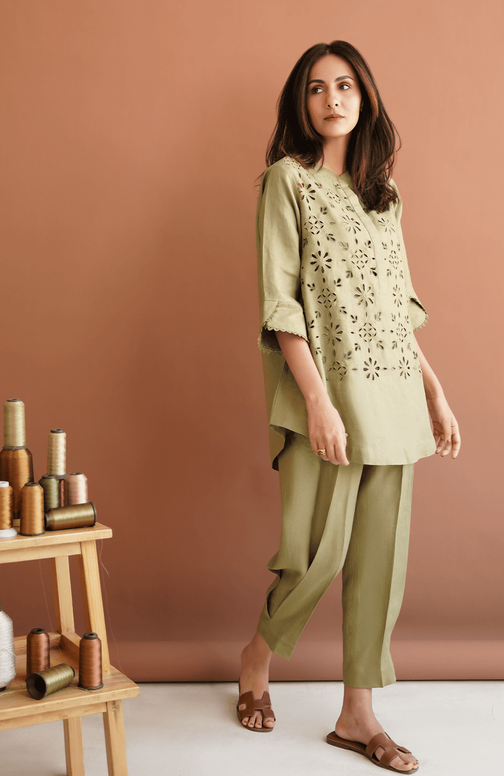 Pepper Stem green matching separates have cutwork on the shirt and a rounded hemline. This olive green shirt is finished with embroidery and resham work. To complete this set, pepper stem matching separates come with a side box pleat straight fit shalwar for a casual and breezy look.
