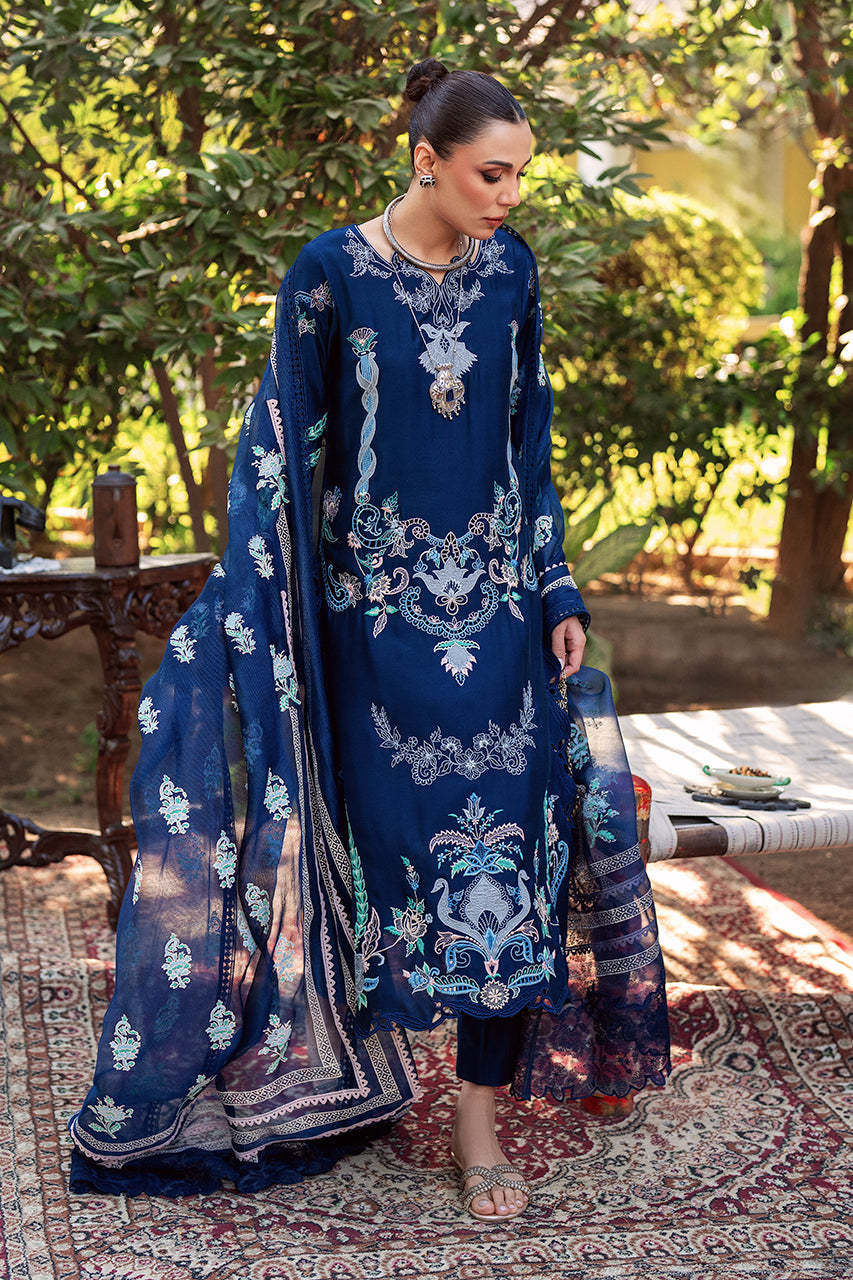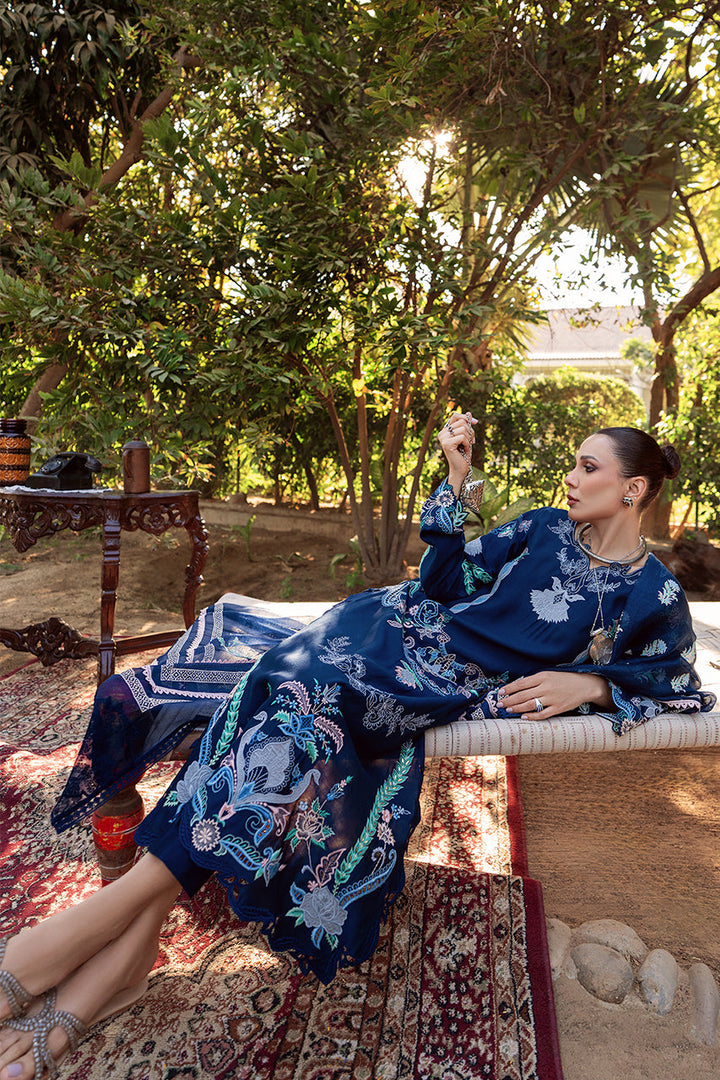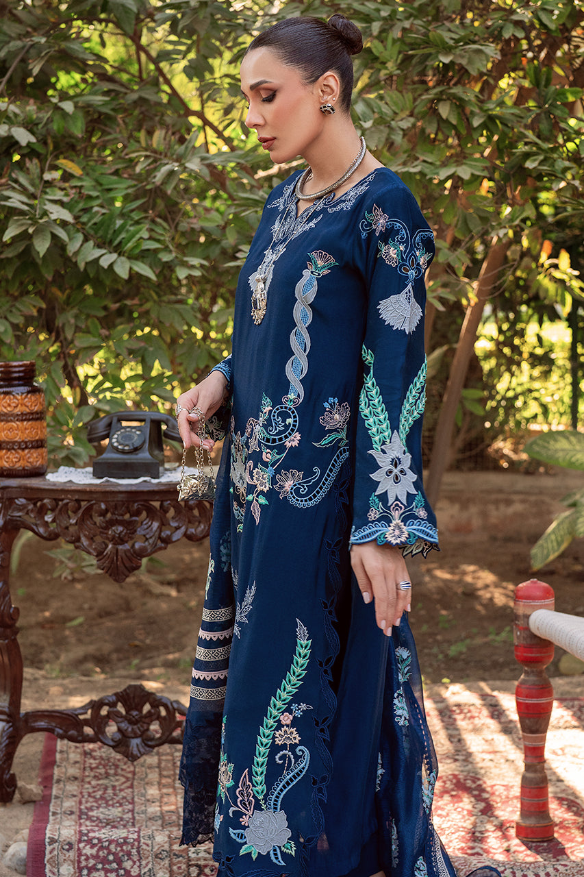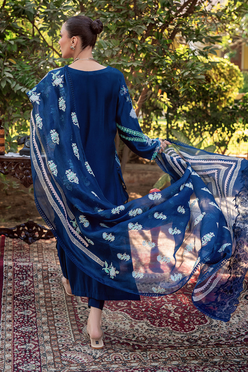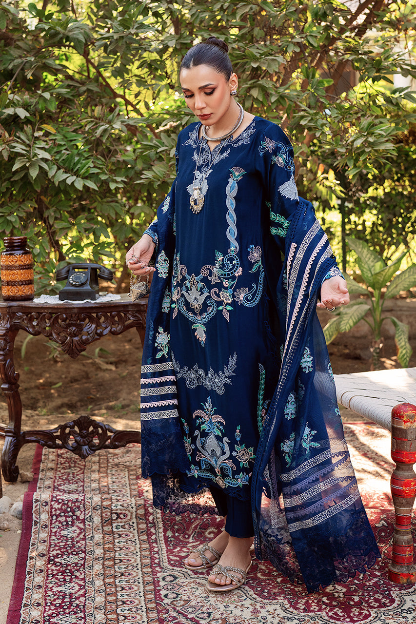 Pernia' exudes effortless luxury, with its cascading block printed dupatta and and a sweeping khaadi silk shirt. This navy blue canvas is exquisitely embroidered with intricate applique, resham & cutwork....