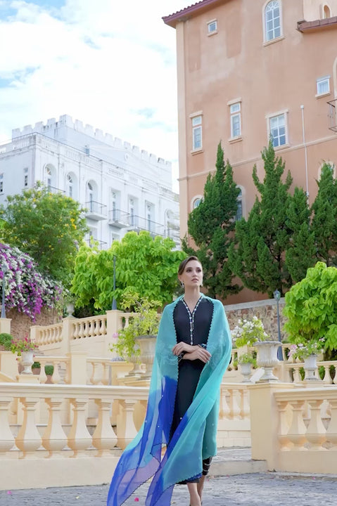 SHIRT: A black, raw silk shirt crafted with embroidery on the front and sleeves; made complete with mirror work detailing. CULOTTES: Raw silk culottes with embroidery. DUPATTA: Organza dupatta with...