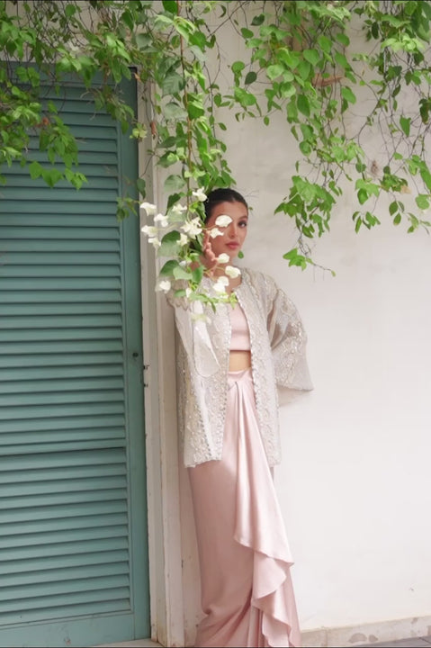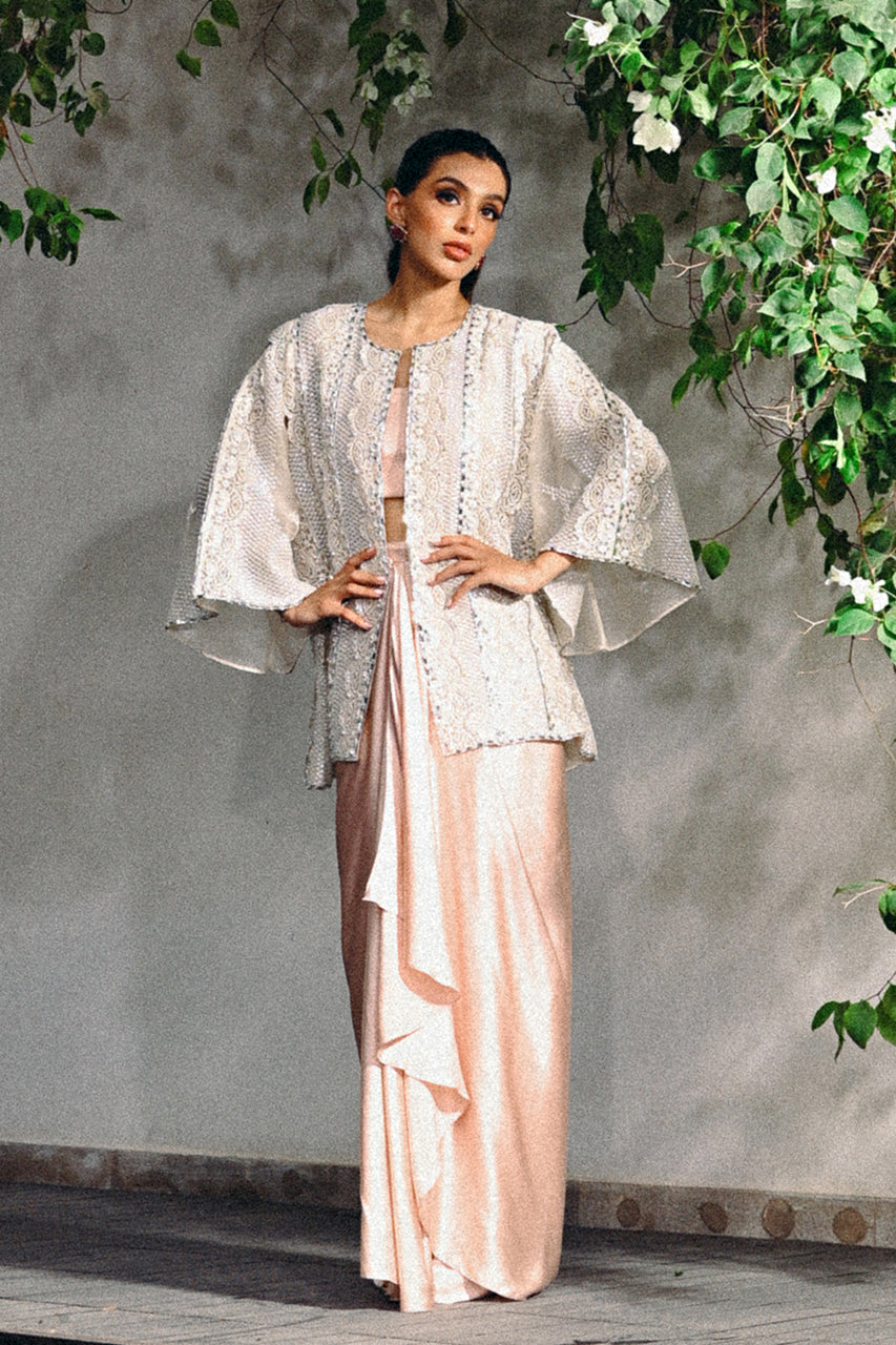 Reminiscent of a romantic escape, a statement lace jacket in an ethereal ivory hue drapes over a blush pink charmeuse tube top and waterfall skirt. Silver stones and pearls are meticulously embroidered along the lace panels, illuminating the oversized jacket with its theatrical, flared sleeves.