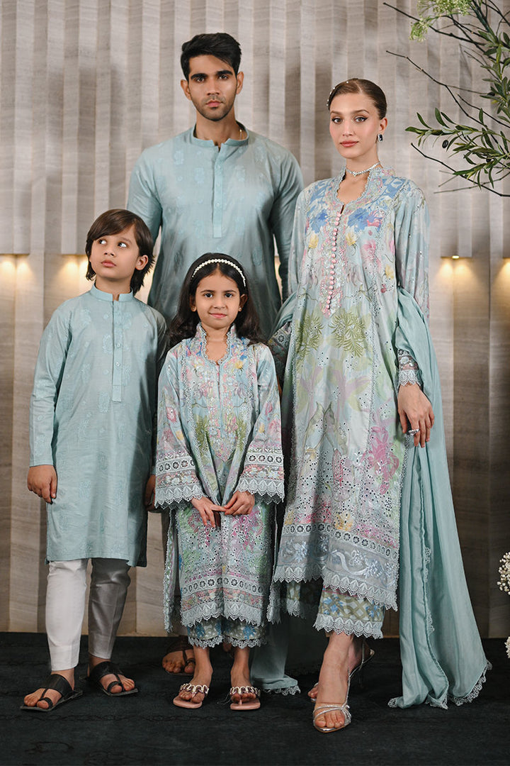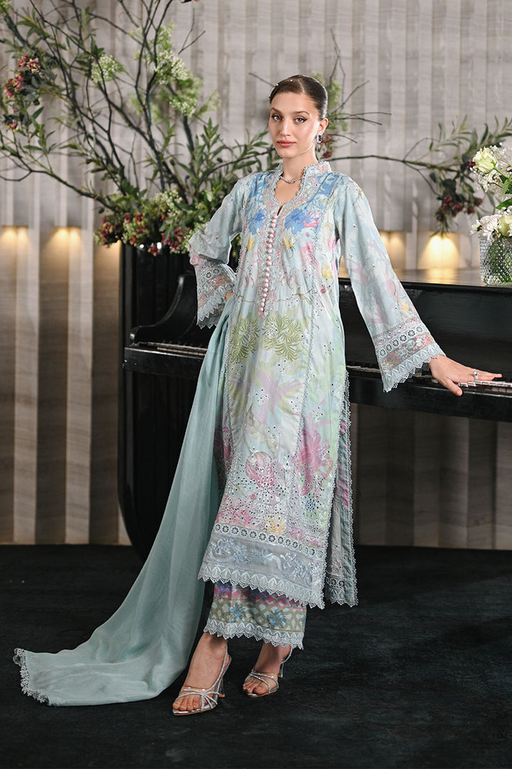 This light turquoise blue-printed long shirt features delicate hints of purple, pink, and green, accented with intricate embroidered organza borders and graceful bell sleeves adorned with lace detailing. Paired with a luxurious silk dupatta, complete with lace borders, and an izaar that echoes the elegance with its own lace trims.