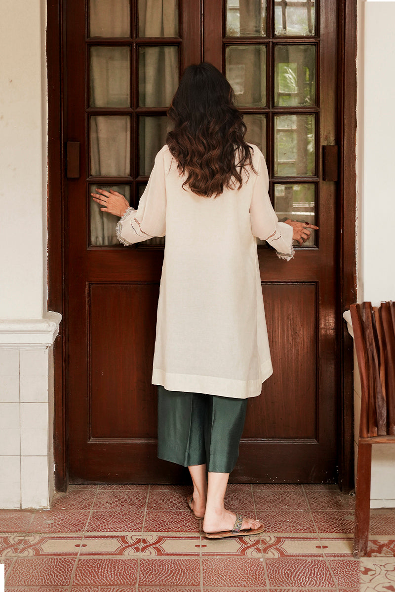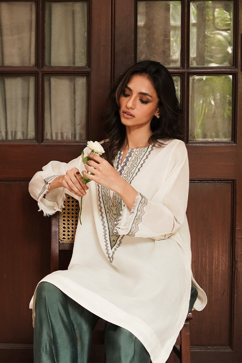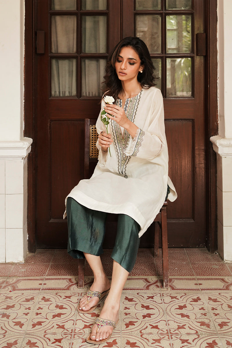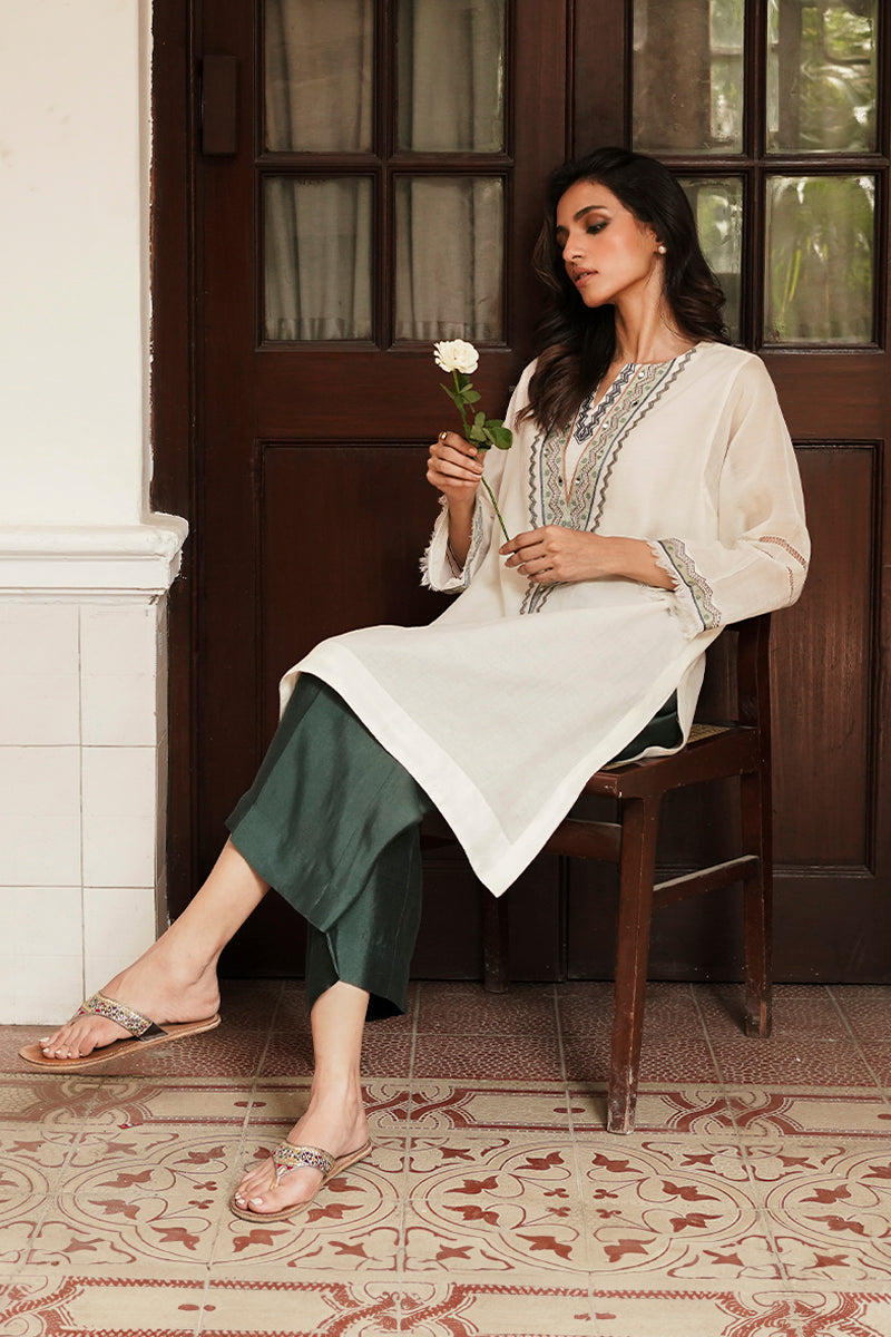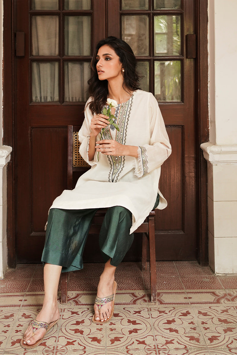 This summer, don’t shy away from turning your basic culottes into green culottes. Raha is a perfect blend of ethnic yet contemporary evening looks. This box-cut silhouette consists of machine...