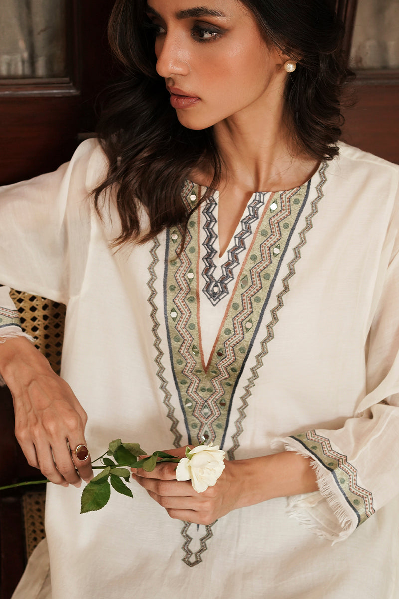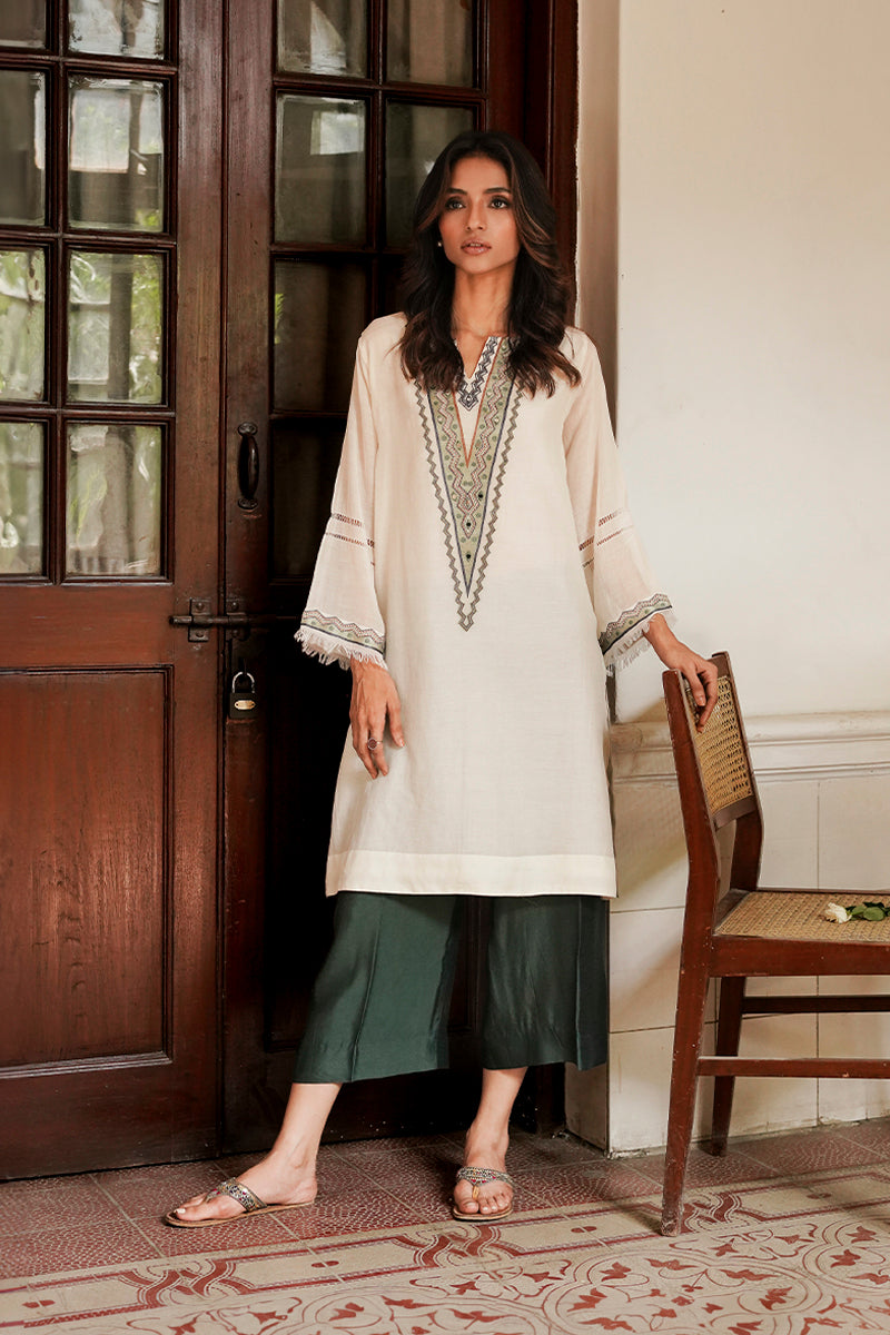 This summer, don’t shy away from turning your basic culottes into green culottes. Raha is a perfect blend of ethnic yet contemporary evening looks. This box-cut silhouette consists of machine embroidery, while the v-neckline is adorned with mirror and cutwork, captivating tarkashi work on sleeves, and shredding detailing.