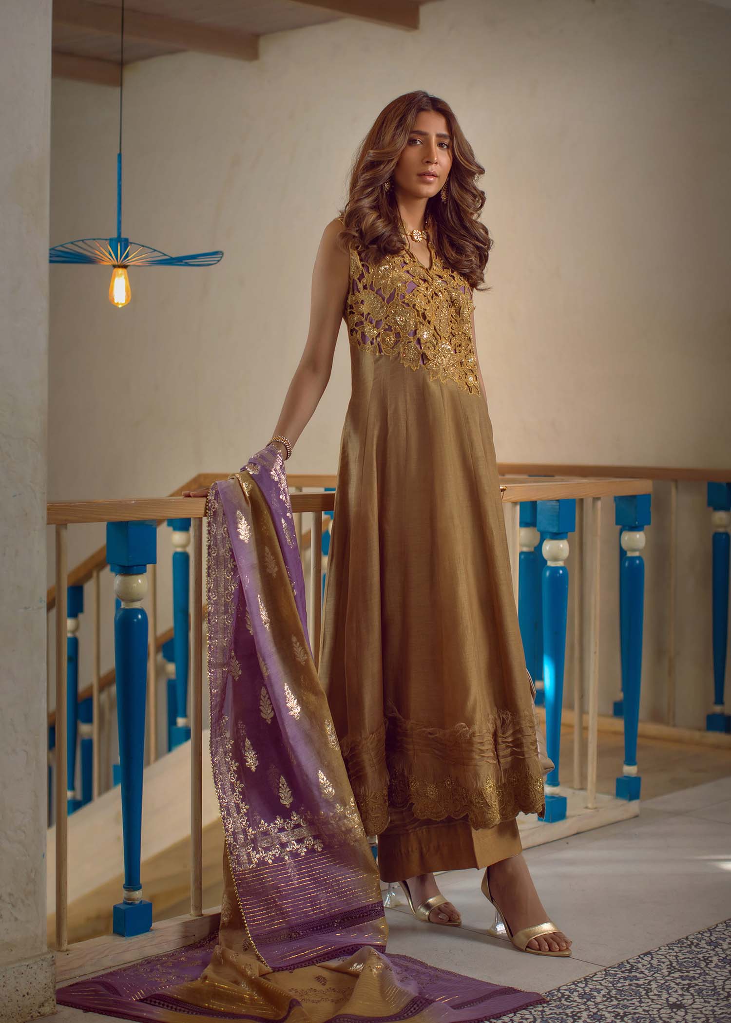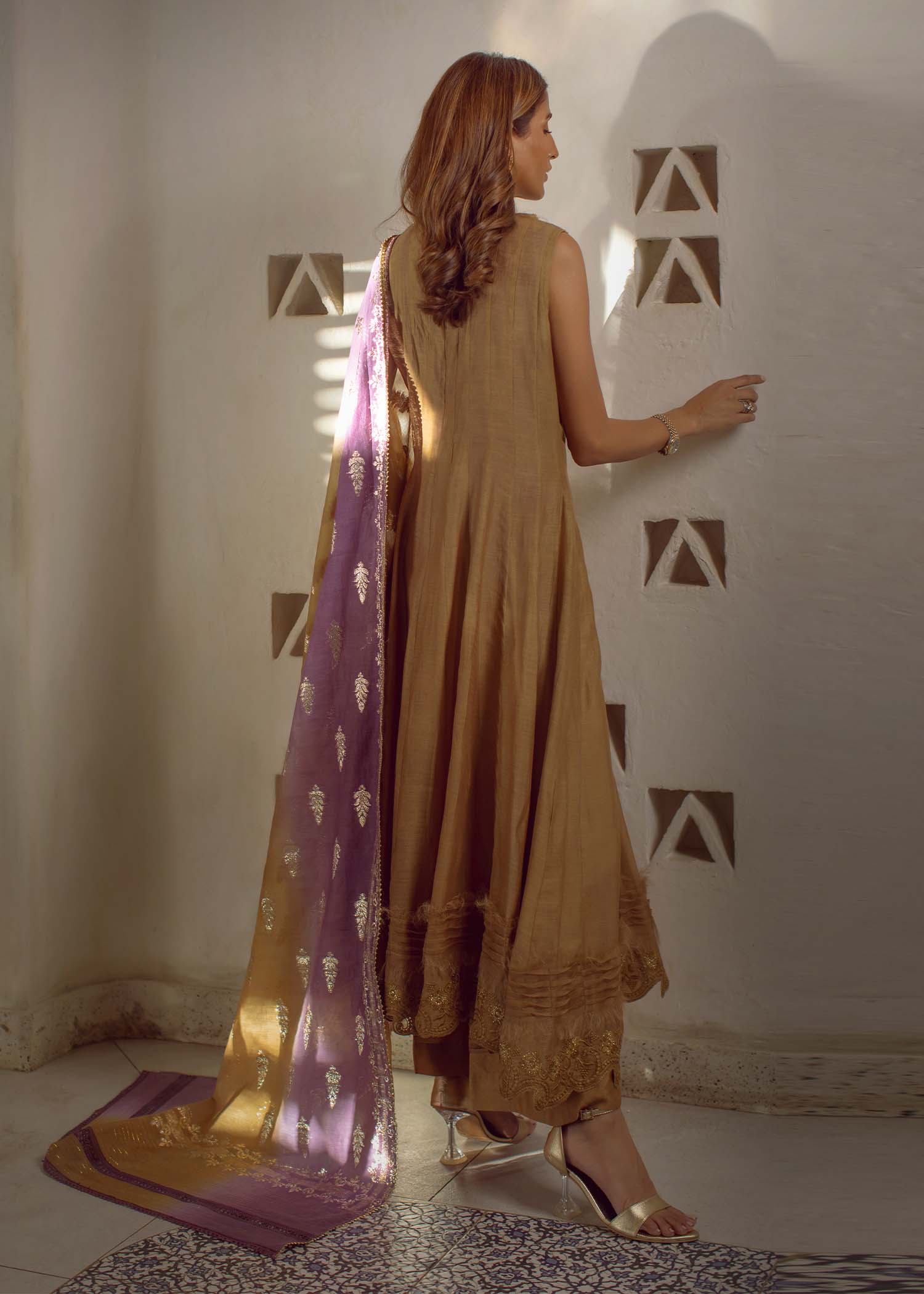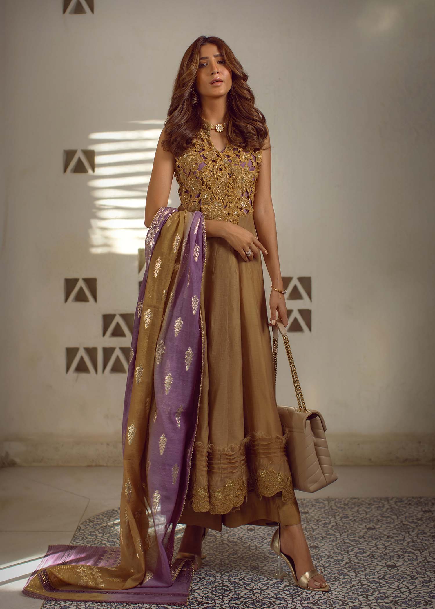 Color: Gown: Honey Mustard Dupatta: Lavender Hints  Description: Indulge in the ultimate sophistication with our double pure cotton layered Kalidaar, expertly crafted with intricate monochromatic cutwork details and adorned with delicate...