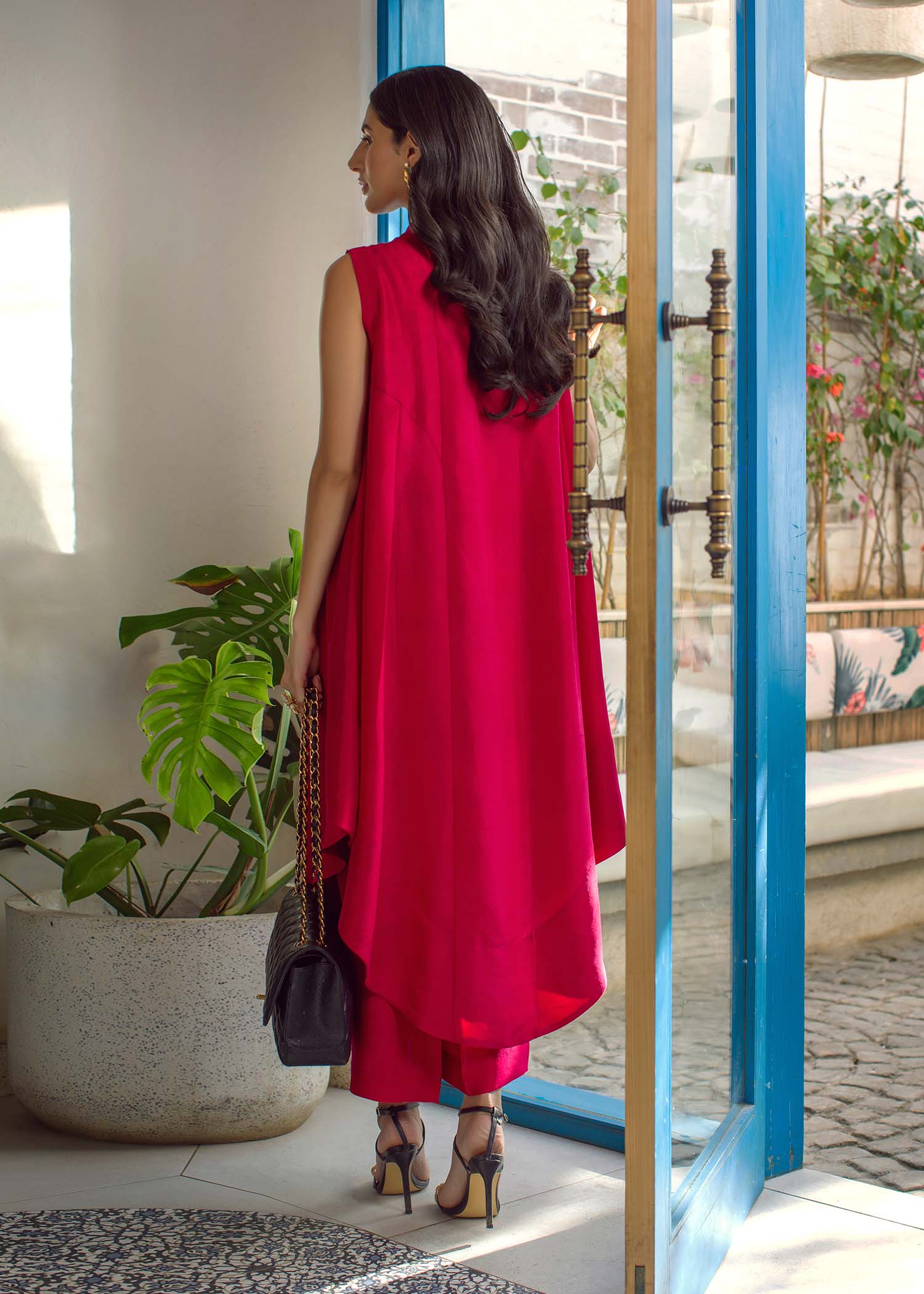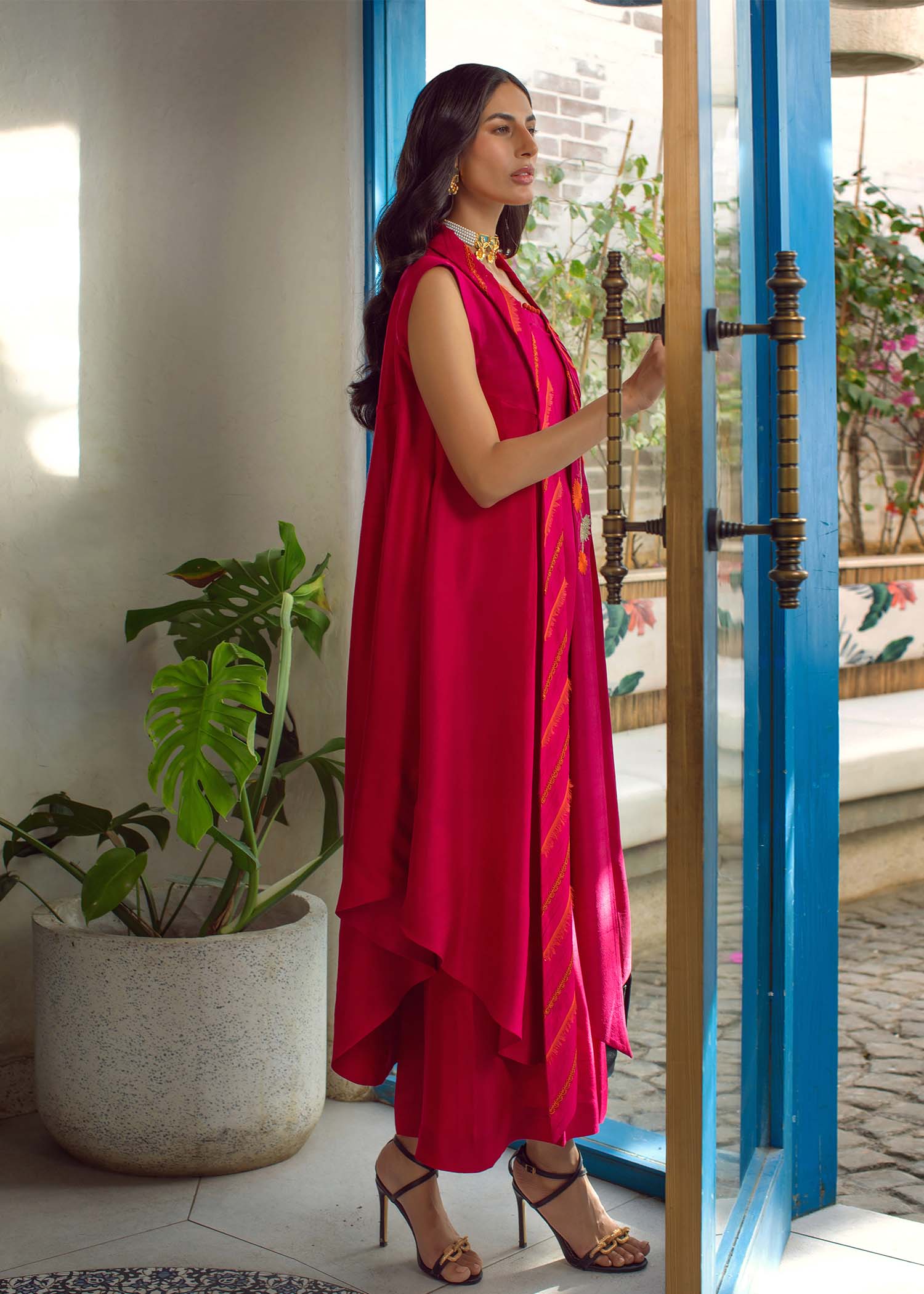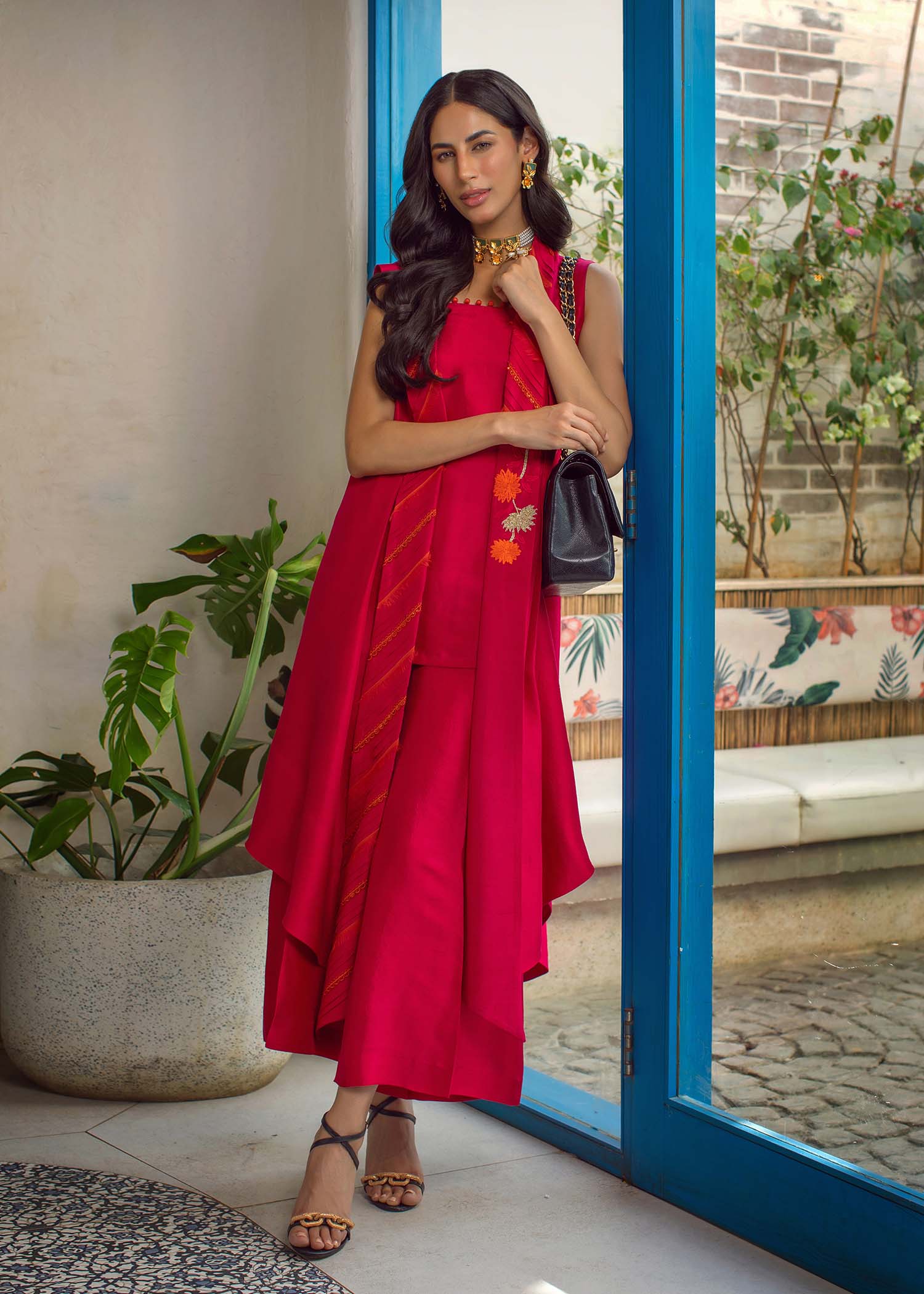 Indulge in the epitome of elegance with this enchanting ensemble, crafted from pure rawsilk in a mesmerizing pomegranate pink hue. Adorned with breathtaking floral embroidery in sunset orange, and embellished with intricate zari work flowers, this garment is a true masterpiece of artisanal craftsmanship. Exquisite fabric manipulation techniques, such as the delightful orange fray organza pleated detail and the glittering sequin floral lace, which create a unique and captivating texture. his exquisite coat is perfectly paired with rawsilk culottes, which offer a sleek and modern touch.
