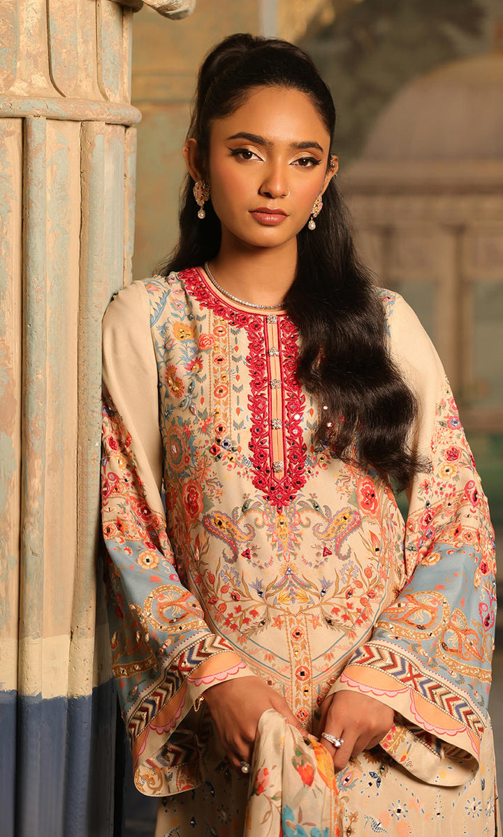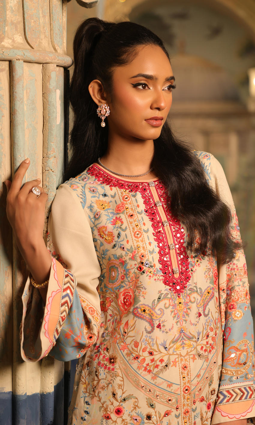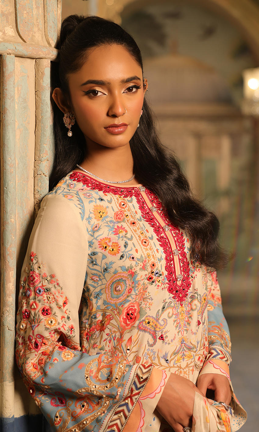 A sleek mirrored neckline atop soft neutral florals, complete with a printed dupatta and plain ezaar.