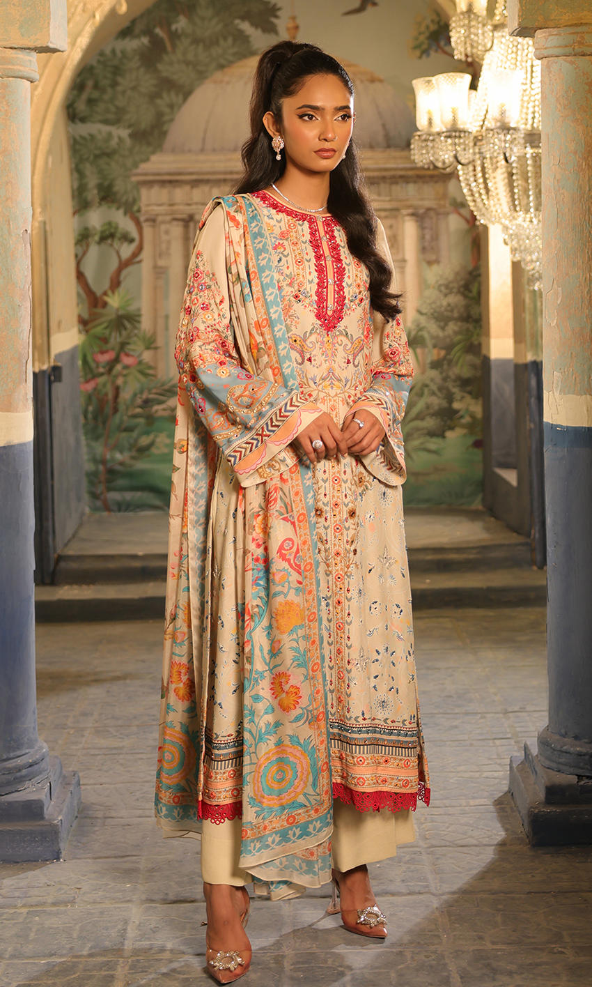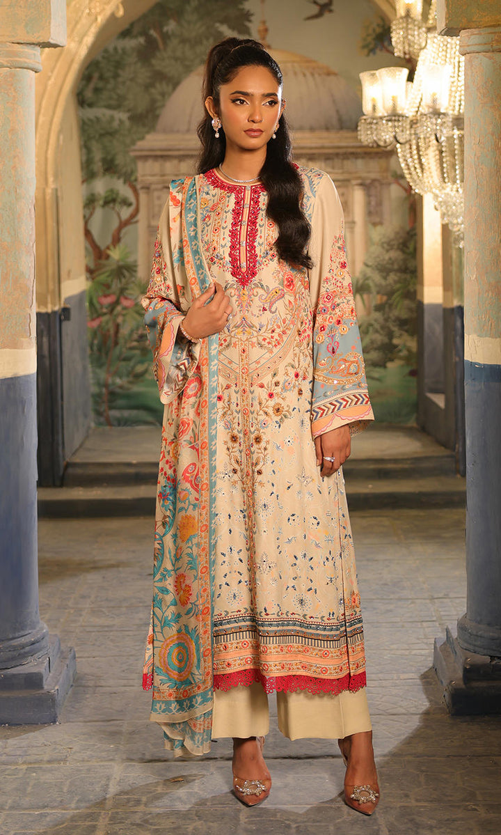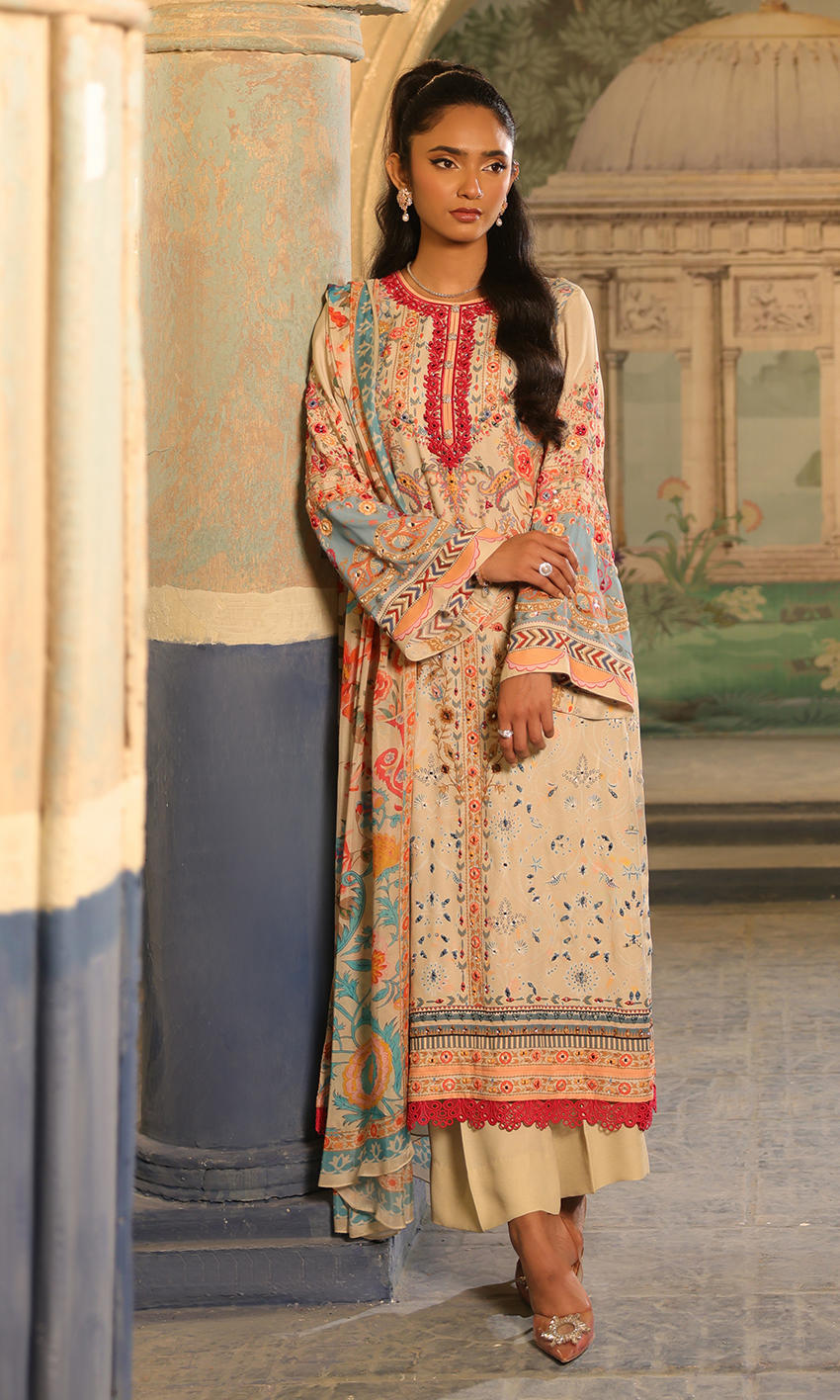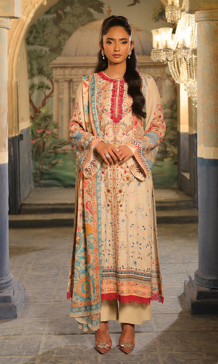 A sleek mirrored neckline atop soft neutral florals, complete with a printed dupatta and plain ezaar.