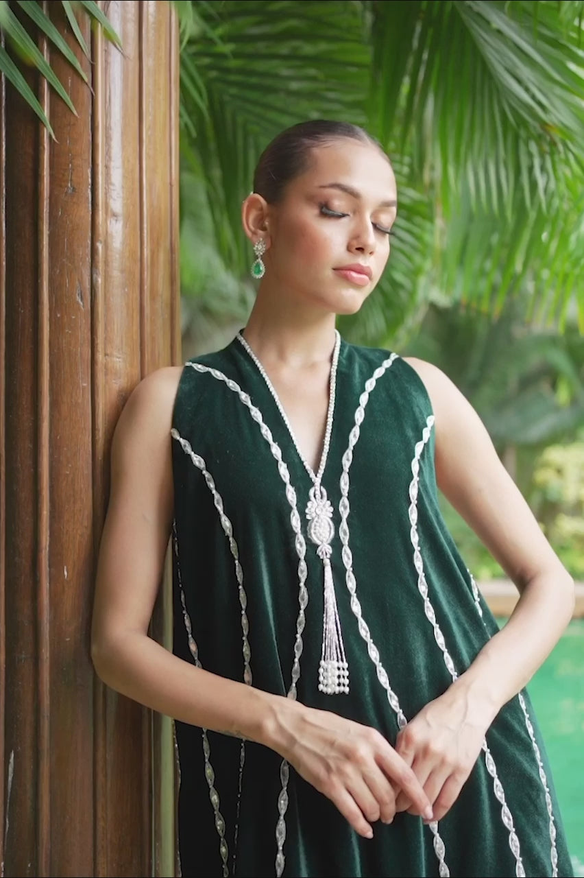 Crafted from rich bottle green velvet, a sleeveless column kaftan is adorned with curvaceous zardoze embroidery that elevates its minimalist design. The beaded tassel accents on the deep v-neckline add a touch of timeless elegance, elevating the silhouette.