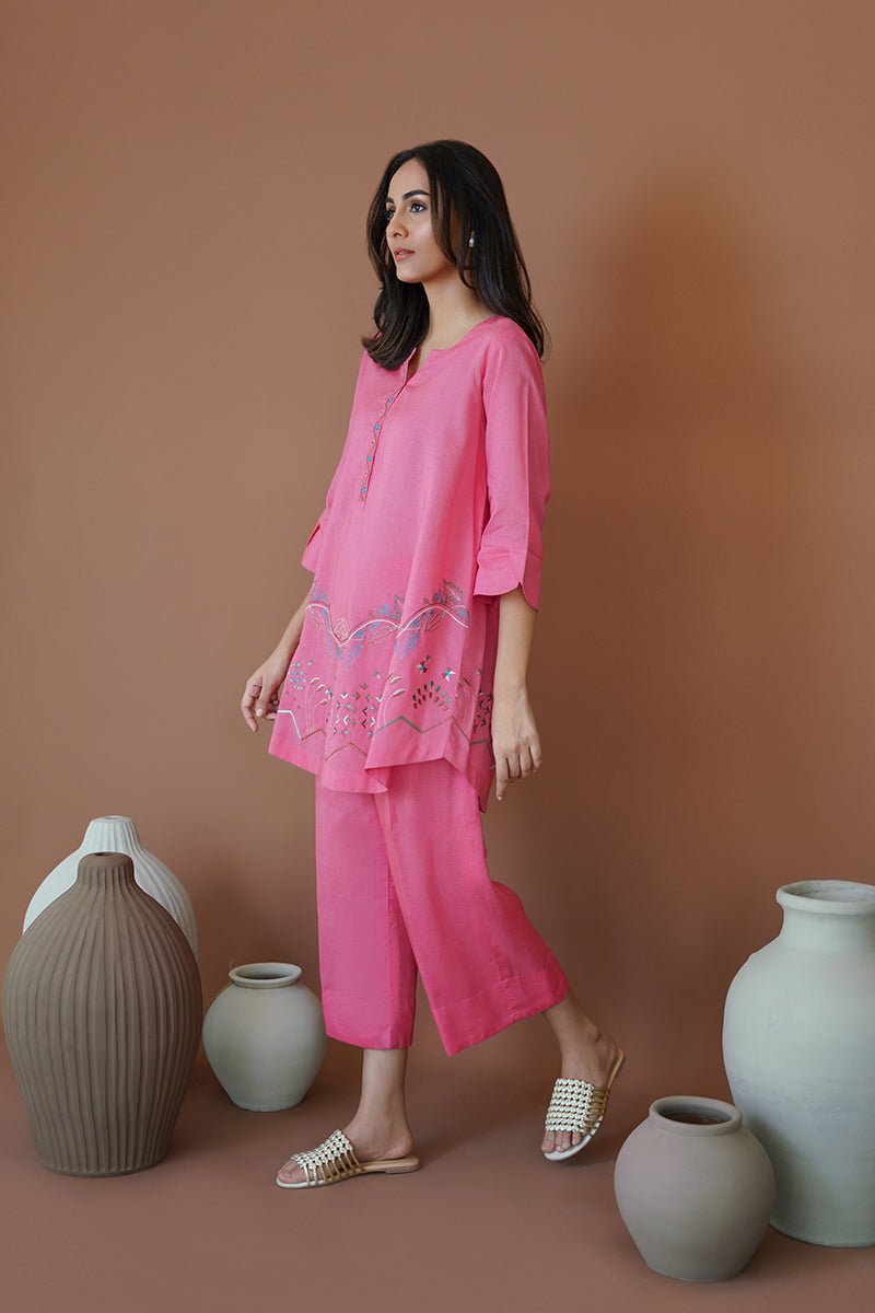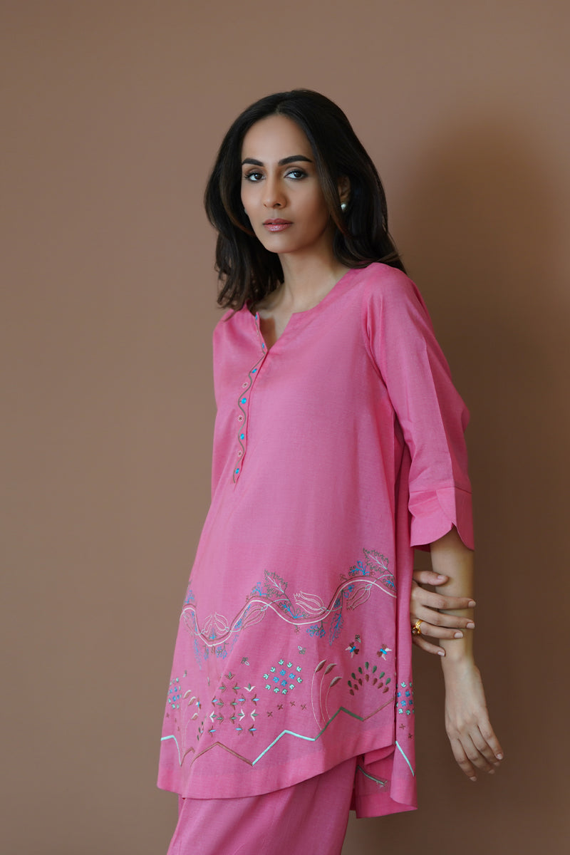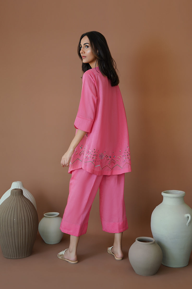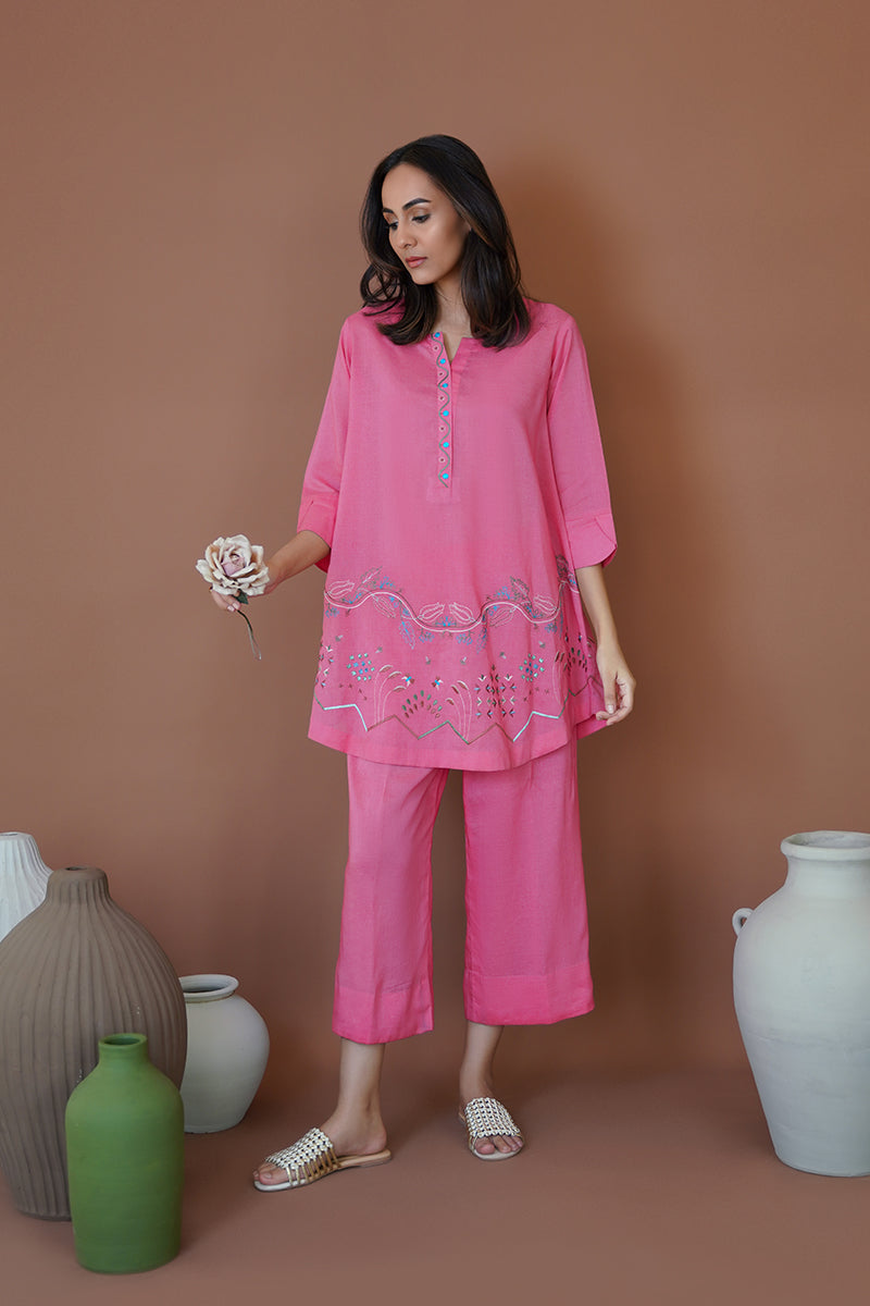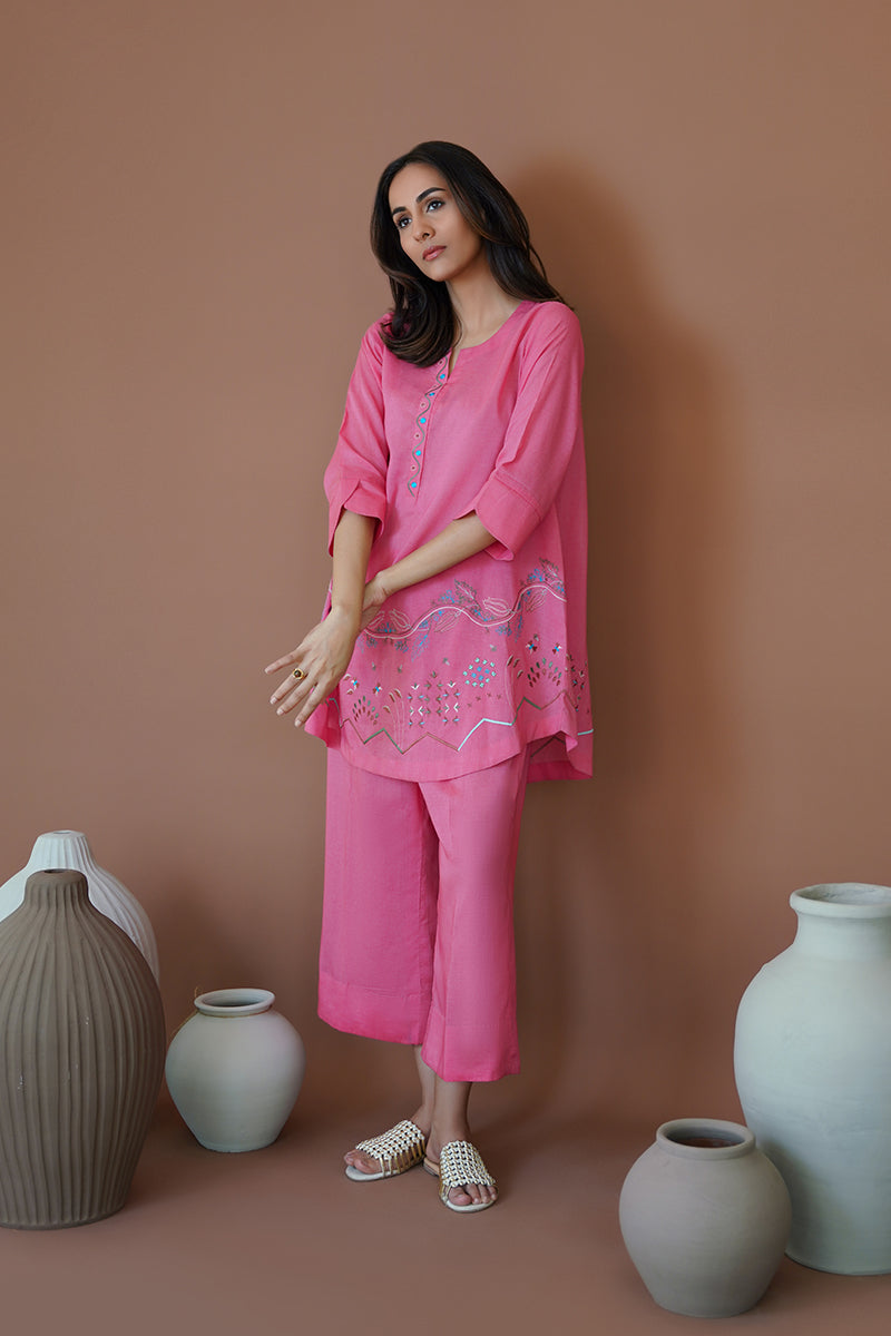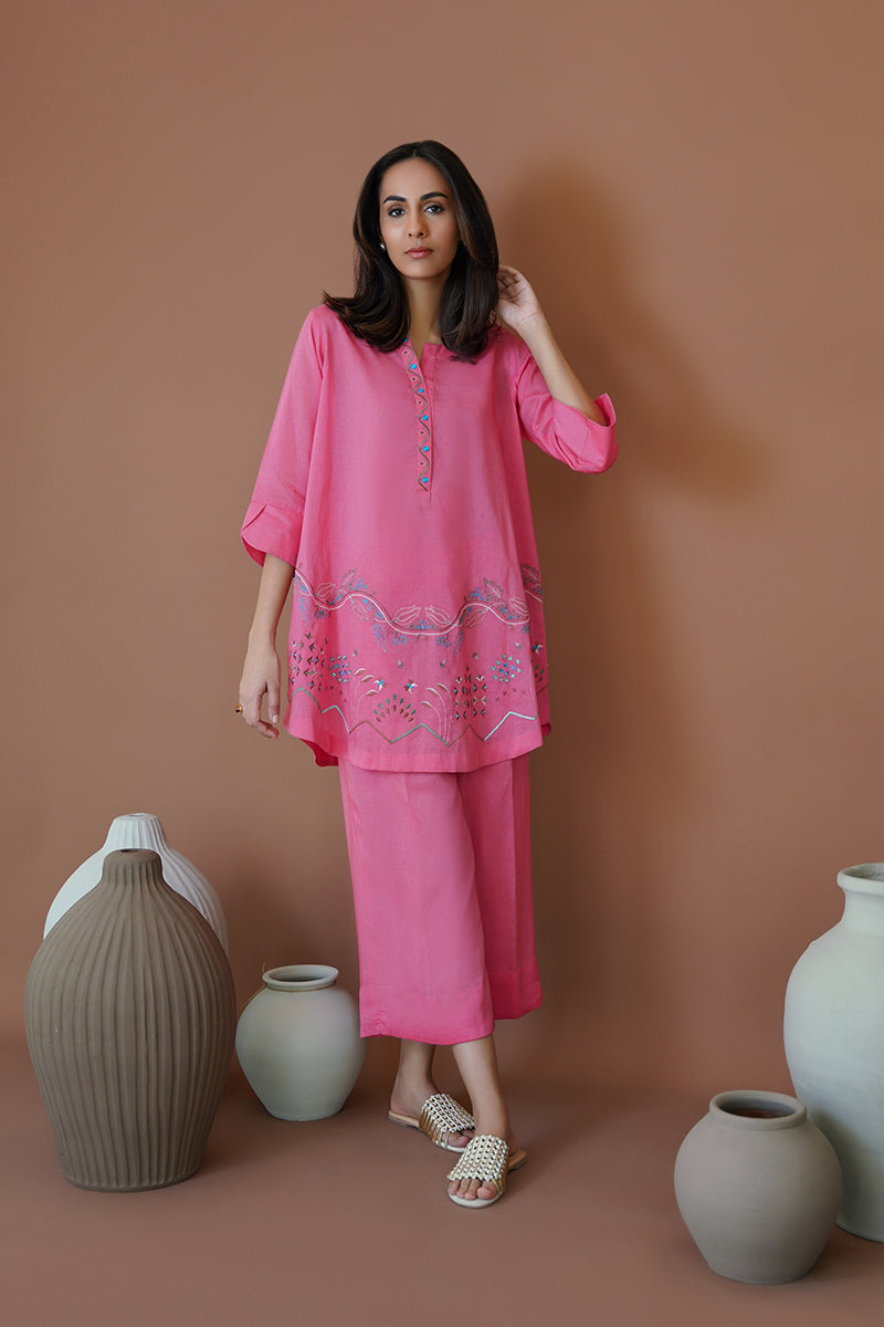Raspberry Sorbet, a captivating azalea pink silhouette, is a perfect choice for a day-to-night look this season. Flaunting resham work and machine embroidery on the neckline and rounded hem, this ensemble exudes perfection and elegance. Pair with our raspberry sorbet culottes for a chic and minimal look, perfect for a busy afternoon.