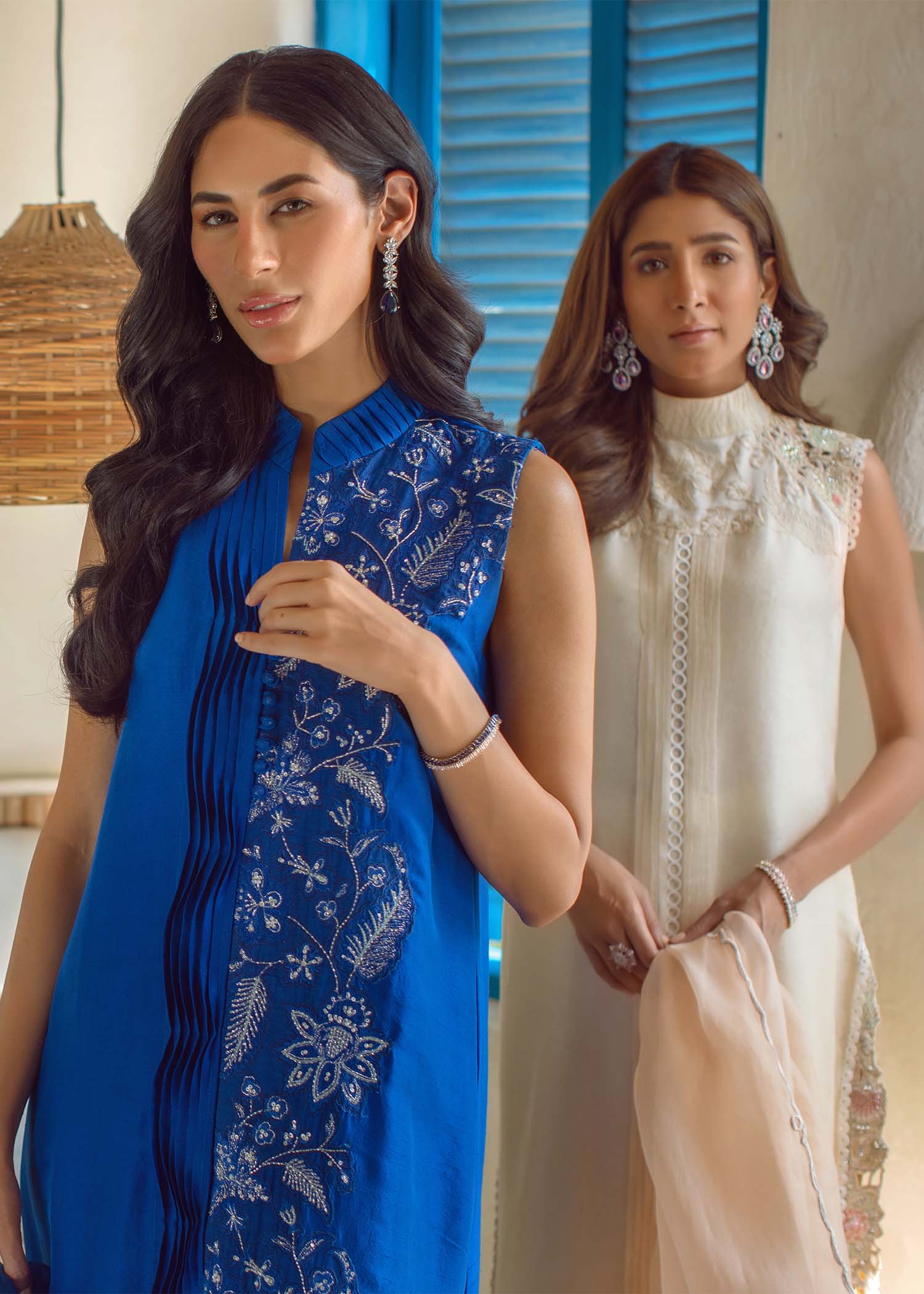 The indigo blue dress made out of pure raw silk with intricate embroidery and hand embellishments. Inverse pleating detail at the front and back of the shirt is a stunning piece of craftsmanship that exudes luxury and sophistication. The pleating detail on the collar adds an extra layer of detail and texture, making the dress even more exquisite.