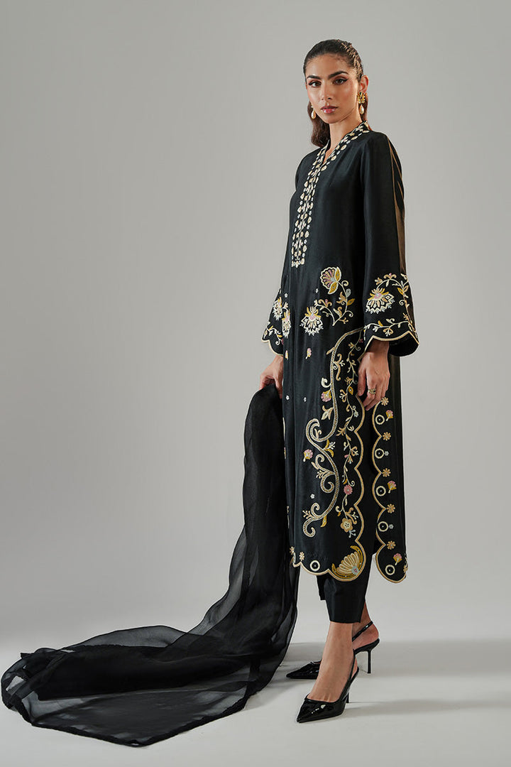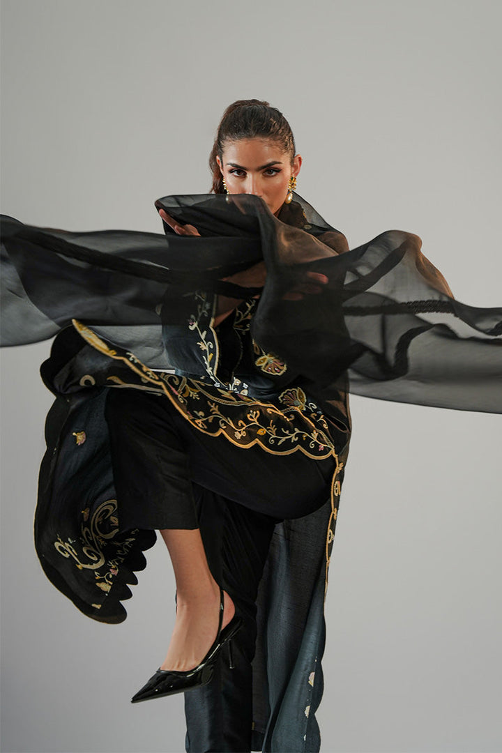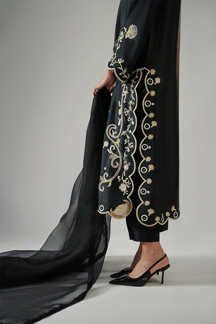 Make a statement this Eid! A luxurious black pure rawsilk Aari shirt that exudes elegance, featuring intricate Aari embroidery along the neckline, showcasing delicate craftsmanship and timeless beauty. The shirt is designed with a scalloped hem and scalloped sleeves, adding a soft, feminine touch to its sophisticated silhouette. The ensemble is completed with a flowing organza dupatta, adorned with lace details that create a delicate contrast to the deep richness of the rawsilk. Paired with straight pants made of pure rawsilk ( as an add on), the outfit combines comfort with style, creating a seamless, chic look perfect for any special occasion.