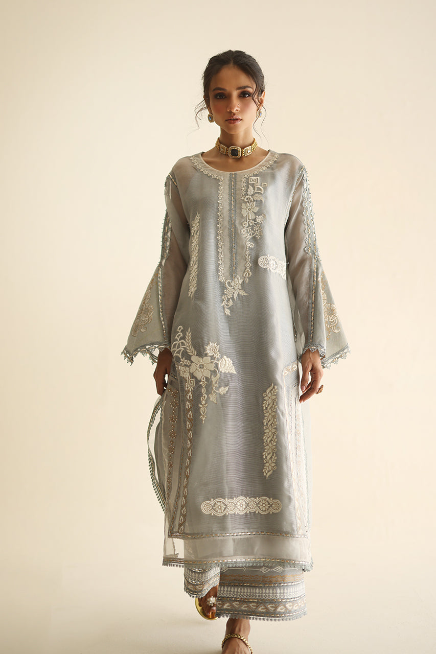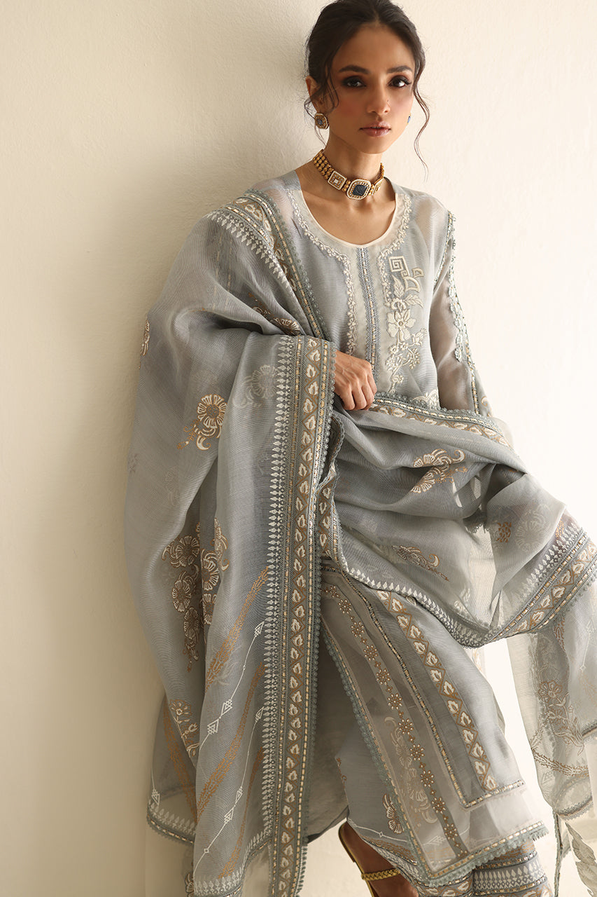 This long gray shirt represents a classic N|F canvas replete with lace inserts, gotta weave, block print & stunning embroideries. The block printed culottes and dupatta complete the outfit for...