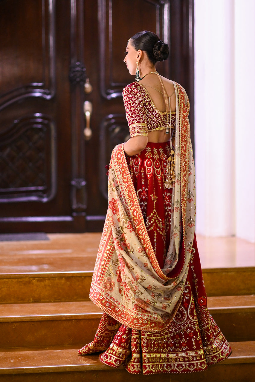 A perfectly chosen shade of the richest scarlet! The pure raw silk lengha is adorned with intricate resham embroidery and further enhanced with traditional embellishment of zardozi, gotta & kaamdaani....