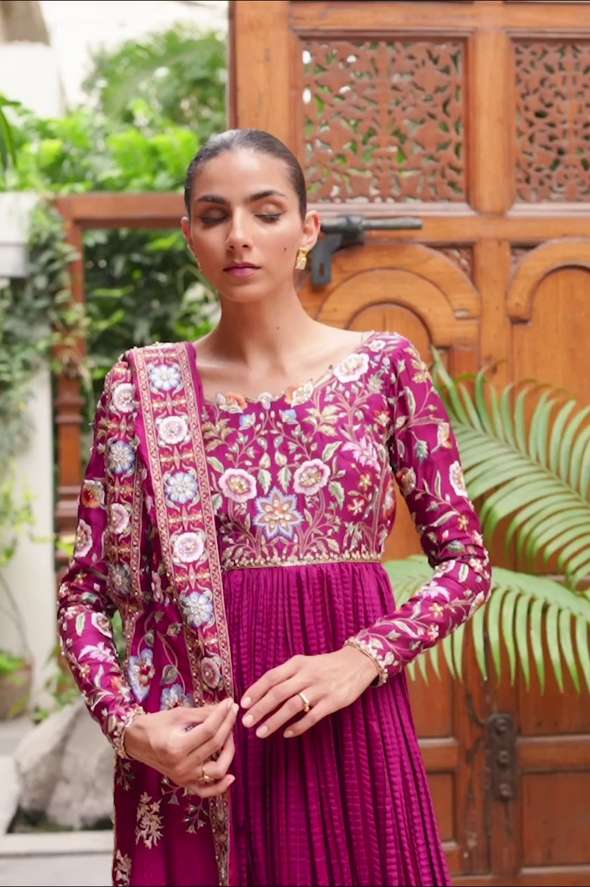 Nothing is more timeless than a statement shawl, cut from a ruby red self jamawar, adorned with hand embellishment and resham embroidery across the border and the pallu. A cascading peshwas in the deepest hue of ruby red in crushed khaddi silk is the perfect partner with its exquisitely embroidered bodice and long sleeves.