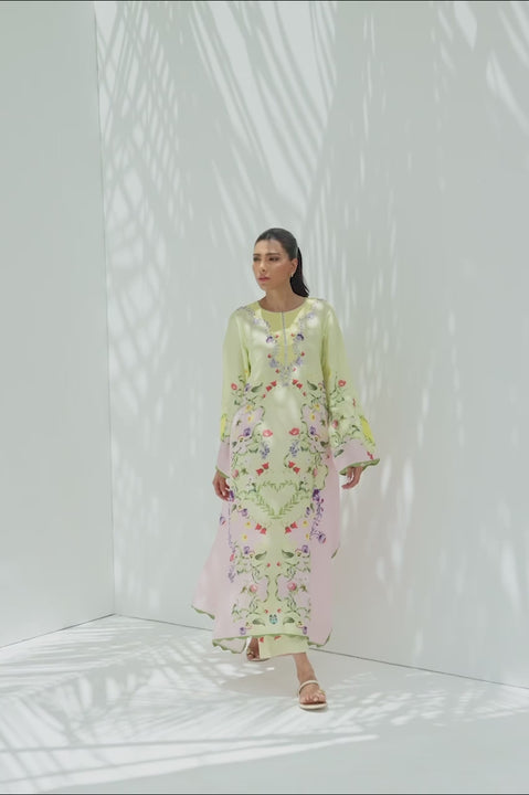A diaphanous pure rawsilk silhouette is rendered in a soft citrus tea green and muted lilac print, inspired by a blooming English garden. The neckline and sleeves are delicately embroidered with botanical vines in silver resham, adding a touch of whimsy. Pair it with pure rawsilk tea green culottes, balancing effortless femininity with timeless sophistication.
