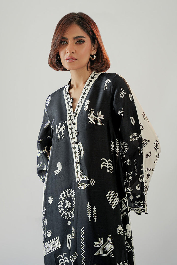 This black and ivory long cut pure rawsilk kurta is a sophisticated blend of bold elegance and ancient charm. Featuring intricate Egyptian motifs, the kurta’s detailed designs add a cultural richness to its modern silhouette. The striking contrast of the deep black fabric with the ivory motifs creates an eye-catching and refined look. Paired with straight black pantsas an add on , the outfit offers a sleek, elongated silhouette that exudes timeless sophistication. Whether for an evening event or a special occasion, this ensemble combines tradition with contemporary style, making a bold yet graceful statement. Model height 5'9, maximum shirt length 56"