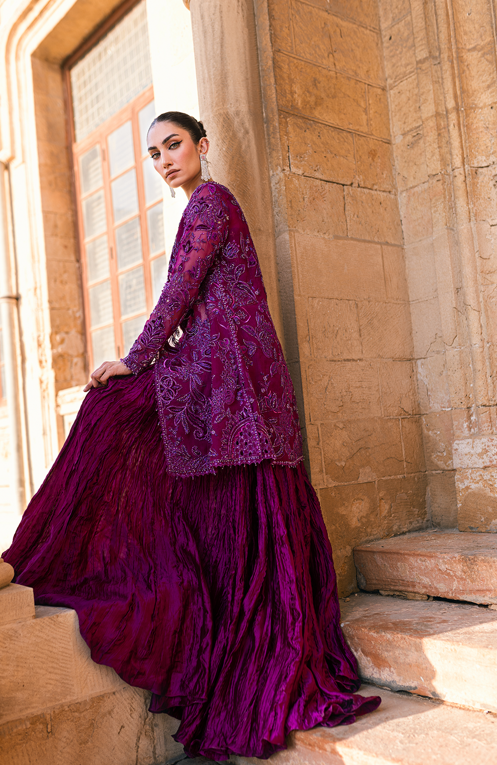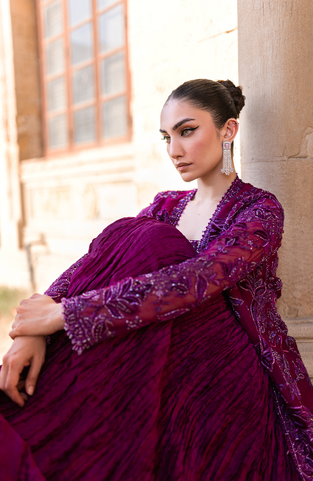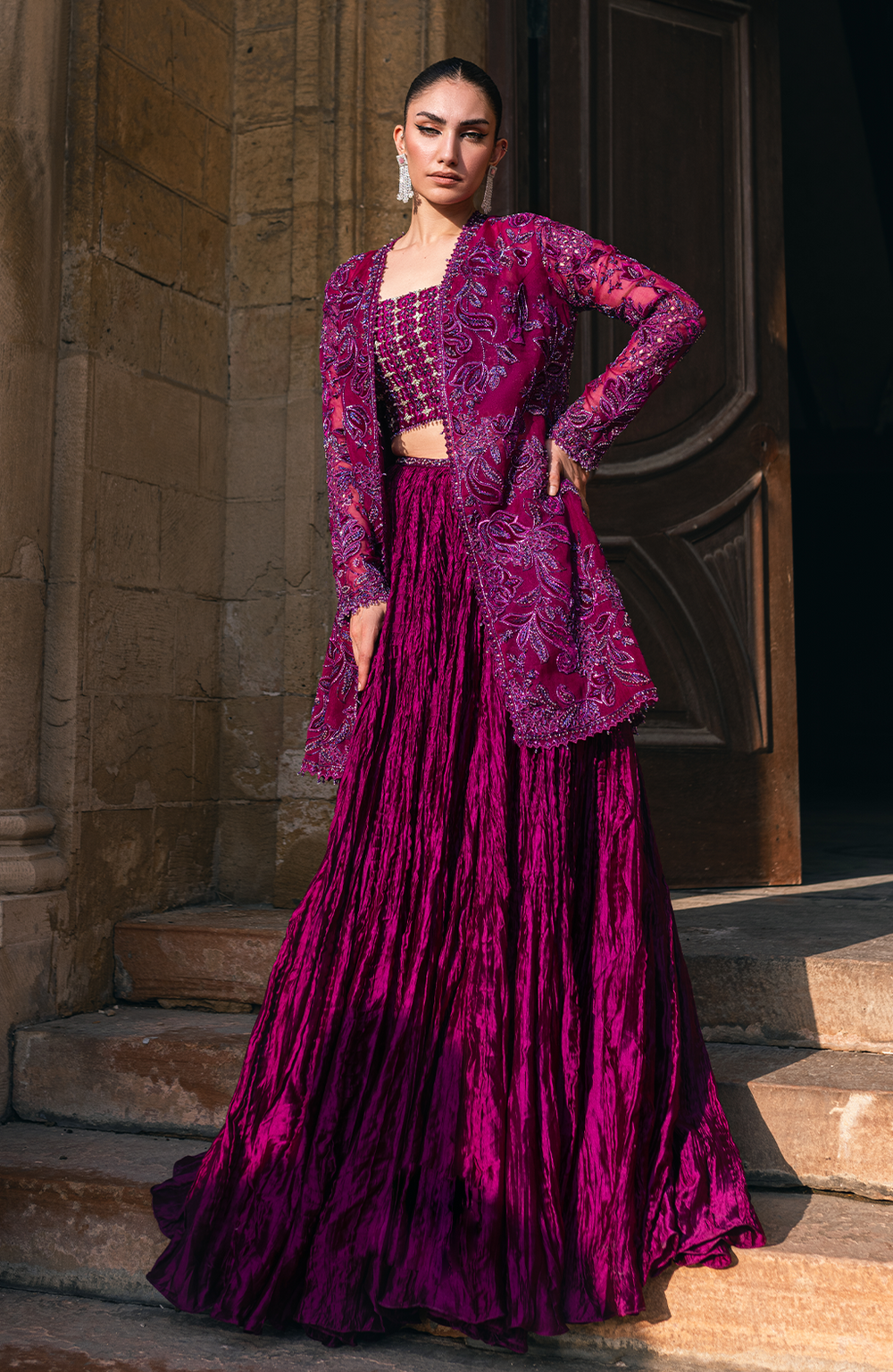 Featuring velvet appliques, cut dana and zardozi work, our Rose sorbet jacket is perfect for your festive event. It comes with an embroidered bodice and crushed lehenga, sprinkling the right amount of grace on your overall festive look.