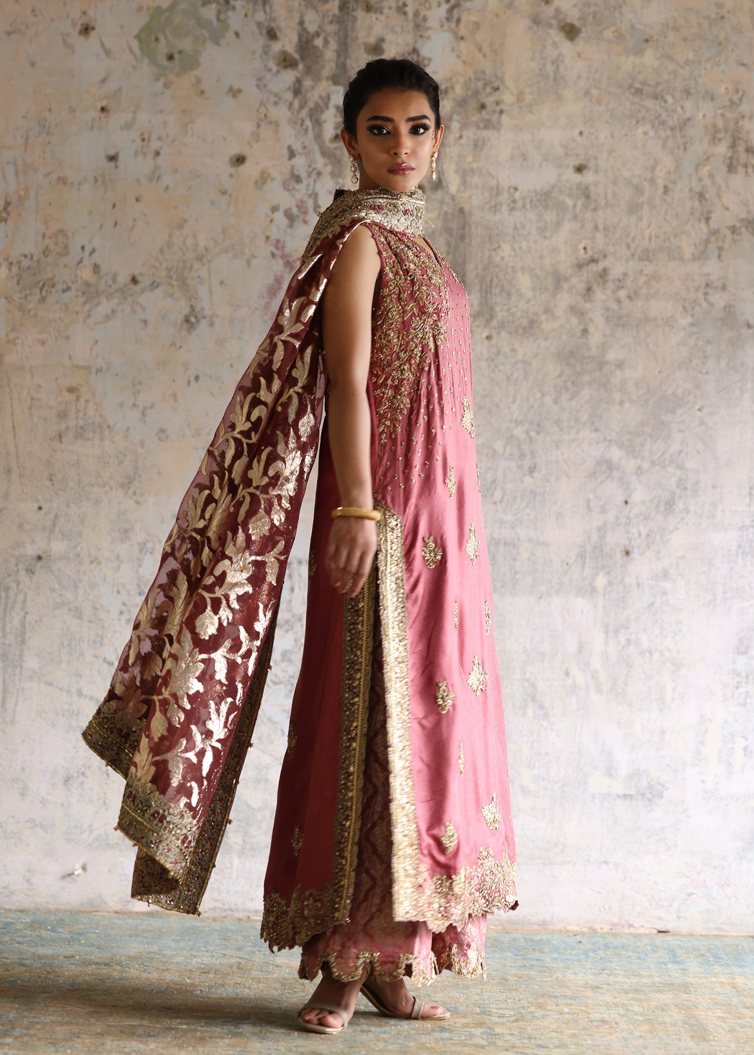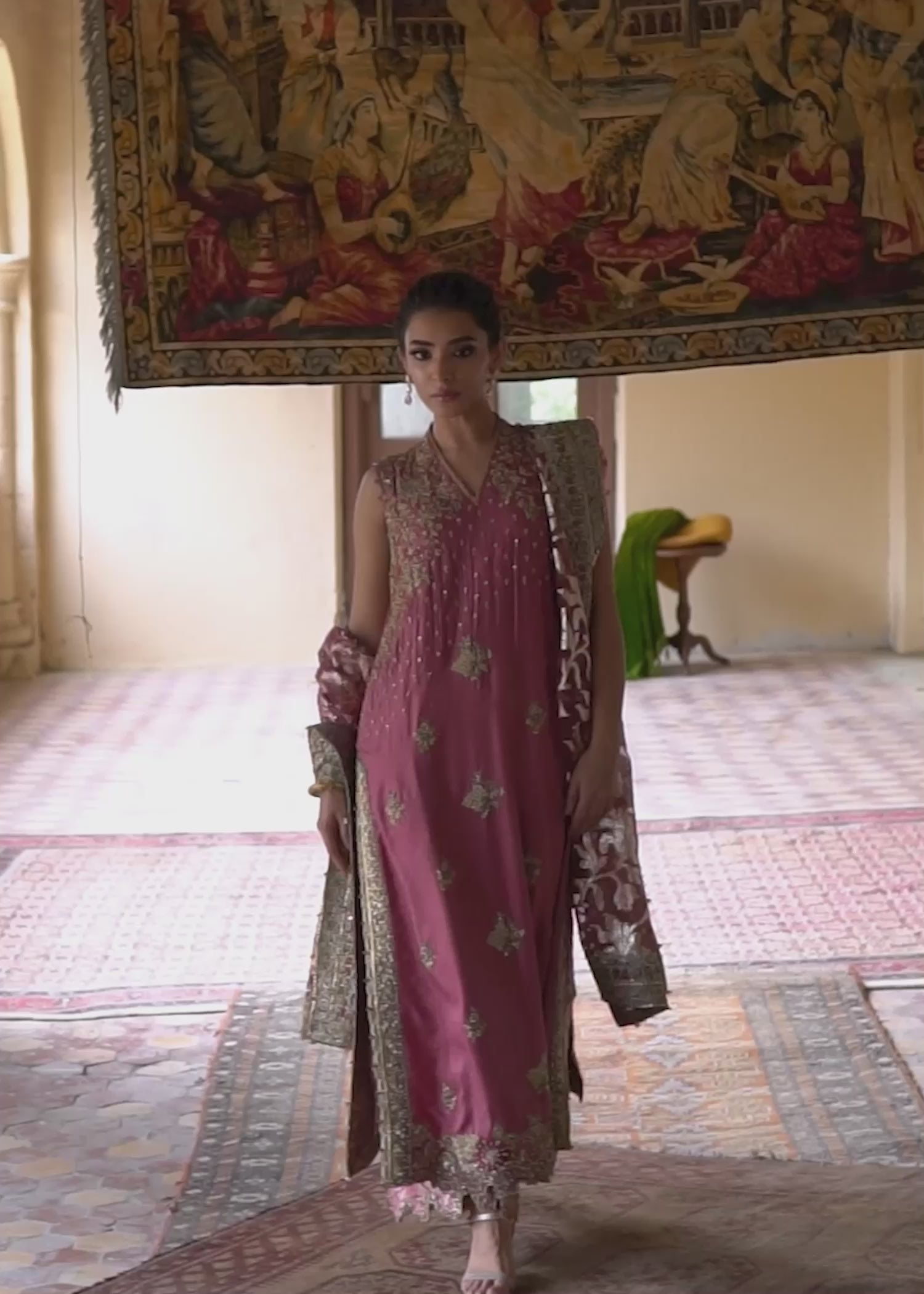 This elegant dress in warm pink pure katan silk showcases timeless grace with its sophisticated, straight-cut shirt and understated silhouette. The heavy gold handwork creates a shimmering, intricate pattern, while the detailed back design and stunning neckline add allure. The pure brocade pants feature delicate handwork, ensuring a seamless blend of texture and design throughout the ensemble. Adorned with embossed organza and meticulously patched at each side, this dupatta exudes opulence with its lavish handwork, transforming it into a statement piece of unparalleled elegance.