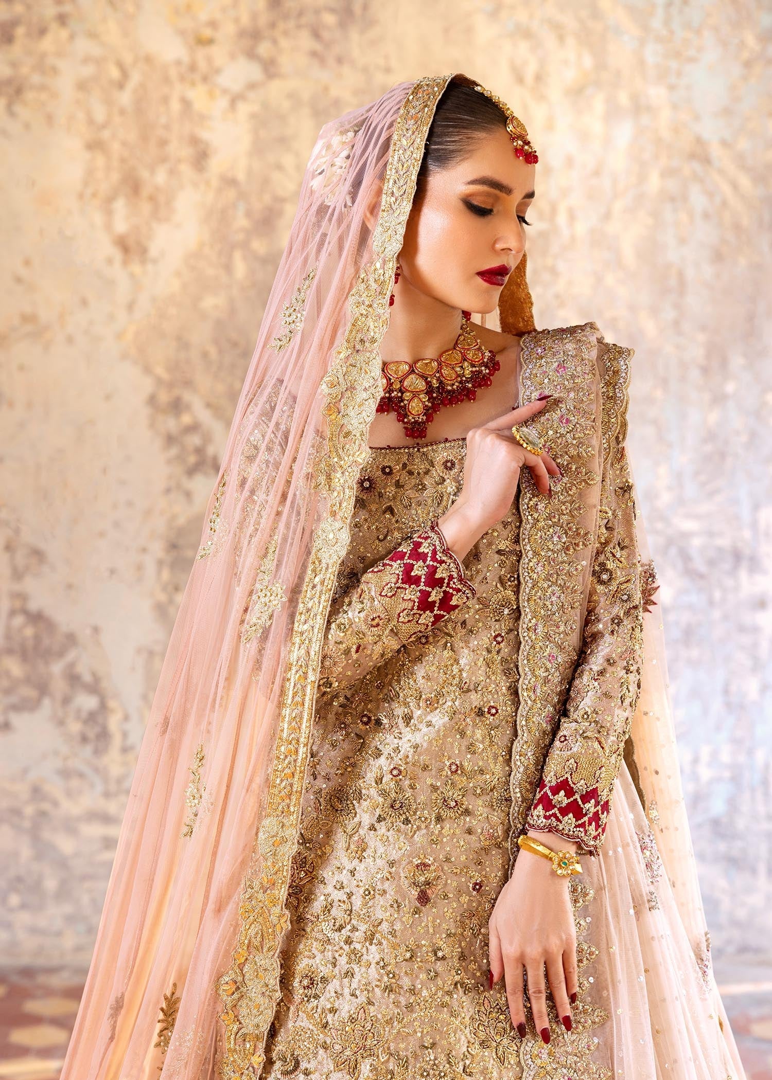 Color: Veil: Flamingo PinkShirt: Evening SandLehnga: Bronze GoldDupatta: Flamingo Pink Includes: Shirt: Pure French Lame Fabric Lehnga: Pure Tissue Mysore Dupatta And Veil: Pure French Net Product Descriptions: Make a...