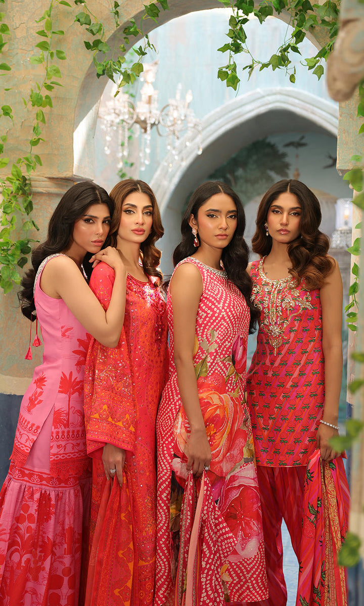 A fuchsia pink short shirt with a glitzy neckline, paired with shalwar and printed dupatta.