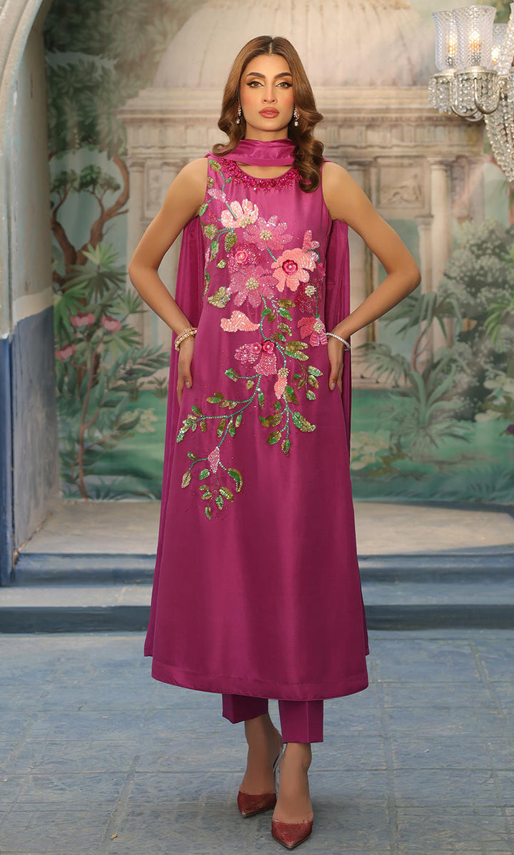 Detailed handcrafted sequin florals in delightful shades of pink, along with a bedazzled crystal neckline.