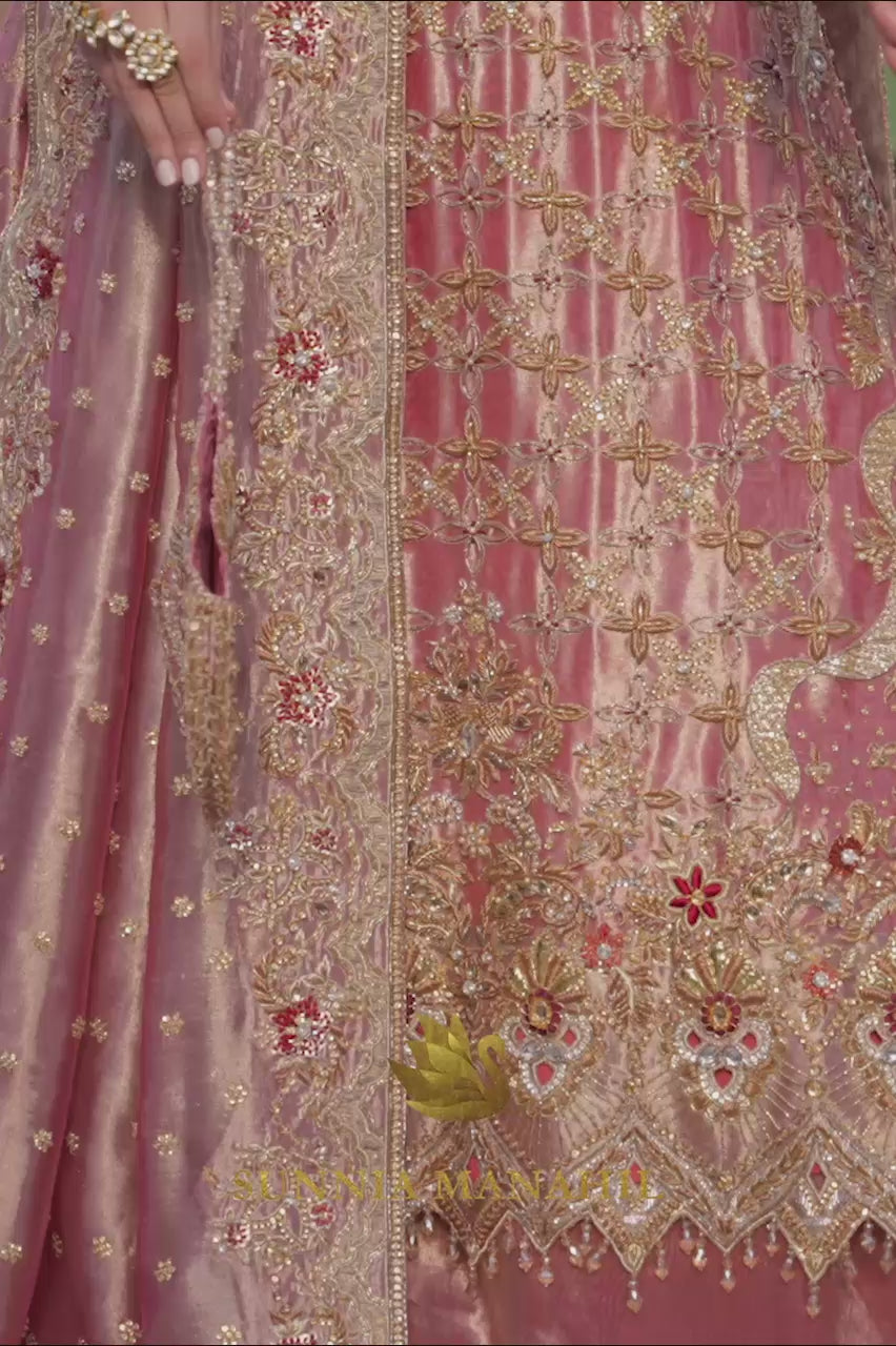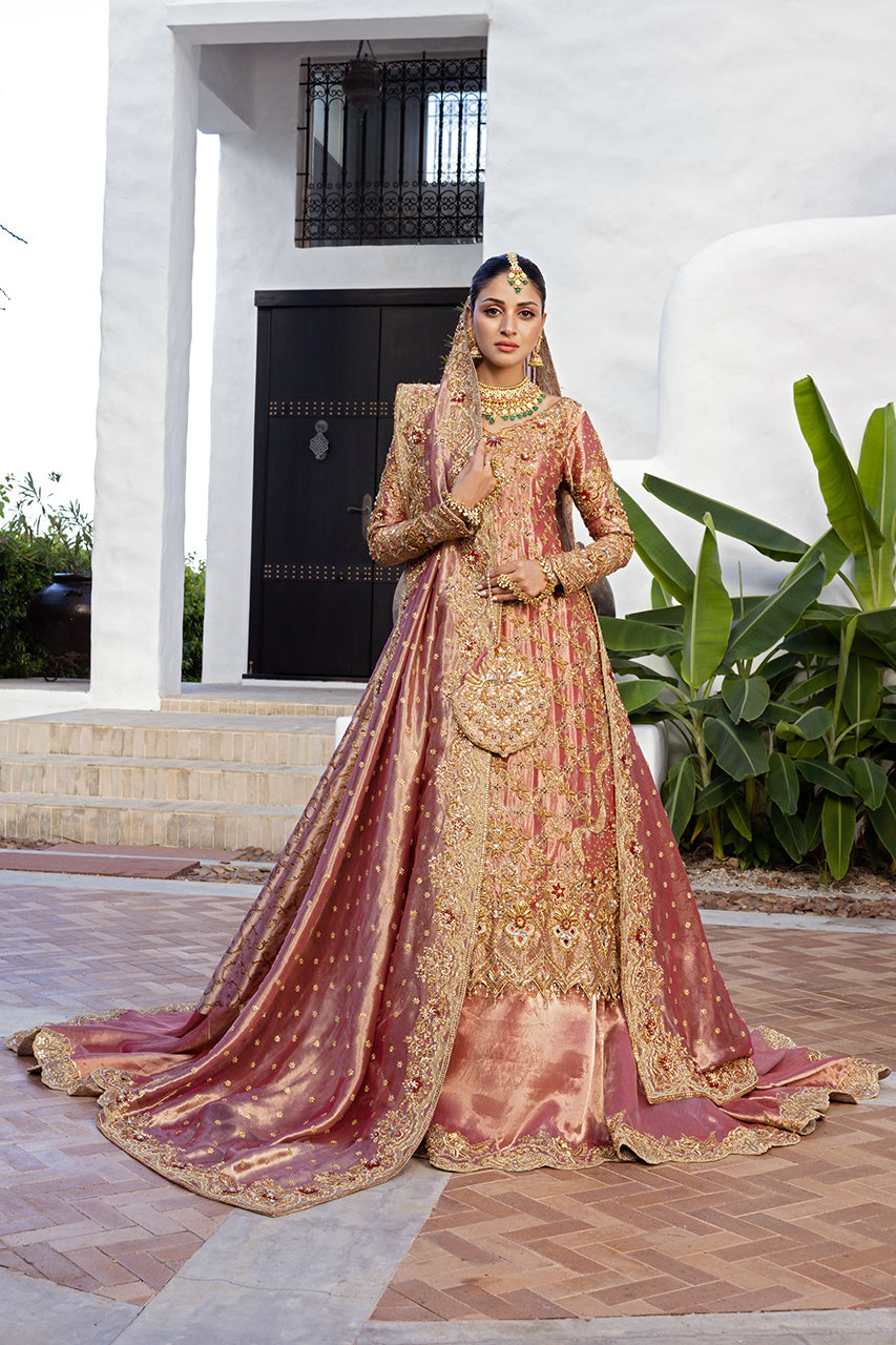 Rose gold is the new trend for brides, offering a unique touch to their special day. The outfit showcases a beautiful rose gold lama embroidered shirt with intricate cutwork on the border. This is paired with a long-tailed rose gold lama lehnga, creating a striking style. Completing the look is a matching rose gold lama heavily embroidered dupatta, ensuring the bride shines on her big day.