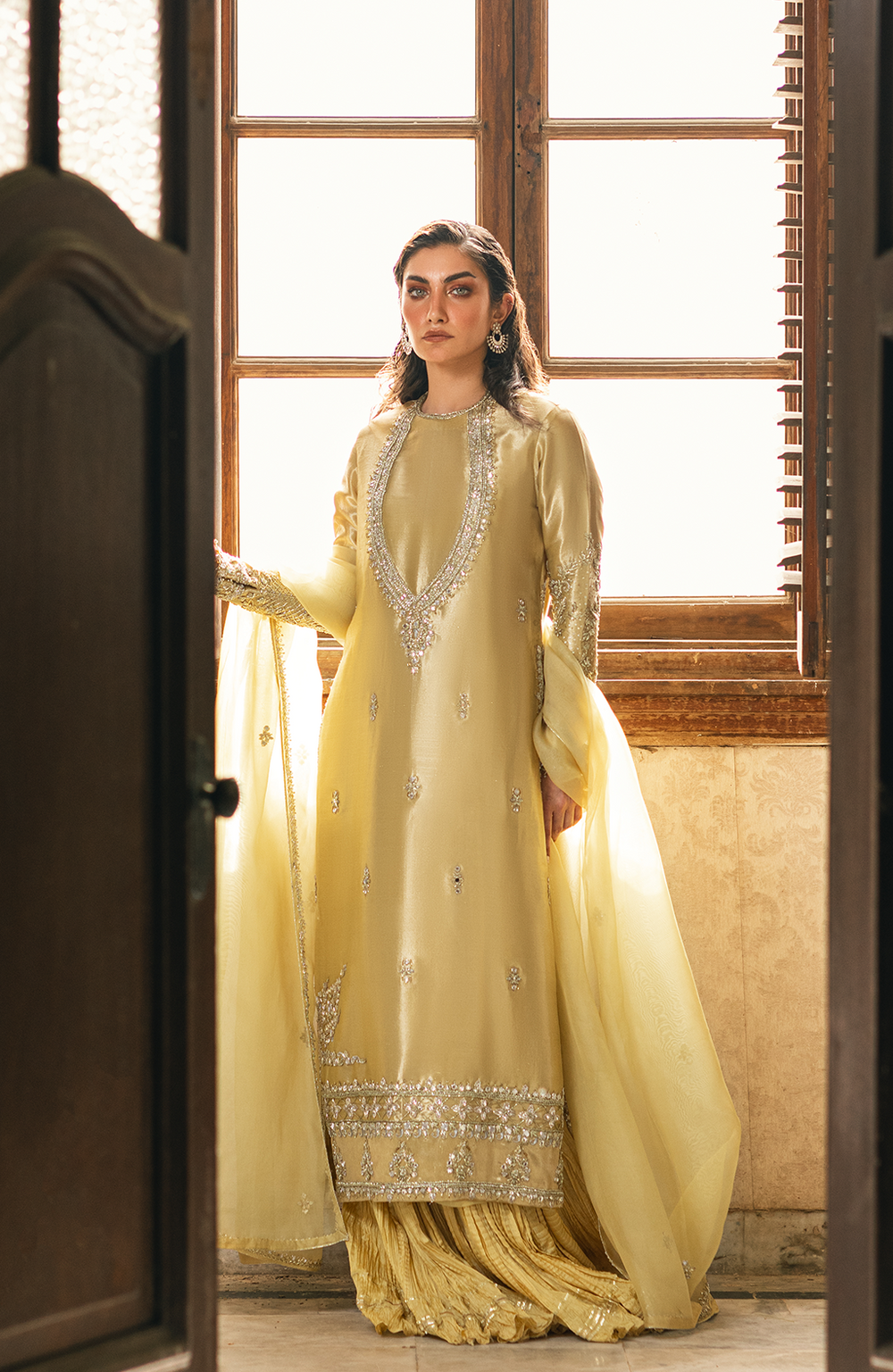 Incorporated with crystal and Swarovski, Rowinah heavily embellished on the kameez and dupatta. Perfect for your day-to-night mehindi events, you can spice up your wedding collection with our aurora Rowinah outfit.