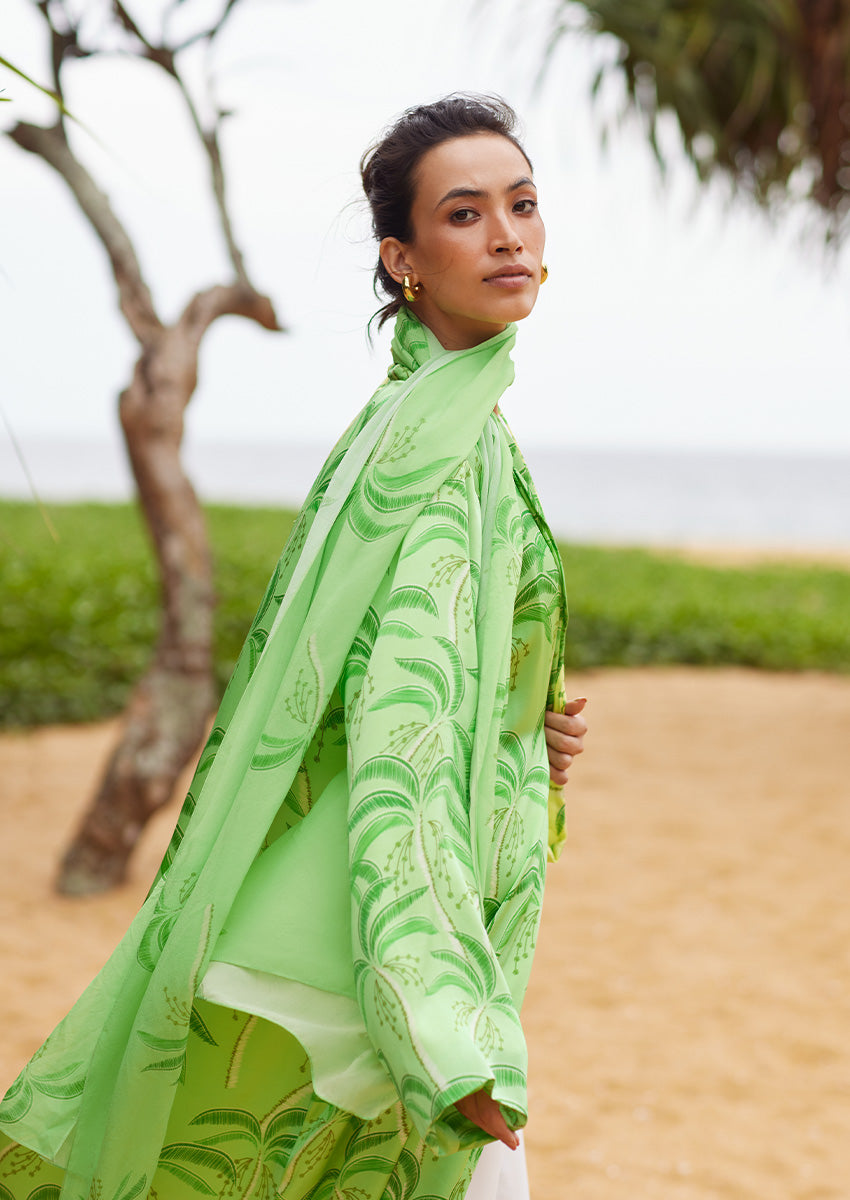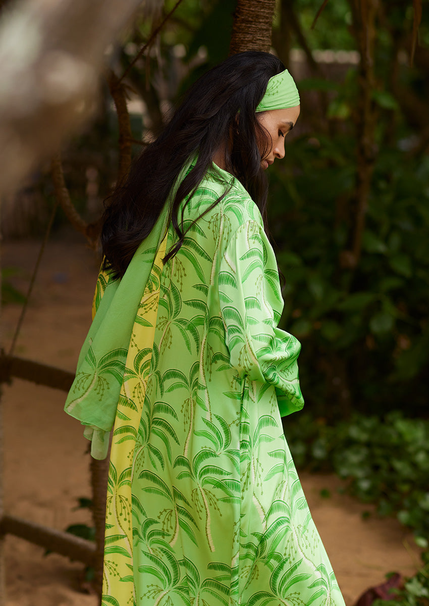 Make a bold statement this Ramadan with our edgy monochromatic citrus hued abaya, designed to redefine elegance. Its front open, flowing silhouette effortlessly commands attention, while a tropical assortment of sketched palm trees gracefully adorns its length, enhancing the fluidity of the drape.