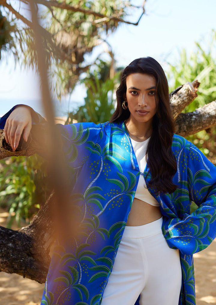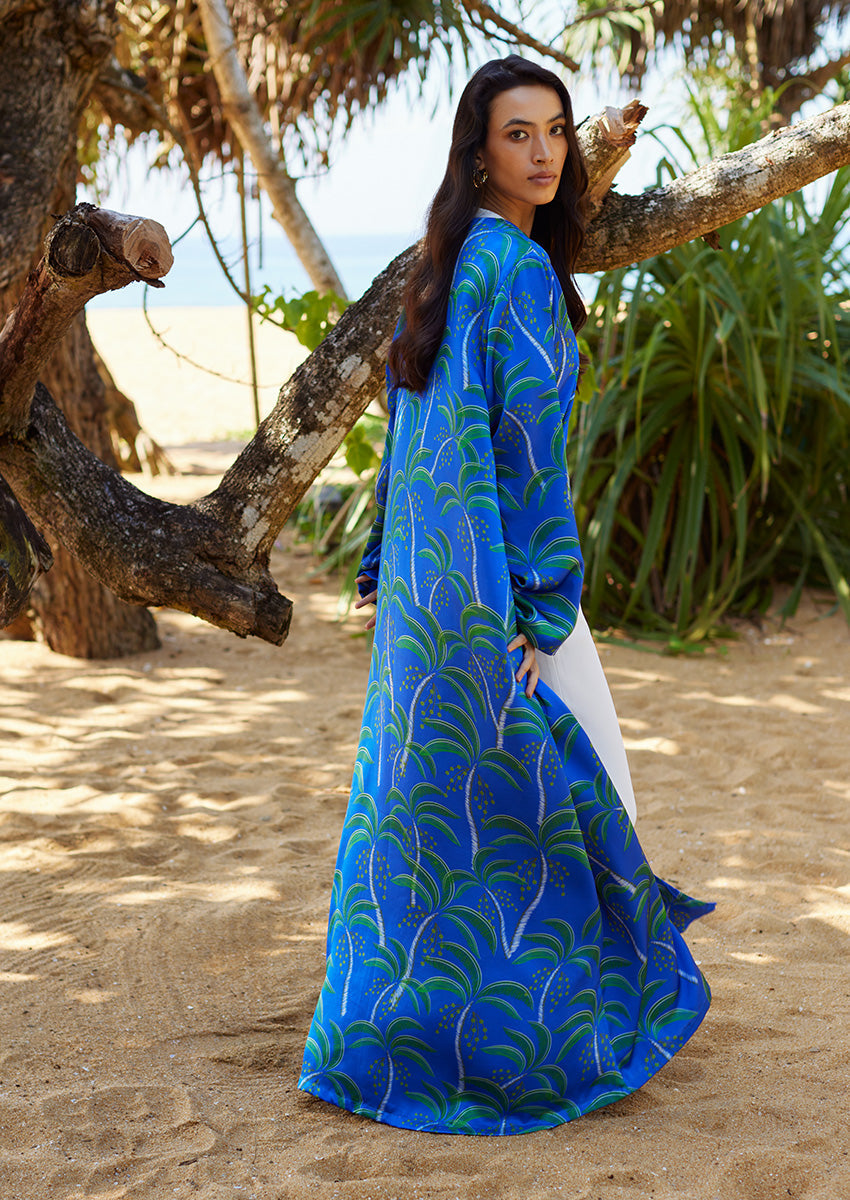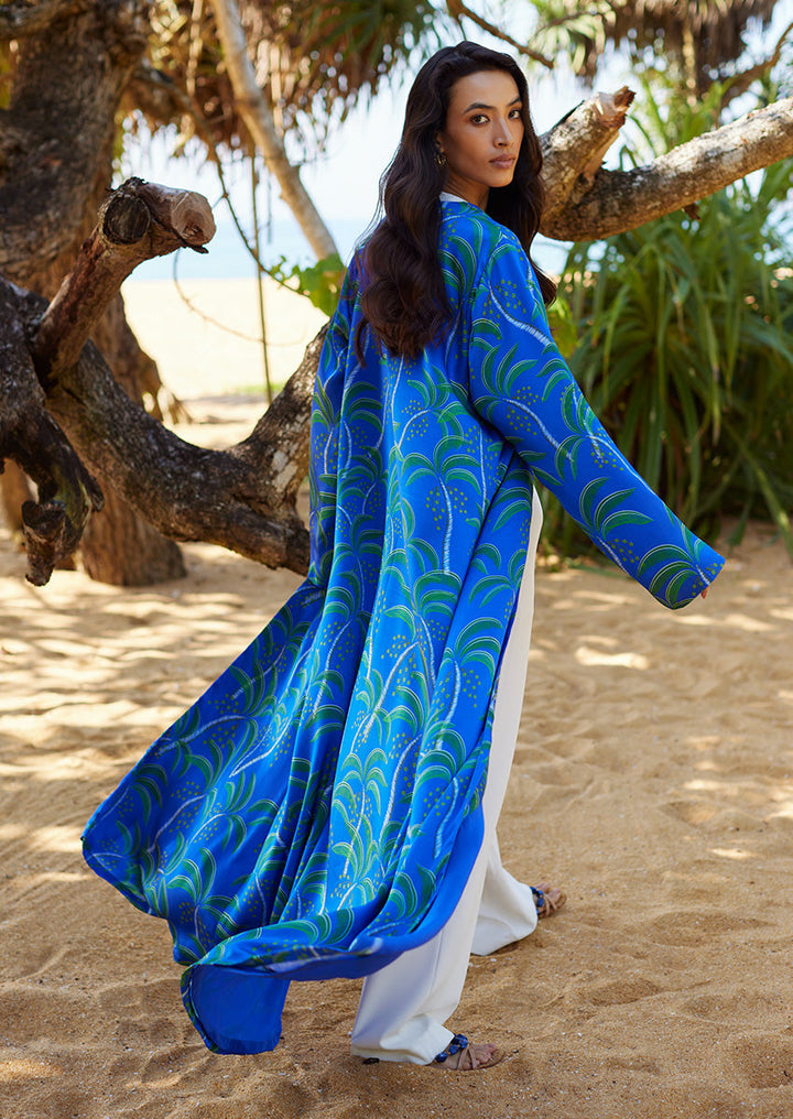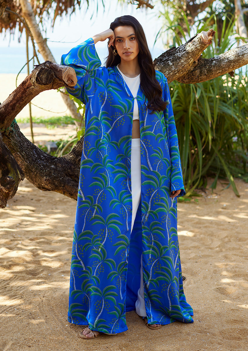 Make a bold statement this Ramadan with our edgy monochromatic azure hued abaya, designed to redefine elegance. Its front open, flowing silhouette effortlessly commands attention, while a tropical assortment of sketched palm trees gracefully adorns its length, enhancing the fluidity of the drape.