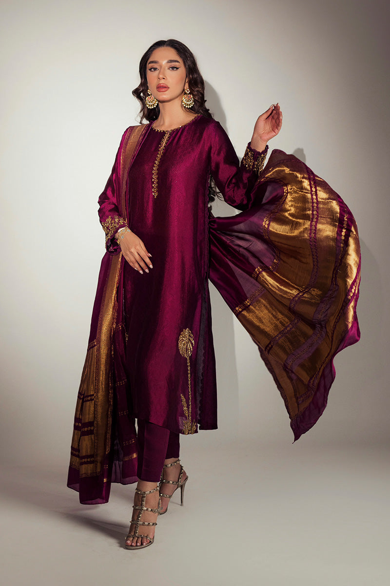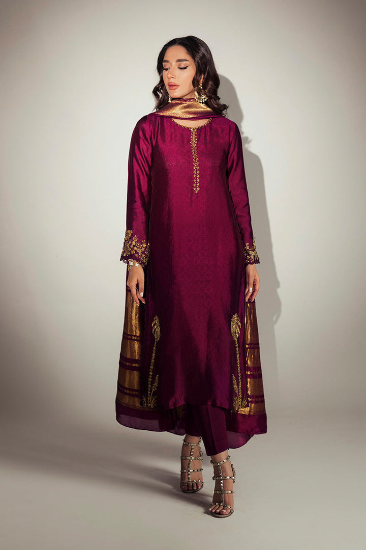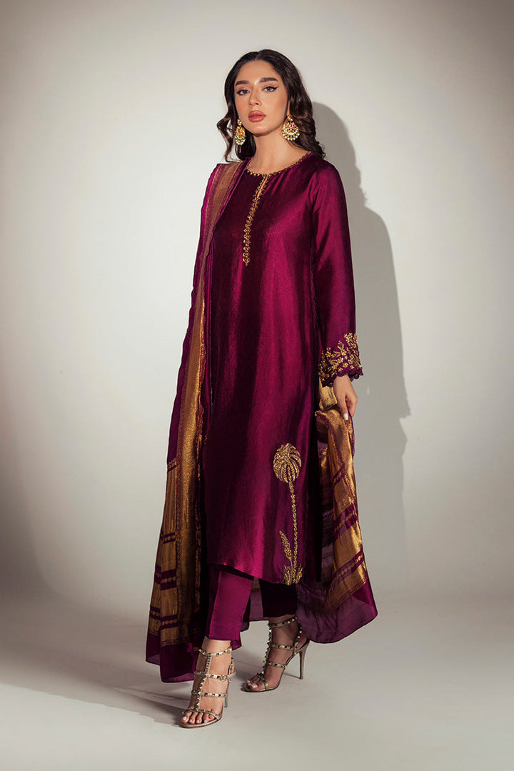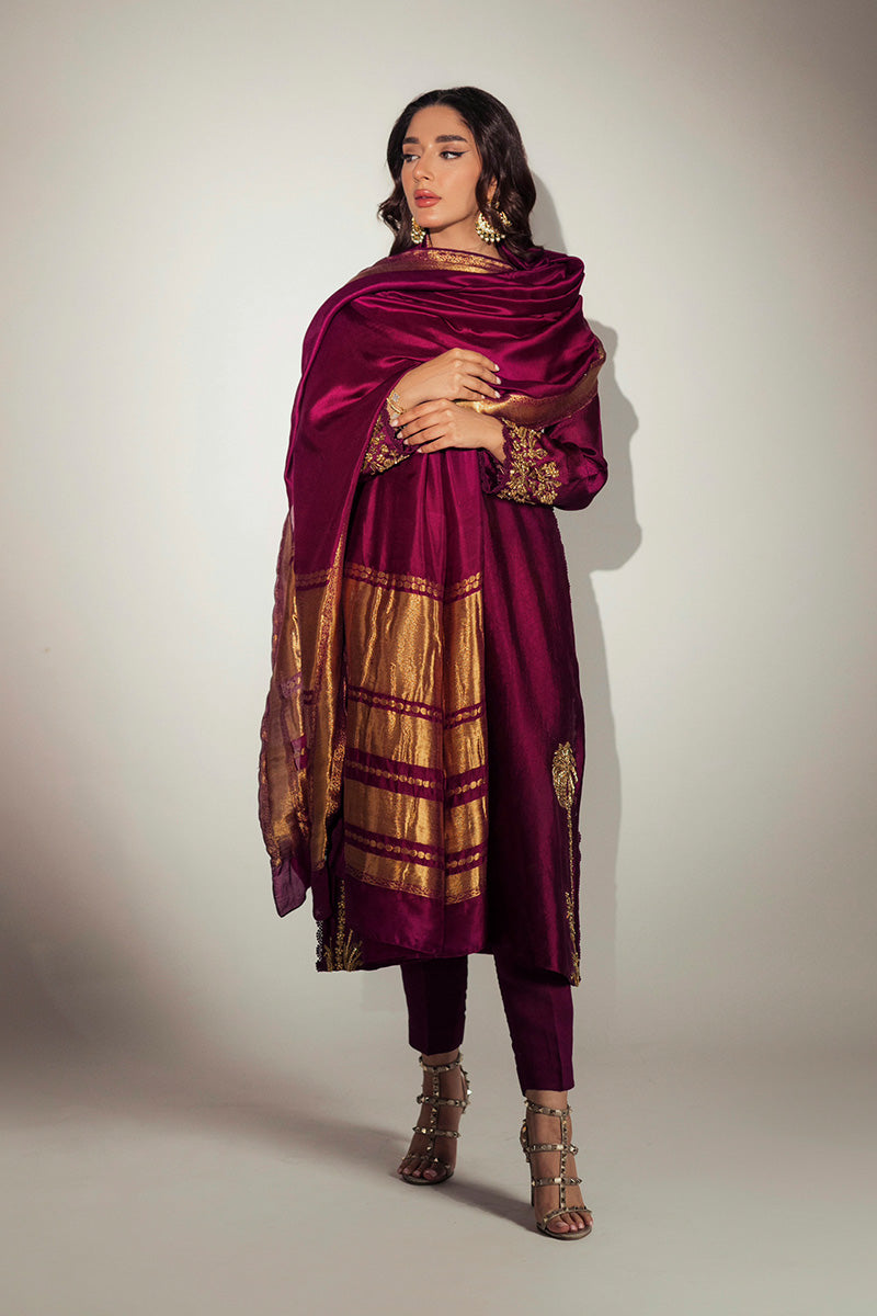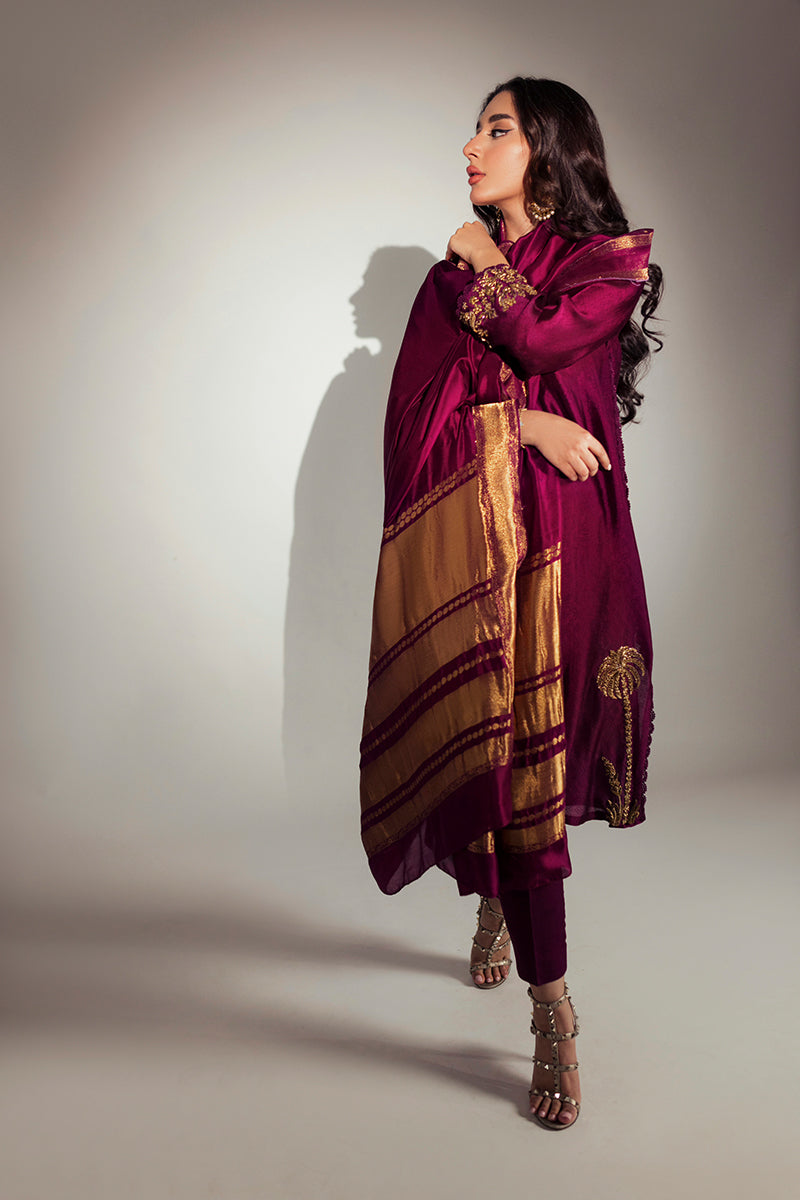 Feel impeccably dressed in this embossed silk outfit. Delicate gold embroidery outline the neckline and sleeves of the outfit with brilliant gold palm tree embroidered by the slits of the kameez. The outfit is completed with a gold jamawar dupatta.