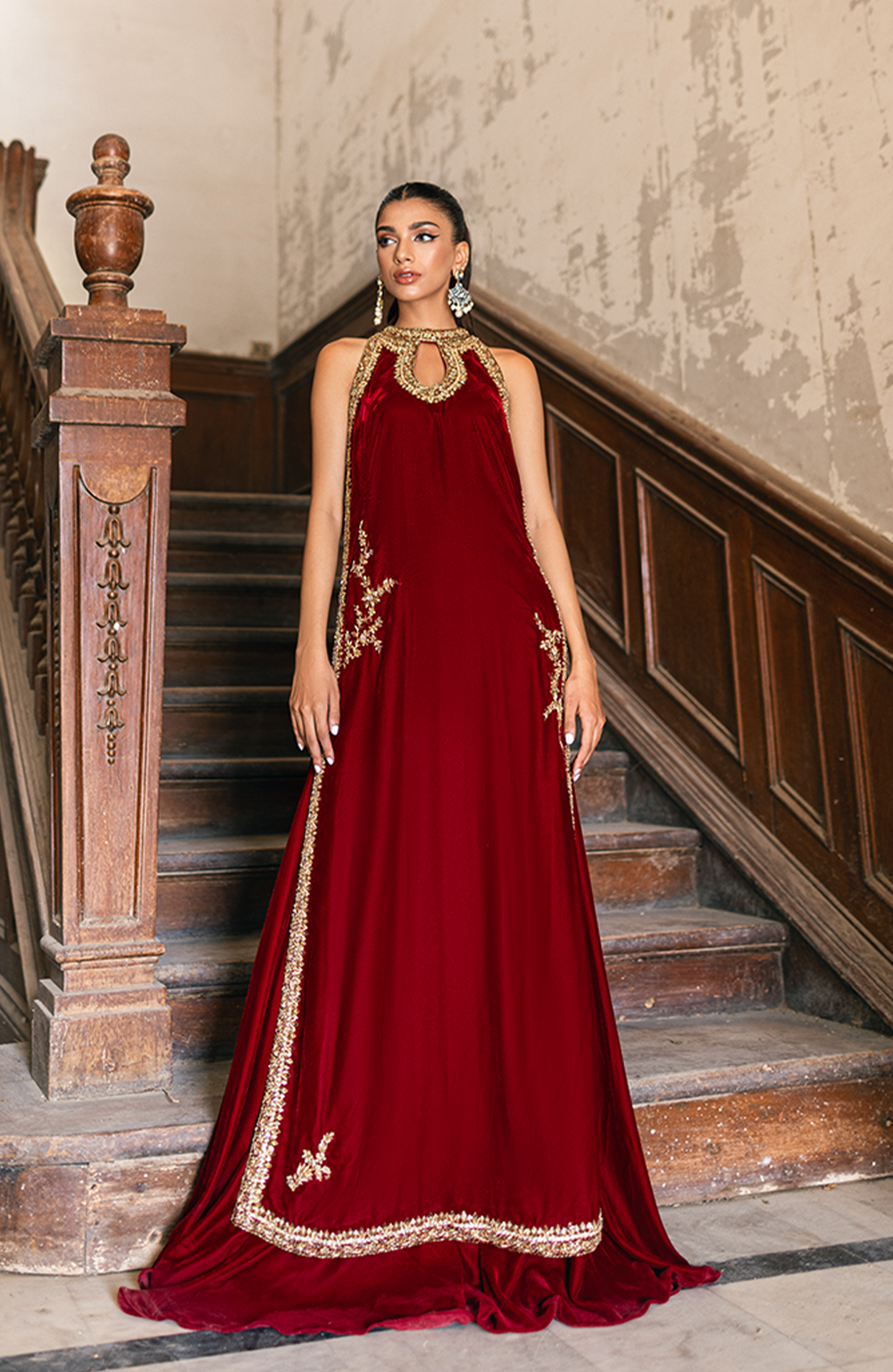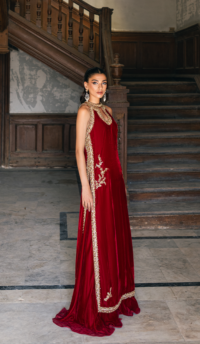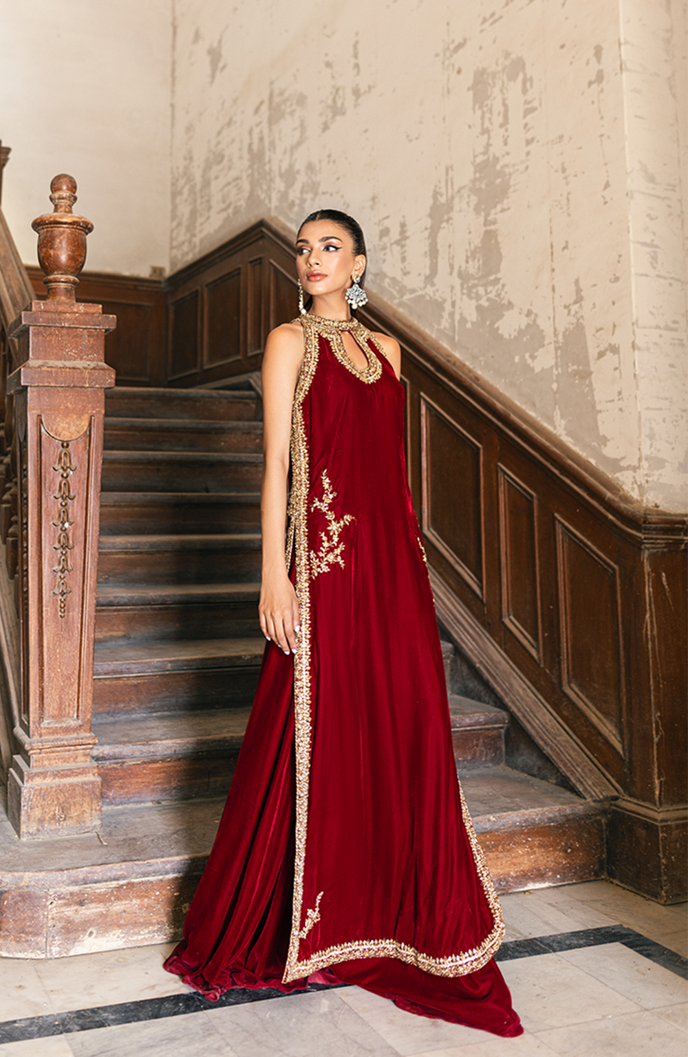 Extracted from deep scarlet velvet for winter festivities, the Ruhi set resonates with modern-day women with their traditions. Our artisans have delicately incorporated mixed embellishments for bunches at the front, and along the collar and neckline that elaborate till the sides and damaan of the kameez. Ruhi is the perfect burst of contemporary and chic festive outfit that you can style on bridal showers and even for a sleek reception look.