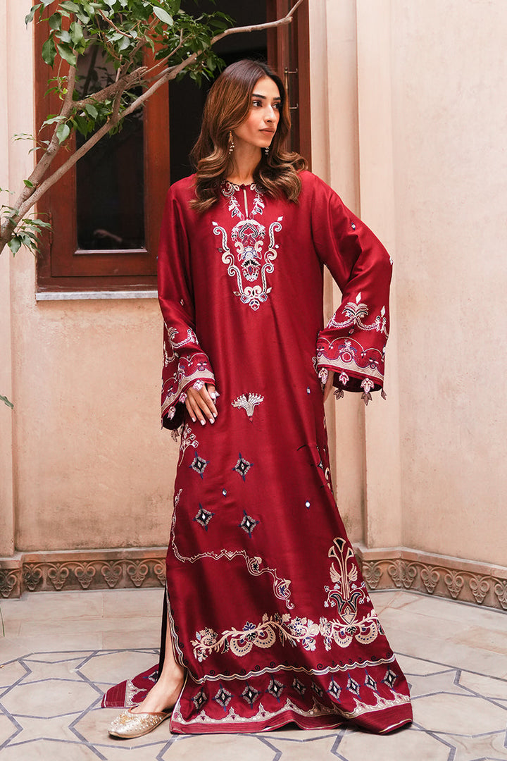 The Rukhsar kaftan is a graceful blend of traditional artistry and modern elegance, crafted from raw silk with intricate machine embroidery in resham, applique work, and ari embroidery. Sleeve hangings add a striking detail, while pleats and pintucks enhance the silhouette. The design is beautifully finished with delicate gotta, bringing a refined touch to the ensemble.