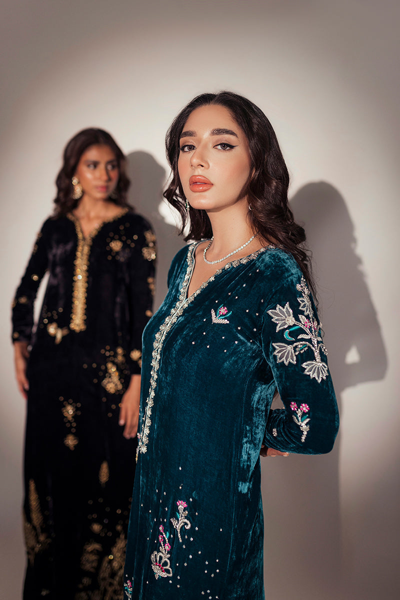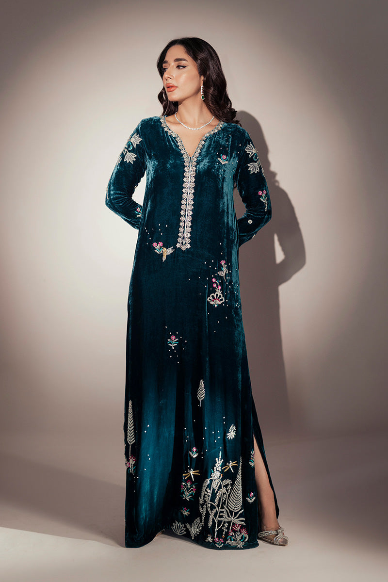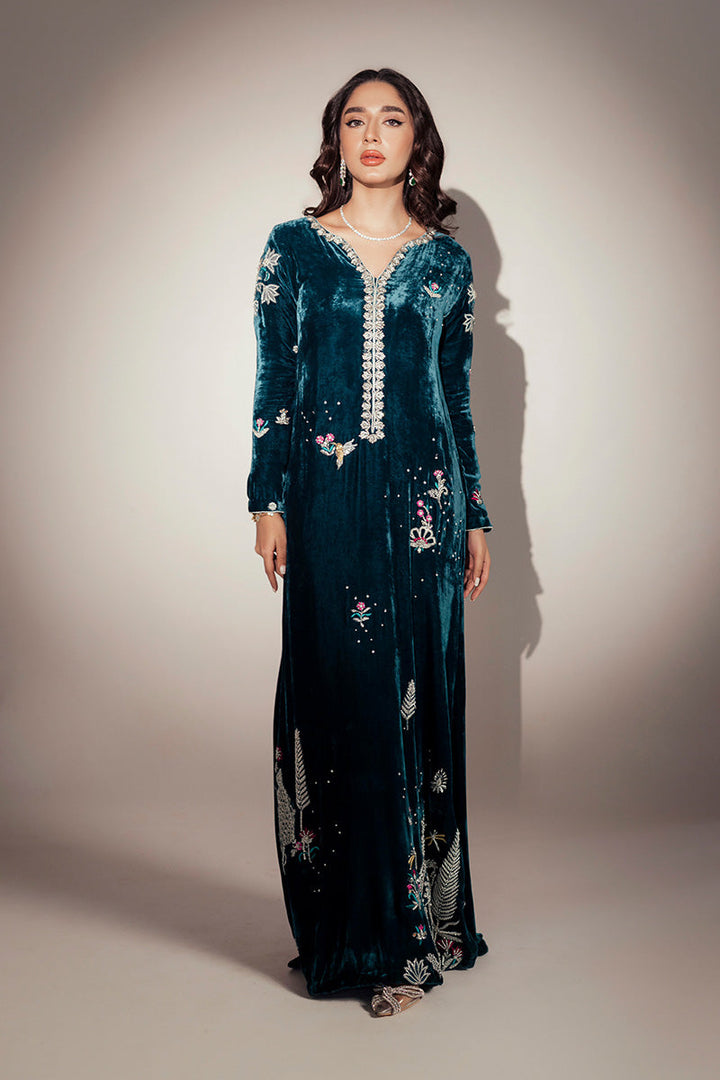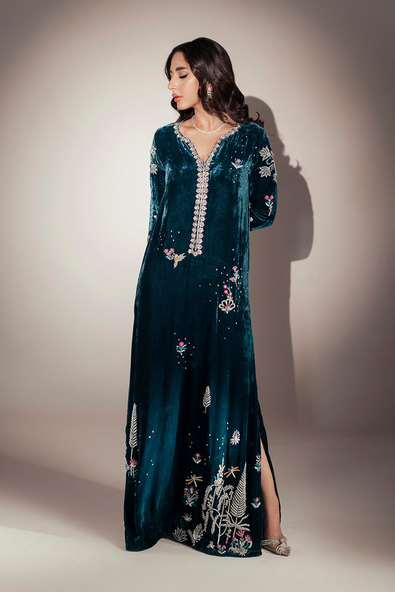 Feel like an absolutely queen in this kaftan. Decorated with gilded botanical embellishments througout the garment and neckline, this luxe velvet kaftan will make sure you're the best dressed guest...