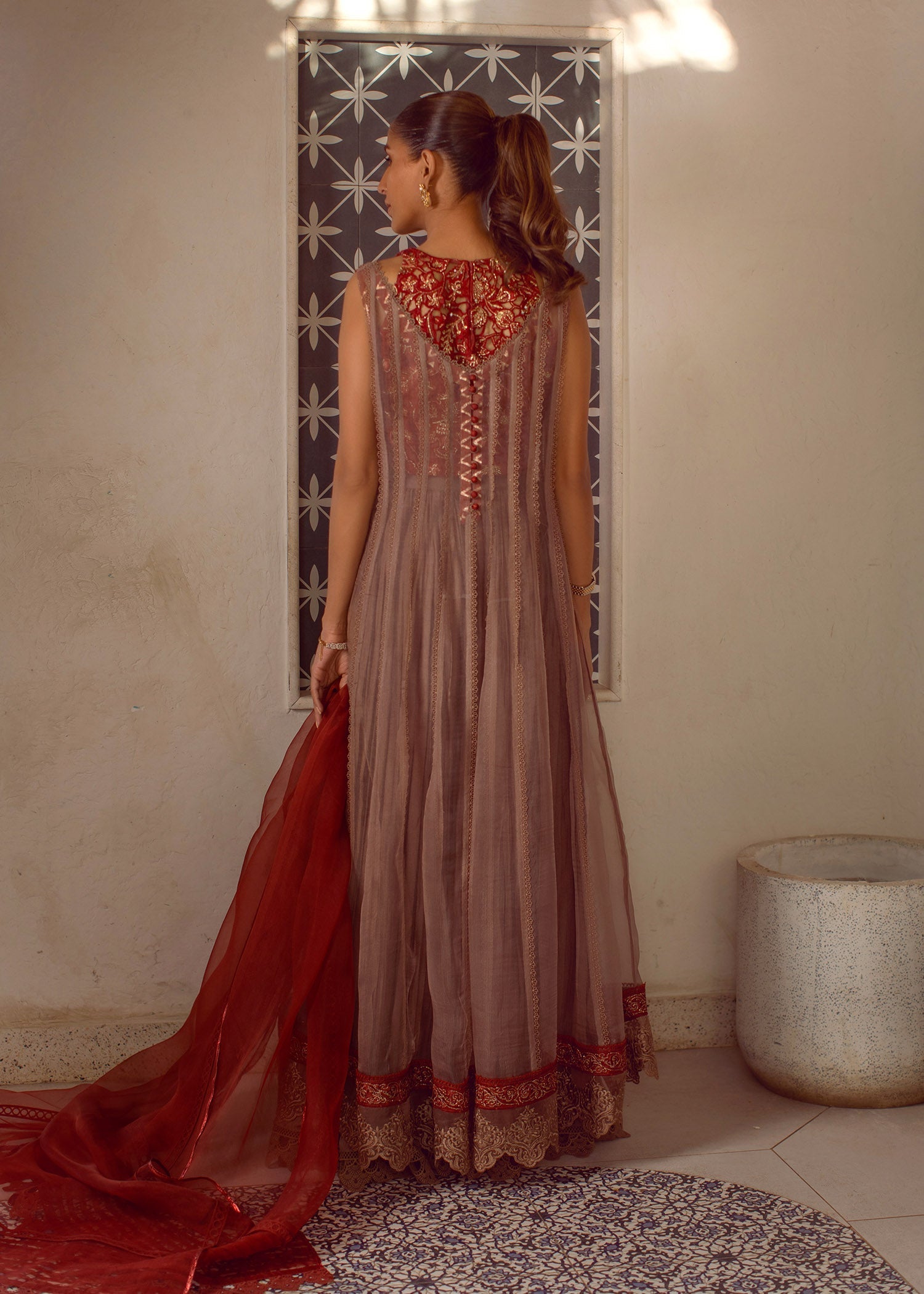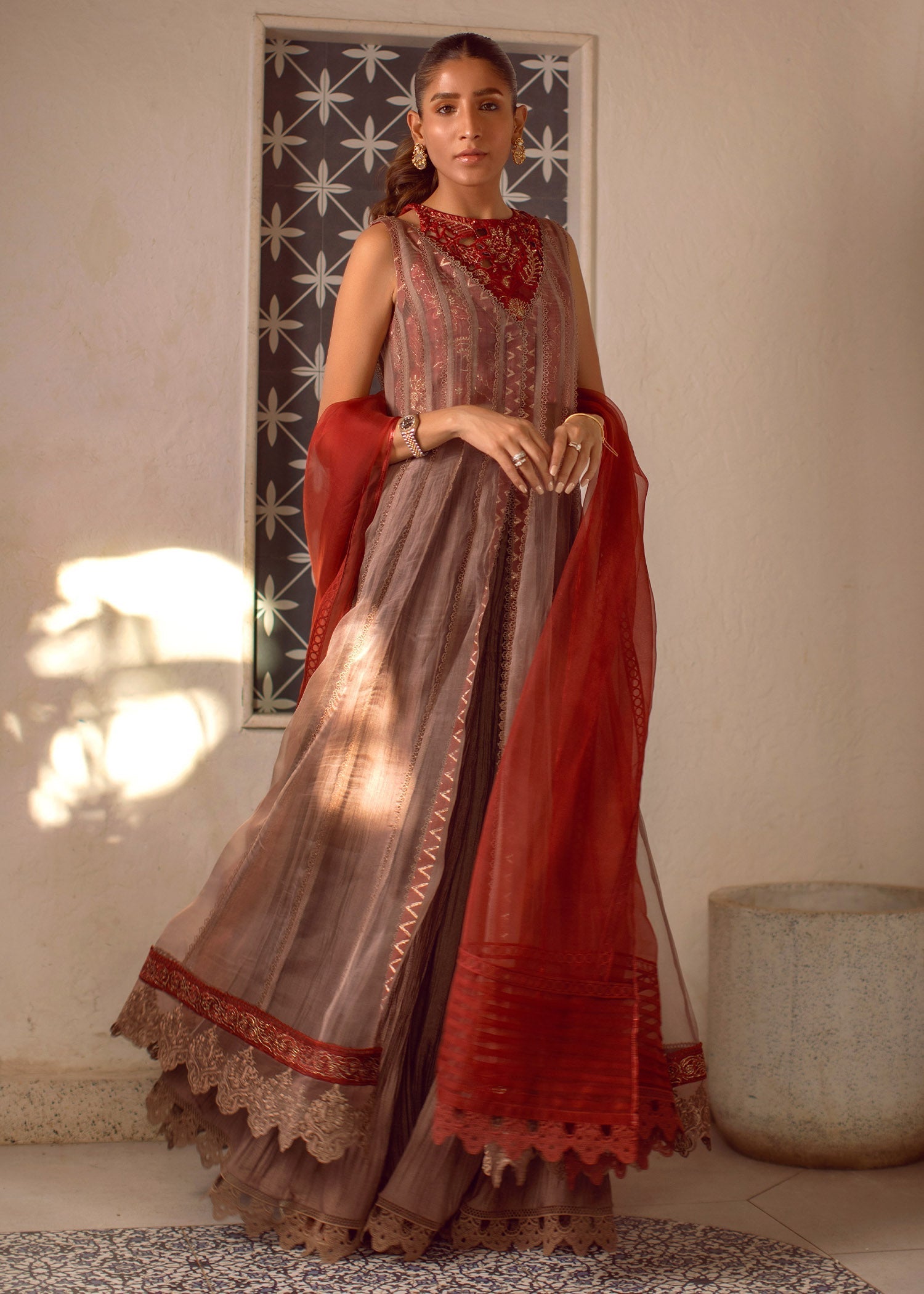 Color: Lavender and Taupe Description: This peshwas is a reminder of the luxury and glory of the Mughal Empire, adorned with refined work and eye catching sequins as well as...