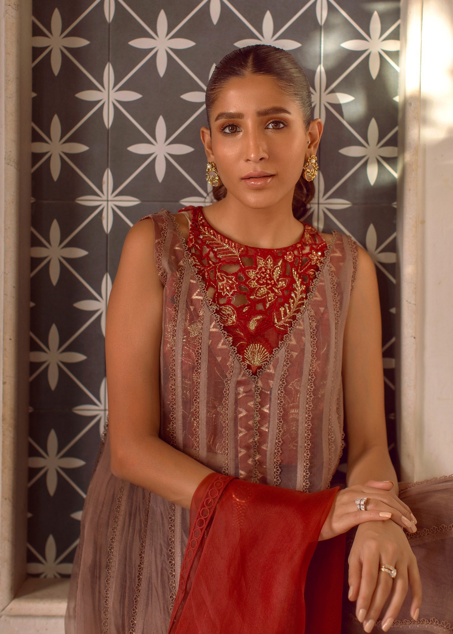 This peshwas is a reminder of the luxury and glory of the Mughal Empire, adorned with refined work and eye catching sequins as well as lavish embroidery work on the front and neckline. This outfit will elevate your beauty to rival the princesses of old. It is paired with palazzos and pure organza dupatta to finish the look.