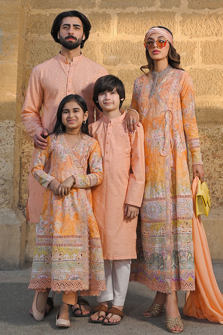 Embrace the ethereal beauty in our signature angharkha look, adorned with delicate Dori and intricate embroidery borders. The ensemble is completed with tailored pants and a medium silk dyed dupatta. A timeless statement for the modern mom, radiating grace in every shade.