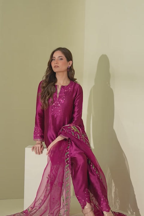 Chic, bold and iconic- this short shirt with a khari shalwar wlll be an outfit you will wear again and again. The shirt features self embroidery on the neckline, sleeves and pants with contrasting embroidery on the dupatta.