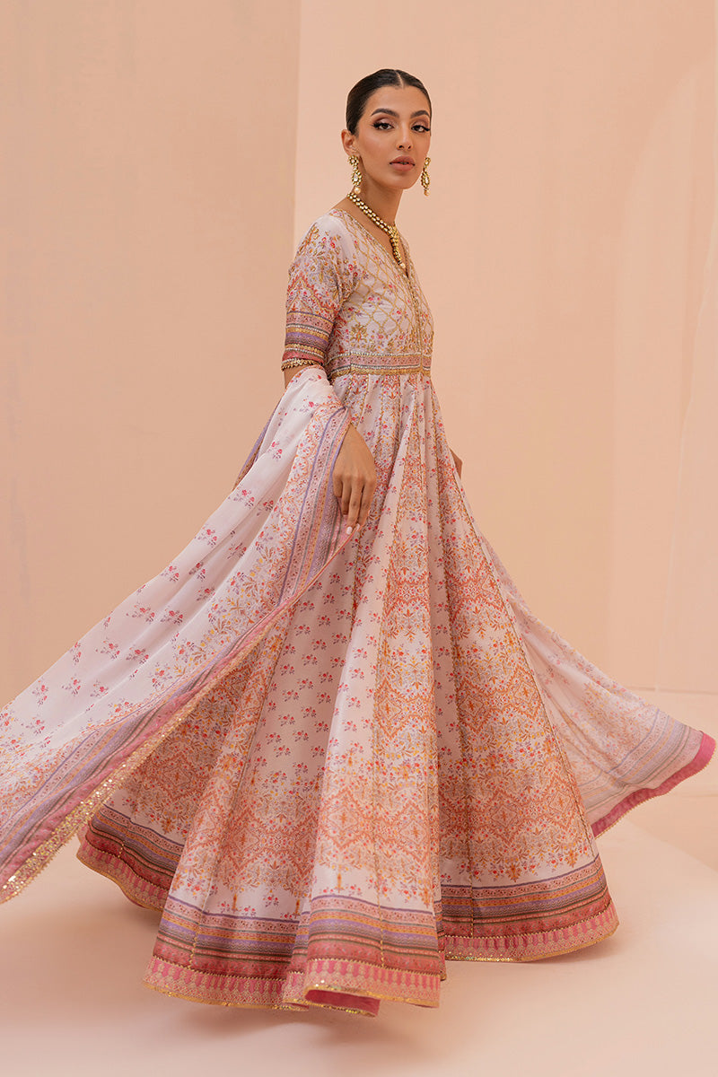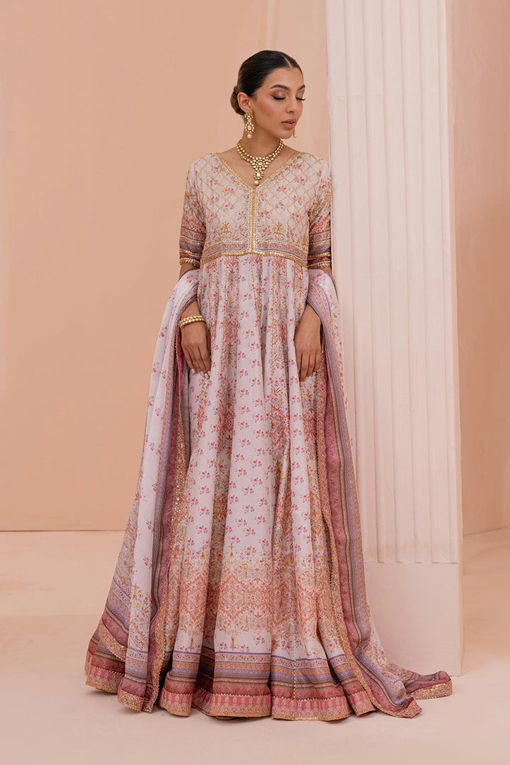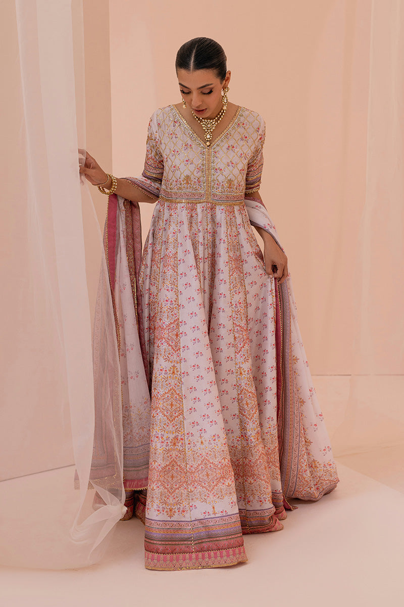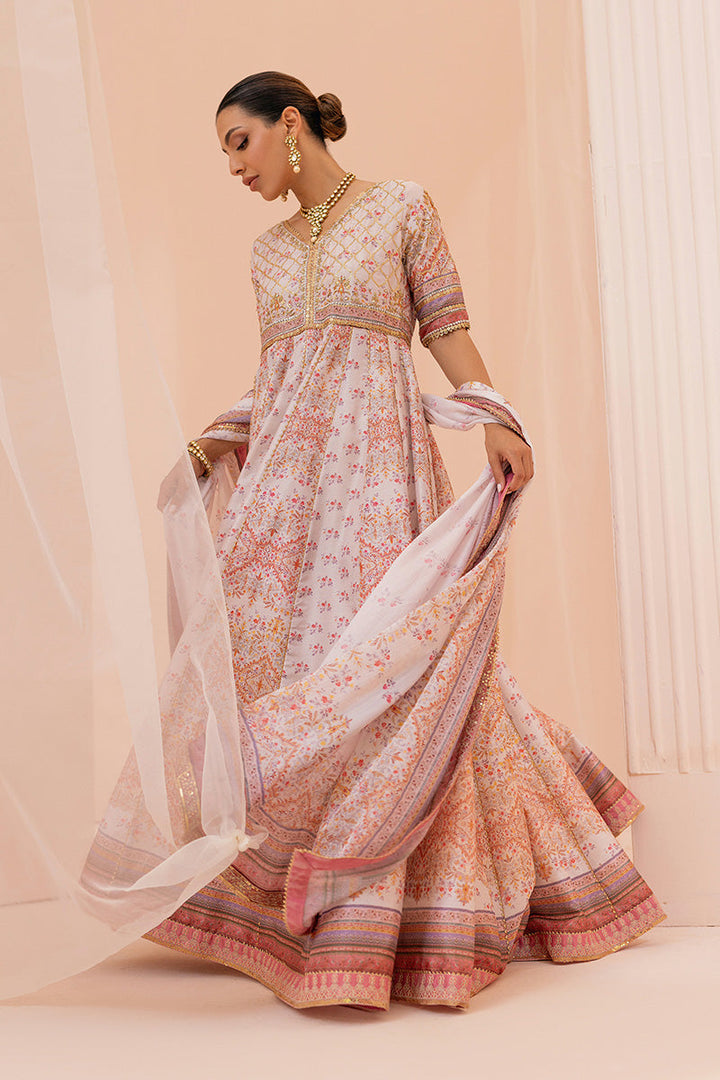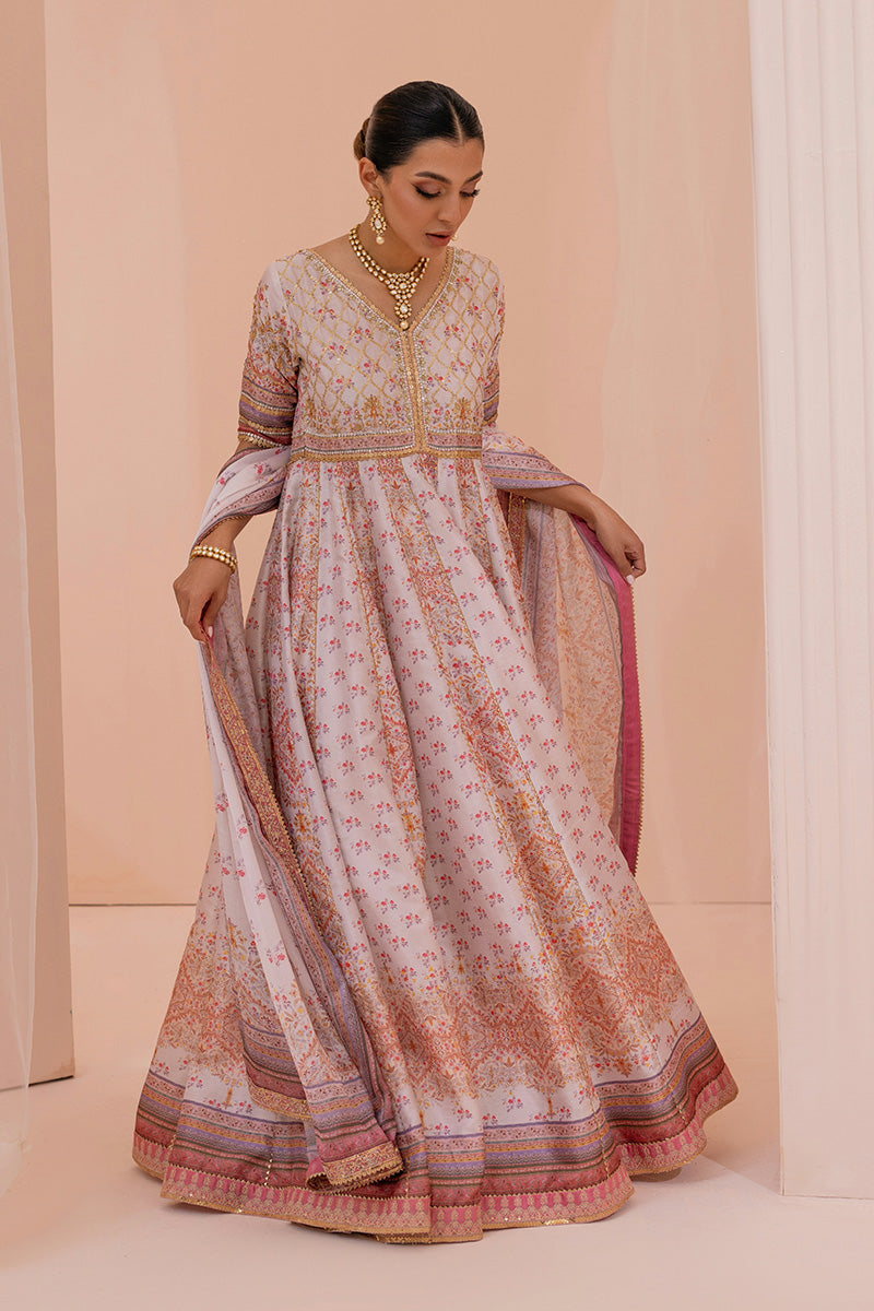 Classic and elegant, this signature Mina Hasan printed pishwas is striking and beautiful with a zardozi hand embellished neckline and sleeves and embroidered border on the flare and dupatta. The outfit is completed with an organza dupatta.The outfit includes a dupatta, pishwas and pants.