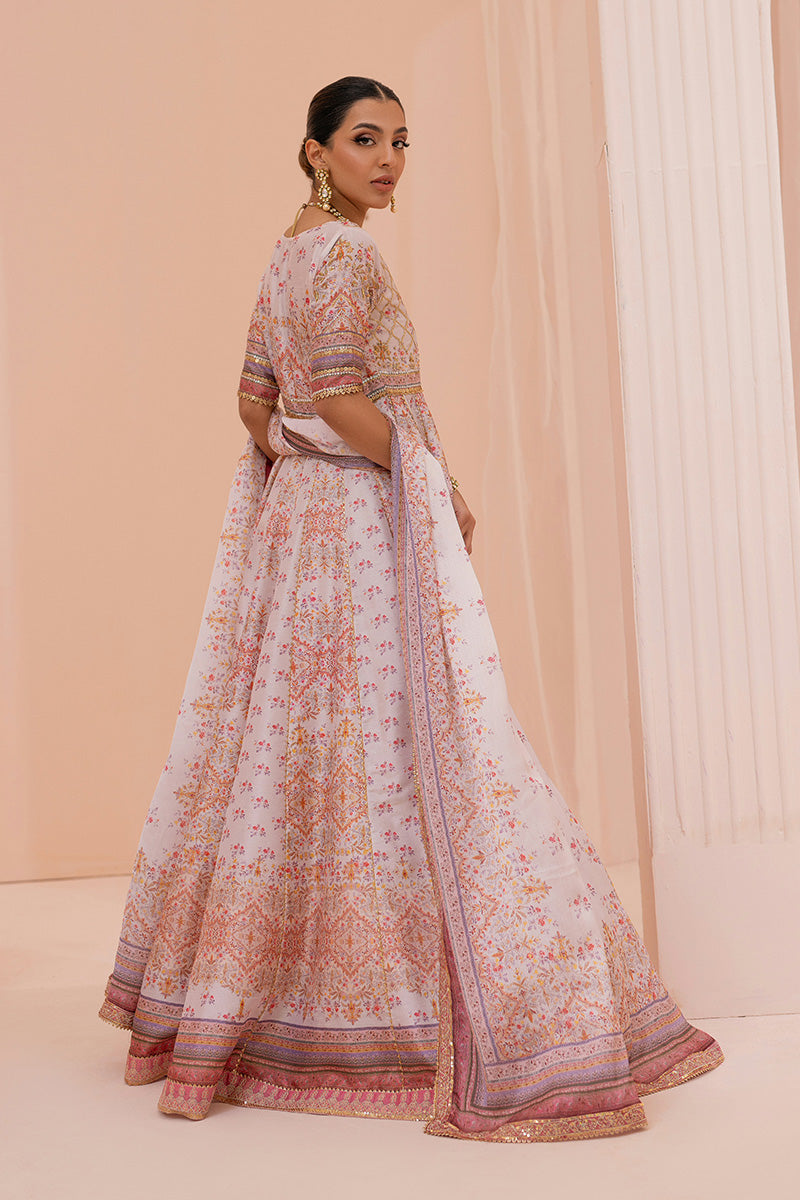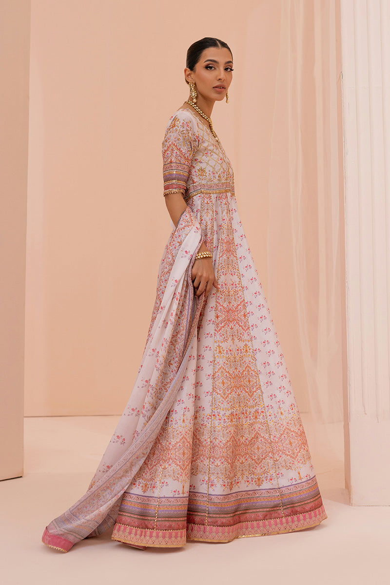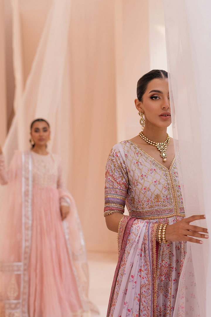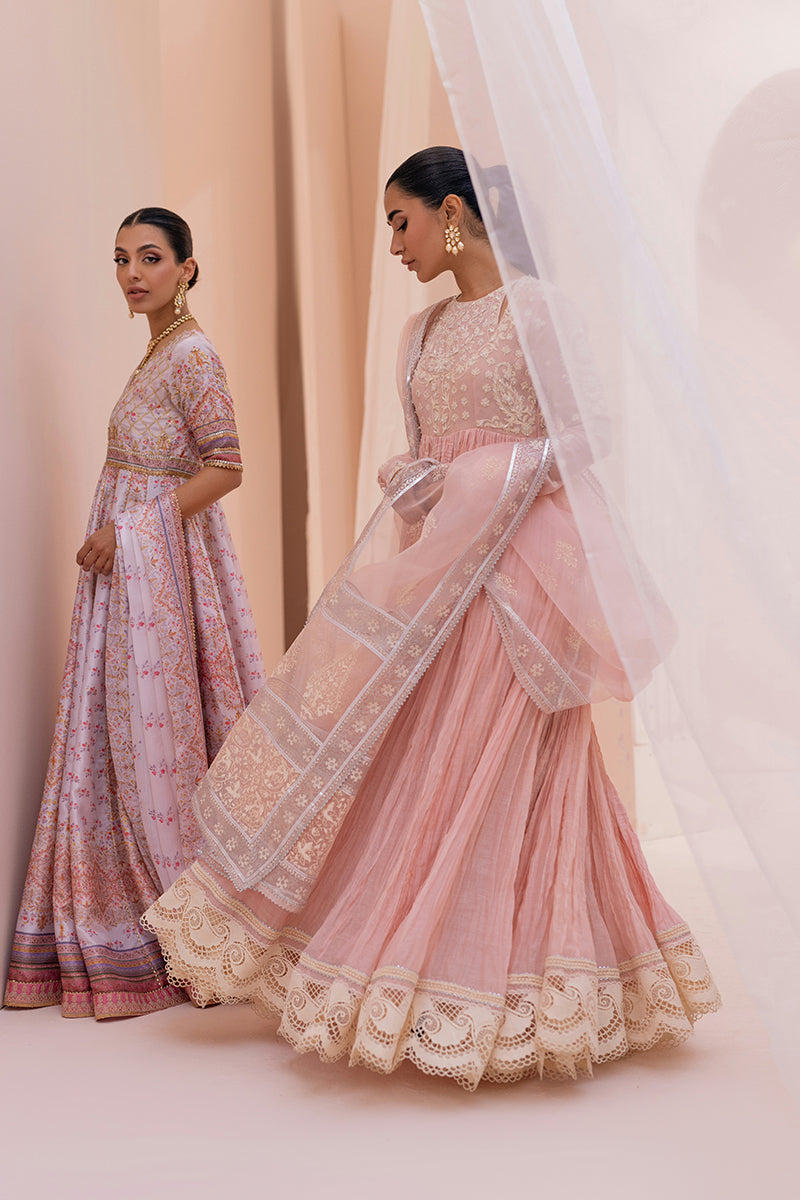 Classic and elegant, this signature Mina Hasan printed pishwas is striking and beautiful with a zardozi hand embellished neckline and sleeves and embroidered border on the flare and dupatta. The outfit is completed with an organza dupatta.The outfit includes a dupatta, pishwas and pants.