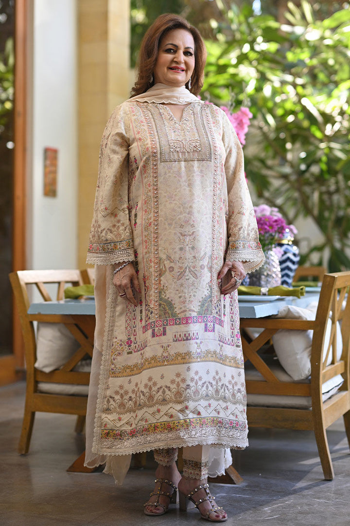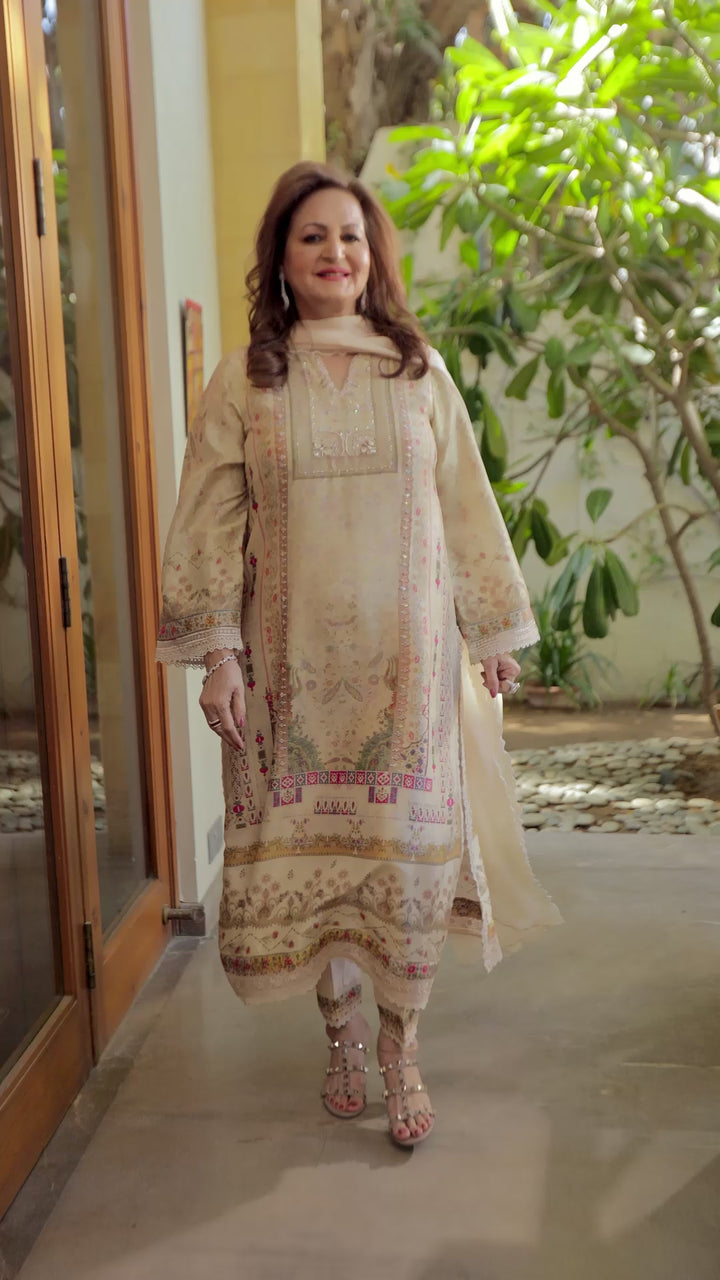An exquisite ensemble featuring a digitally printed A-line shirt with bell sleeves and a round neckline, paired with cigarette pants adorned with a printed border. The shirt is beautifully embellished with Gota, Moti, Cutdana, and Tiki stone work on the neckline and panels. The dupatta features a Minar-shaped applique on the pallu with digital print applique flowers.