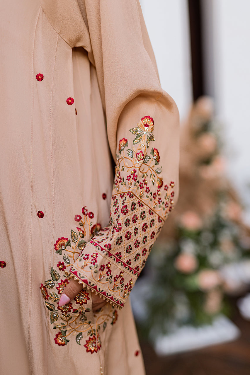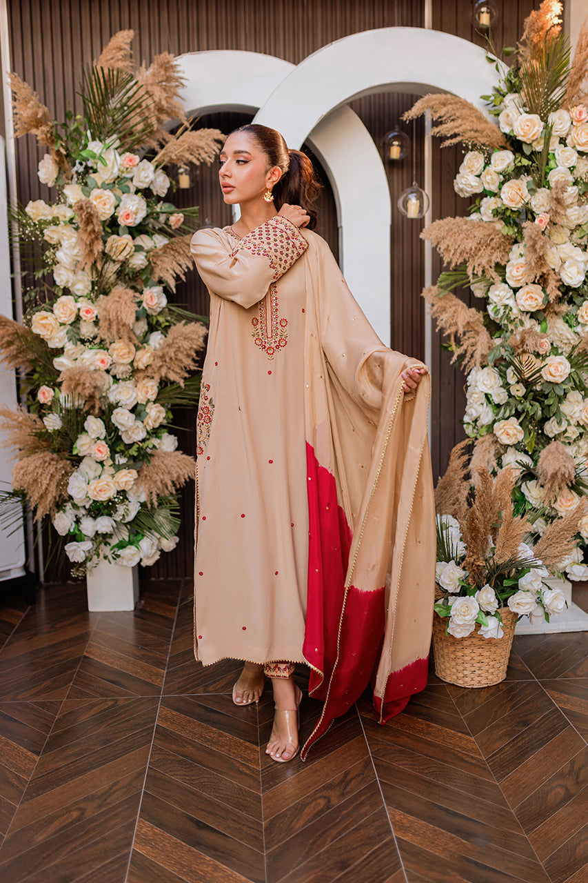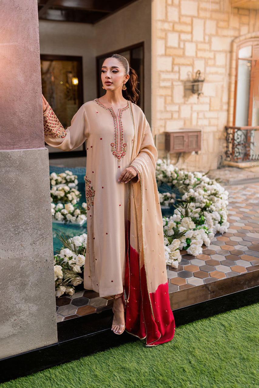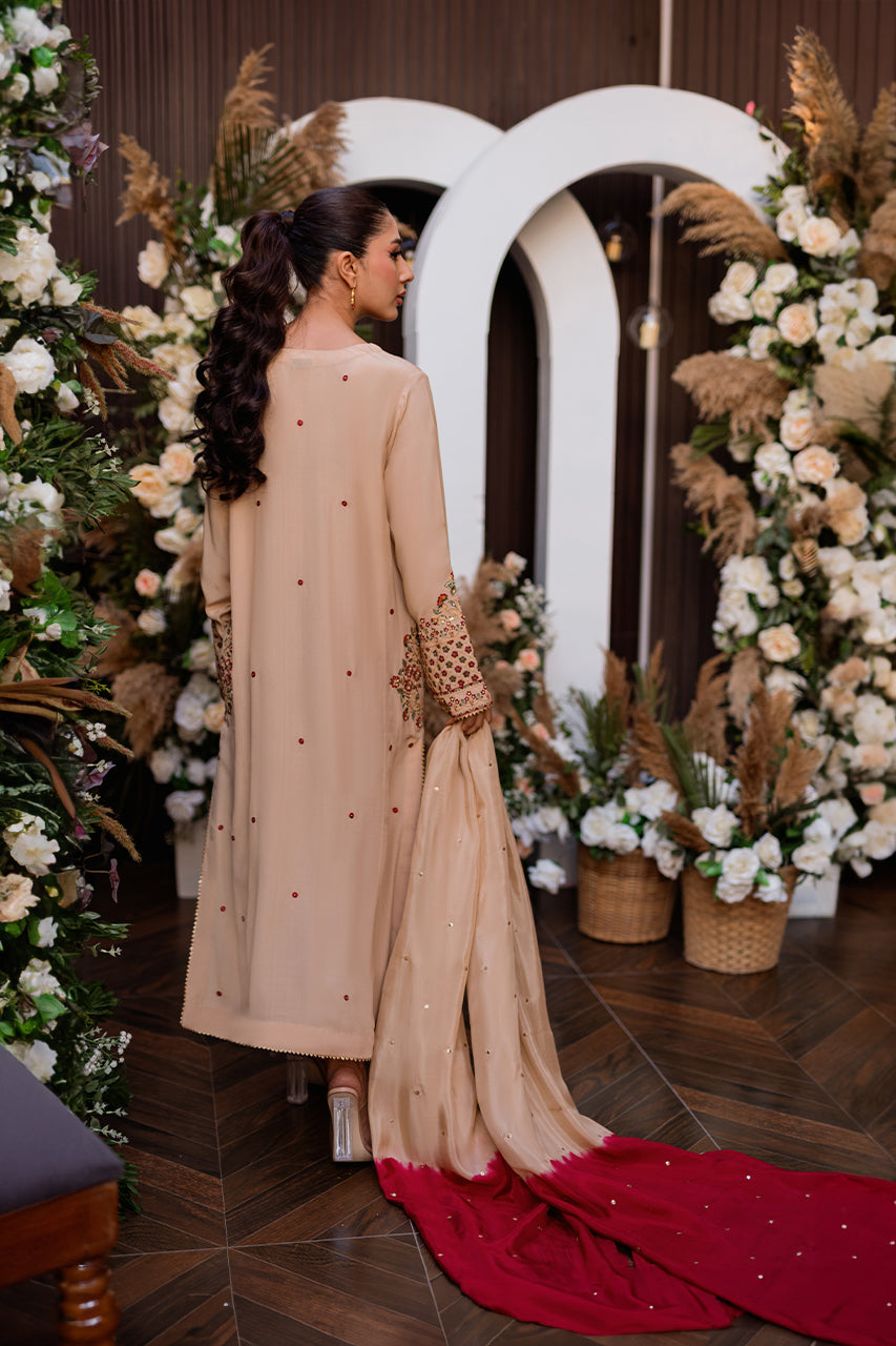 Introducing Sahara, a luminous A-line crepe silk ensemble that epitomizes elegance. Adorned with intricate hand embroidery embellished with delicate sequins and pearls, the front and pockets become a canvas of timeless craftsmanship. Paired seamlessly with straight trousers, this ensemble exudes sophistication. Elevate the allure with a medium silk dupatta, embellished with sequins and namak para lace, adding a touch of opulence to your look. Sahara is not just an outfit; it's a statement of refined style, where every detail is meticulously designed to enhance your grace and make you shine.