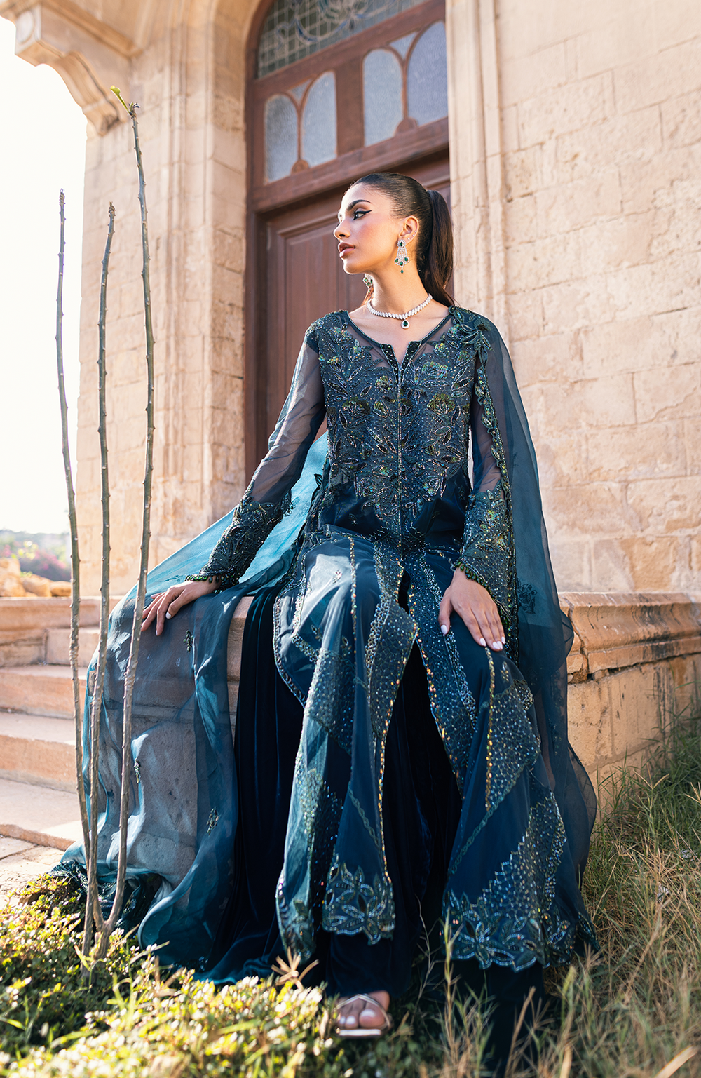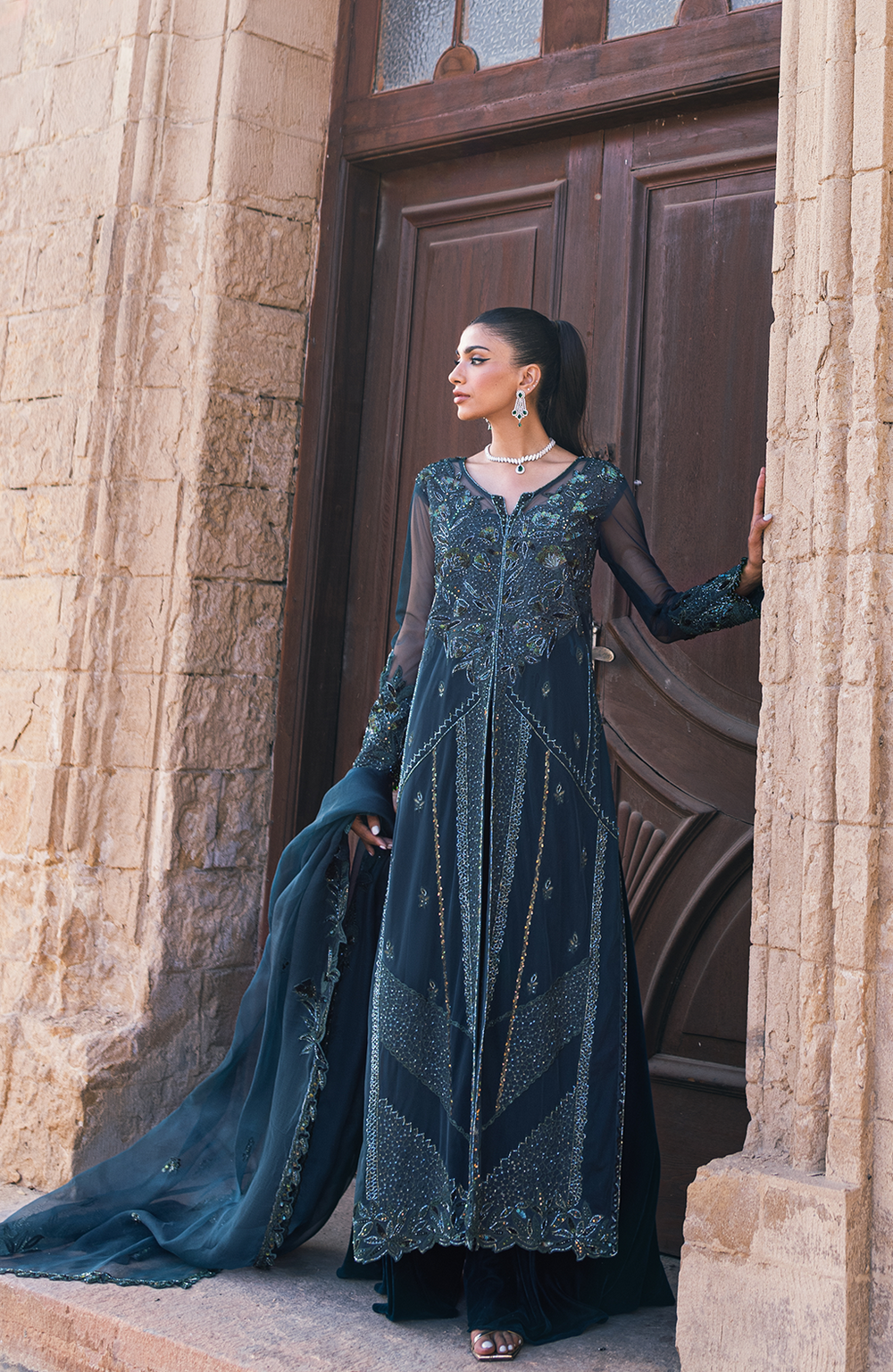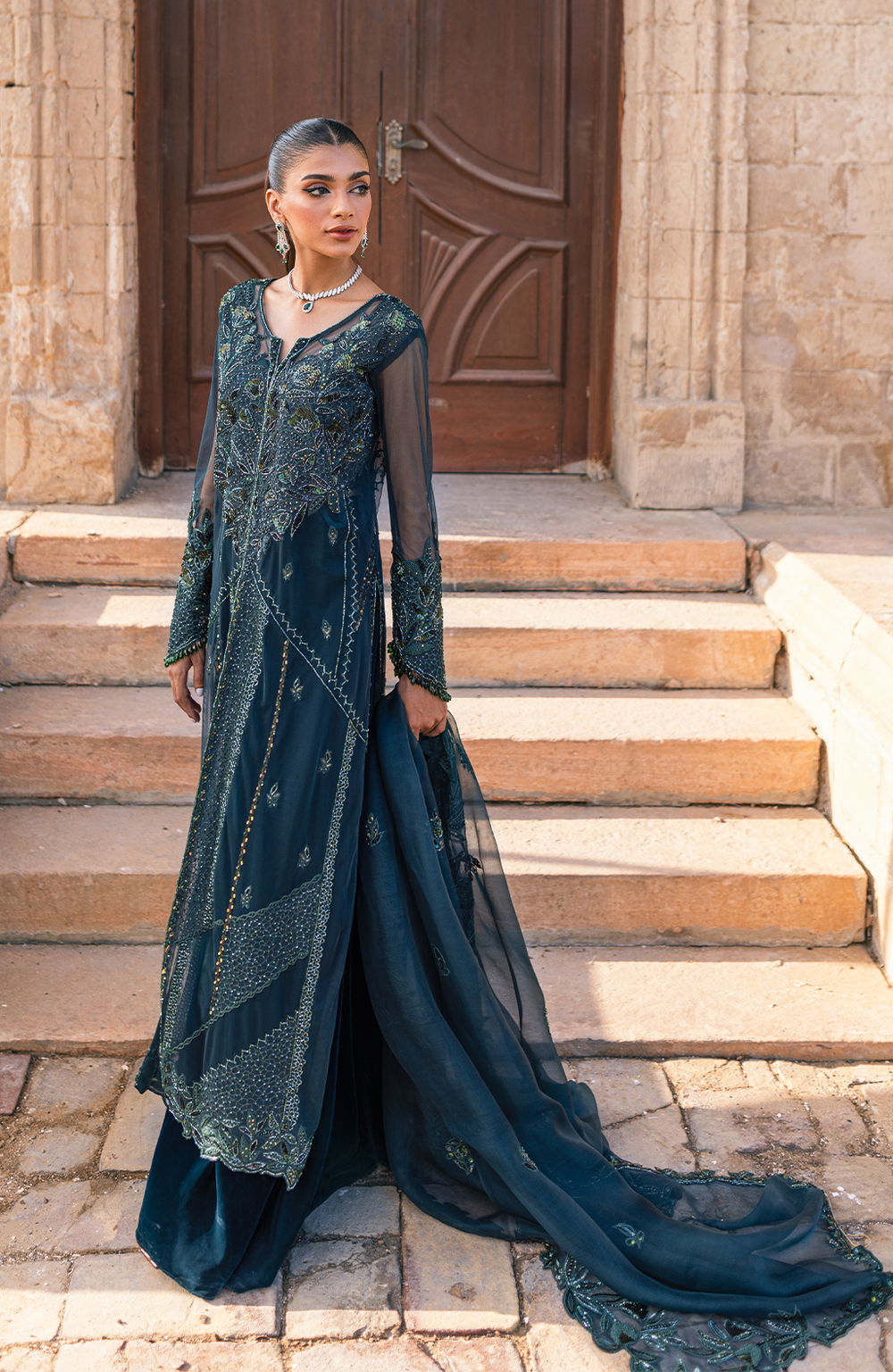 Samara is elevated with cut dana, crystals, sitare and resham work bringing back old charm. You can style this outfit for a mehendi event during this wedding season. The alluring, dark green colour long kameez paired with velvet lehenga and handcrafted organza dupatta.