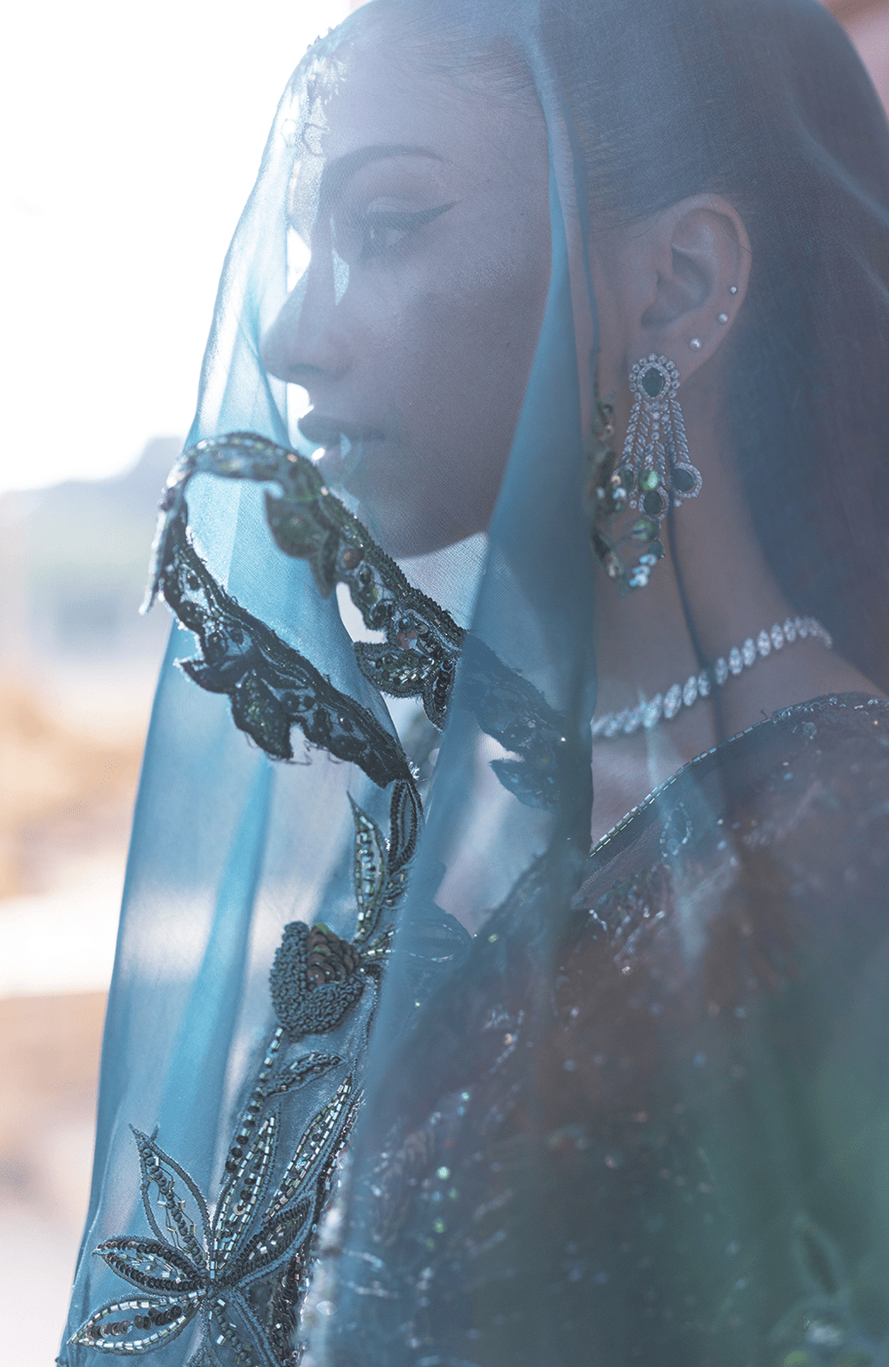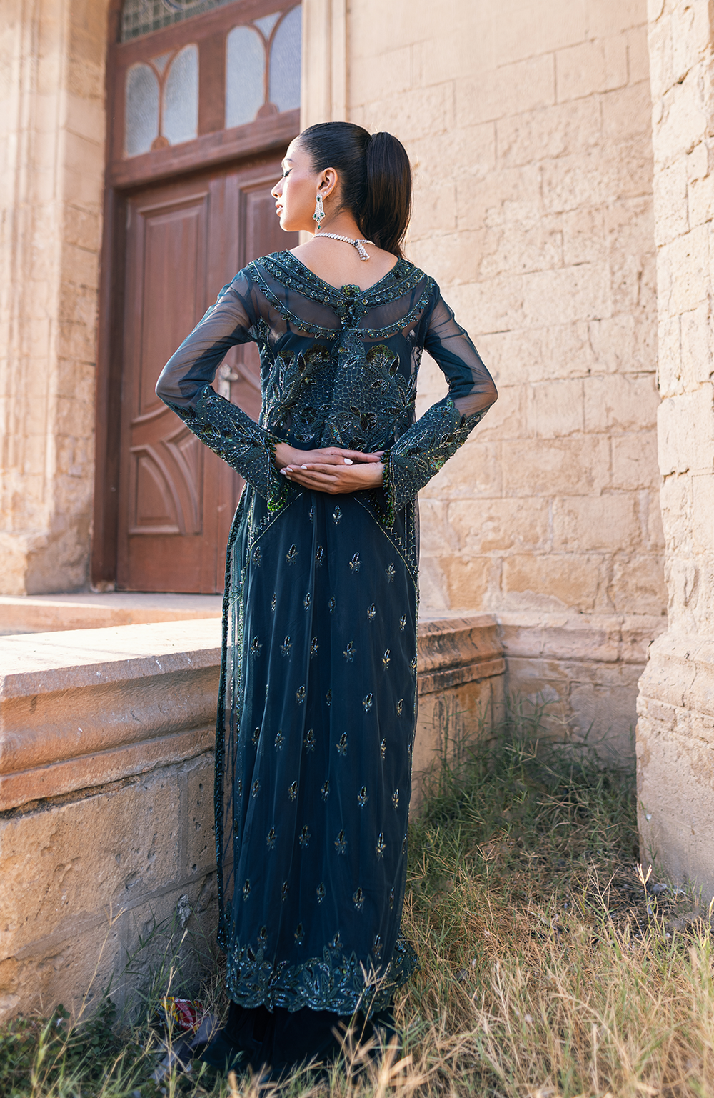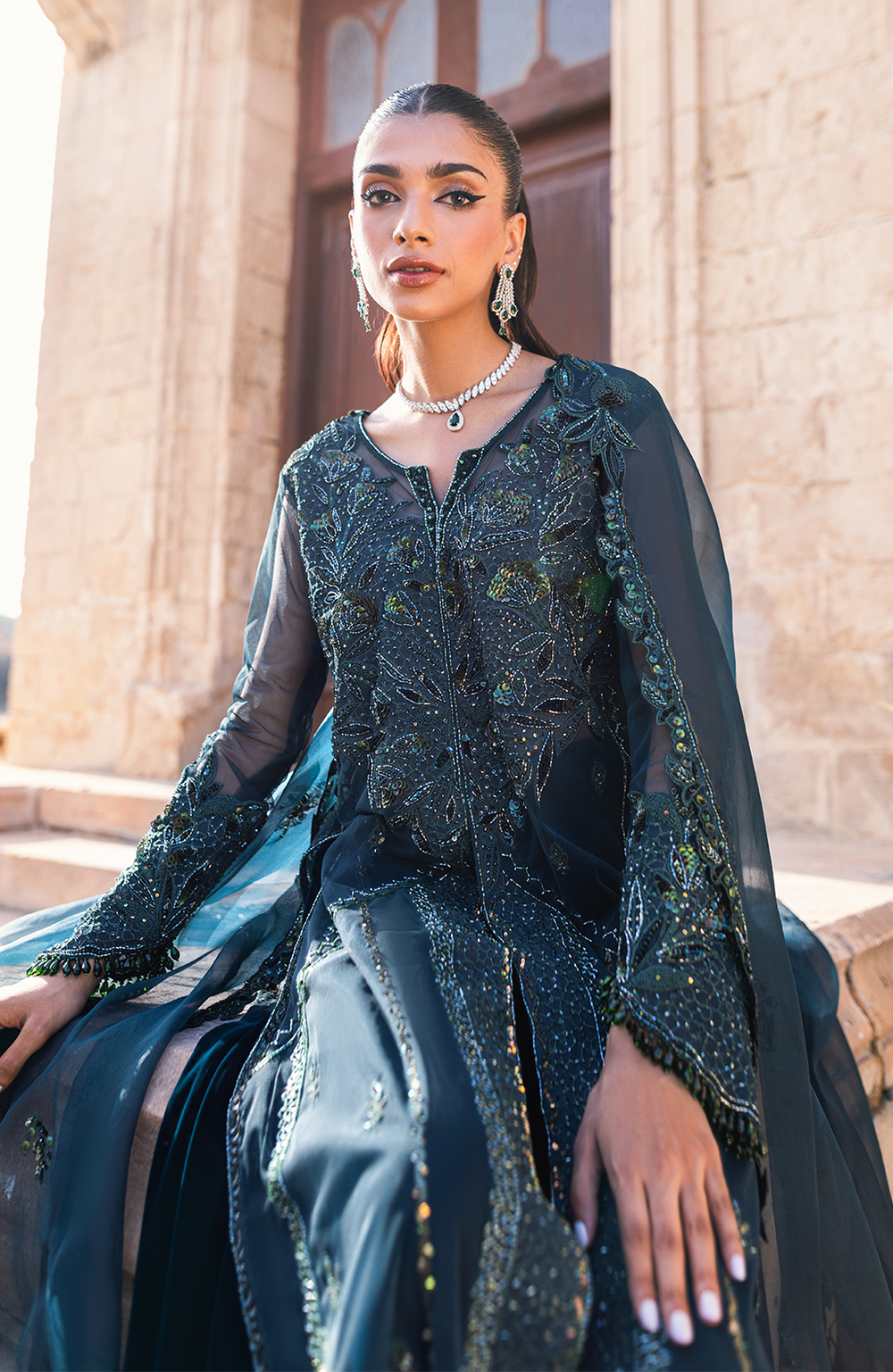 Samara is elevated with cut dana, crystals, sitare and resham work bringing back old charm. You can style this outfit for a mehendi event during this wedding season. The alluring, dark green colour long kameez paired with velvet lehenga and handcrafted organza dupatta.