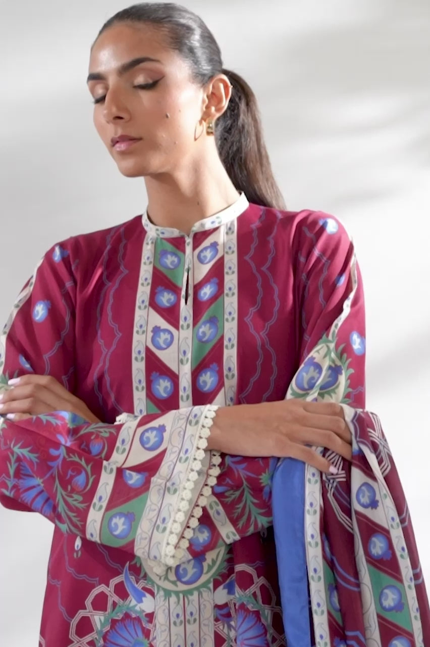 Discover timeless charm with a crimson khaddi silk shirt and medium silk dupatta. This a-line shirt and a sweeping dupatta features an azure, sage green, and ivory print elevated with...