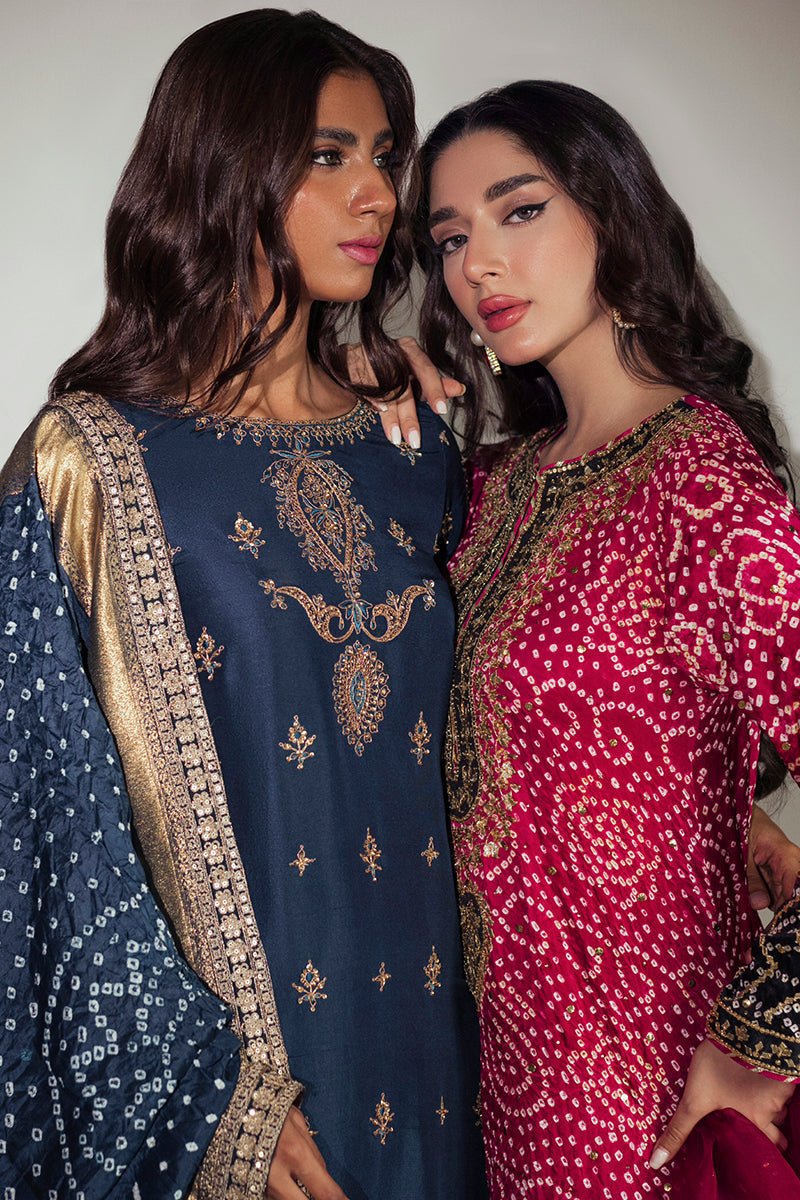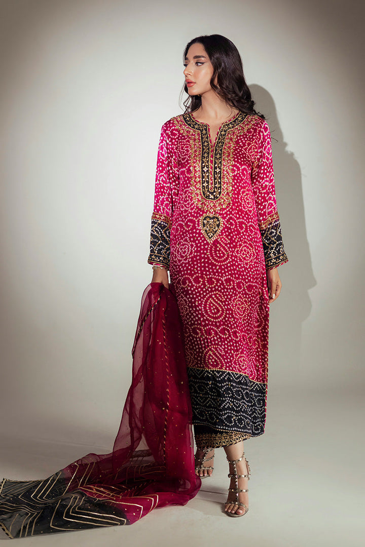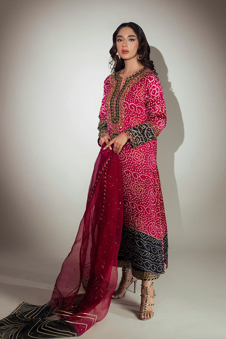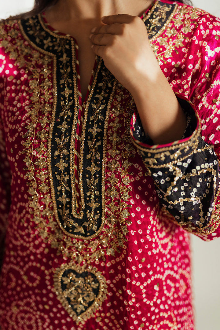 Look forever festive in this pink ensemble. Featuring delicate goat and zardozi kaam on the neckline, sleeves and pants; this ensemble is perfect for any party or shaadi event.