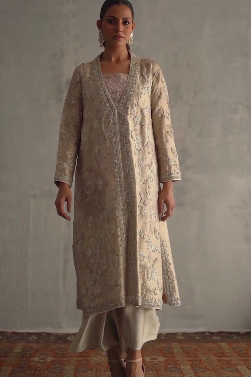 For a look that will have you standing out in a crowd, go for our exquisitely crafted meysuri jacket! Detailed in zardozi with added hints of tea pink & ivory...