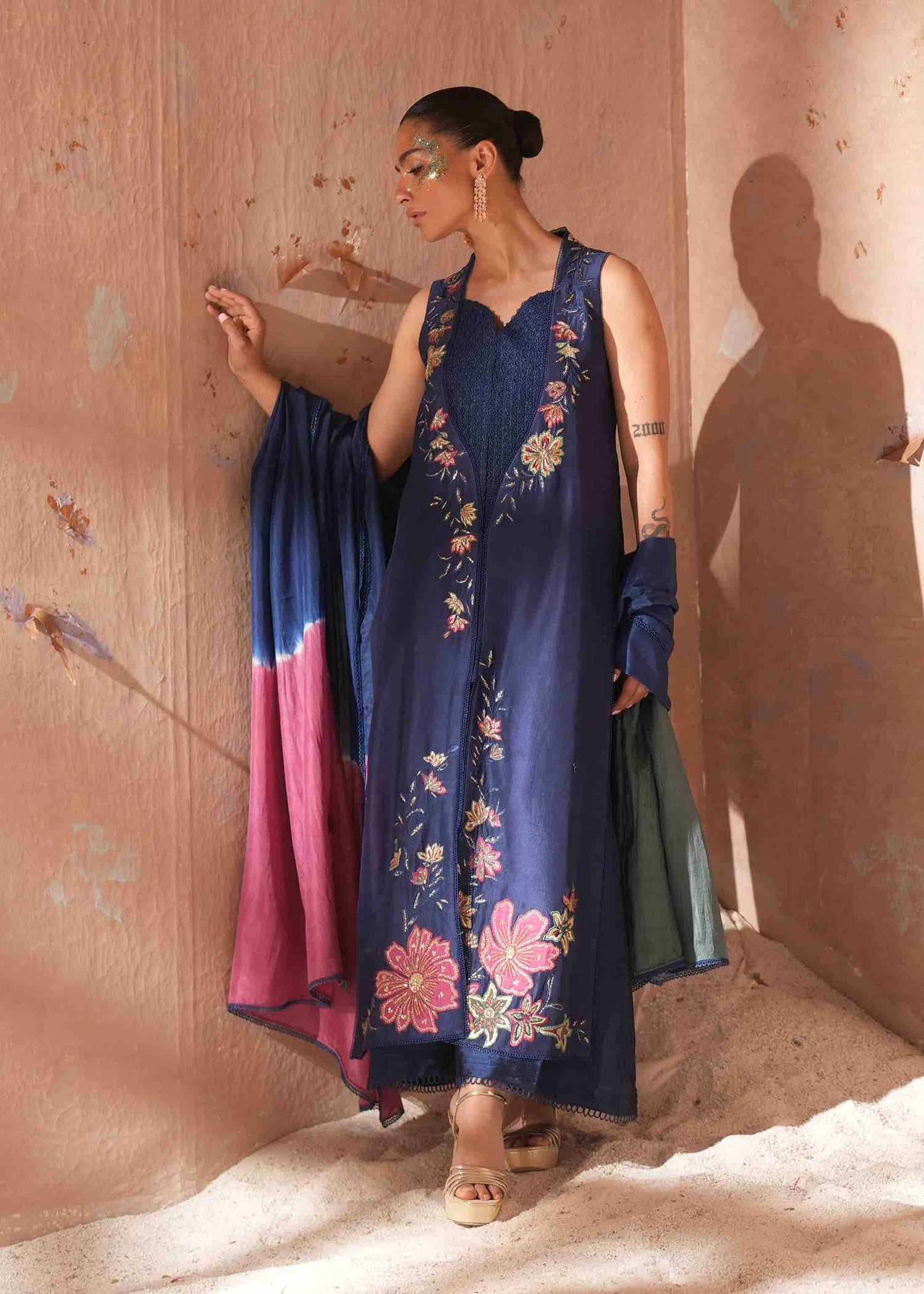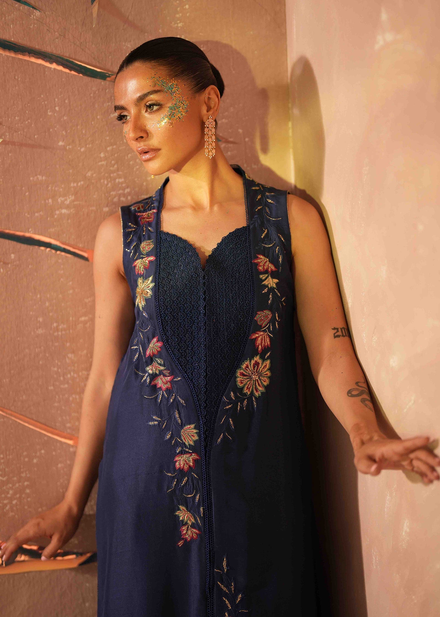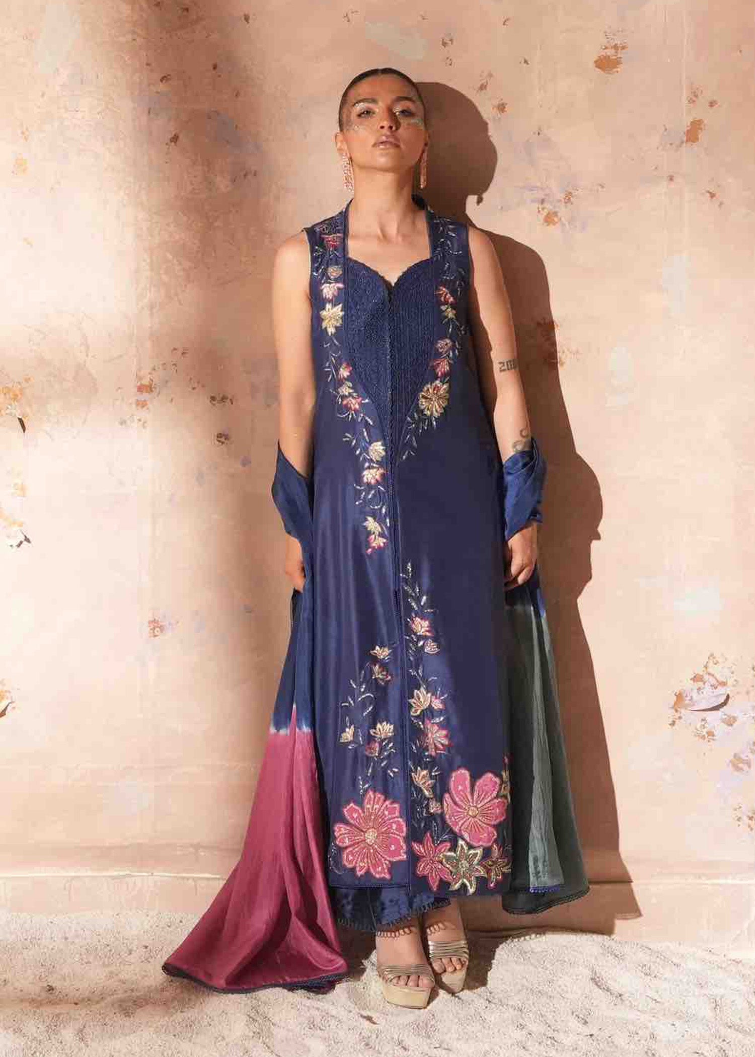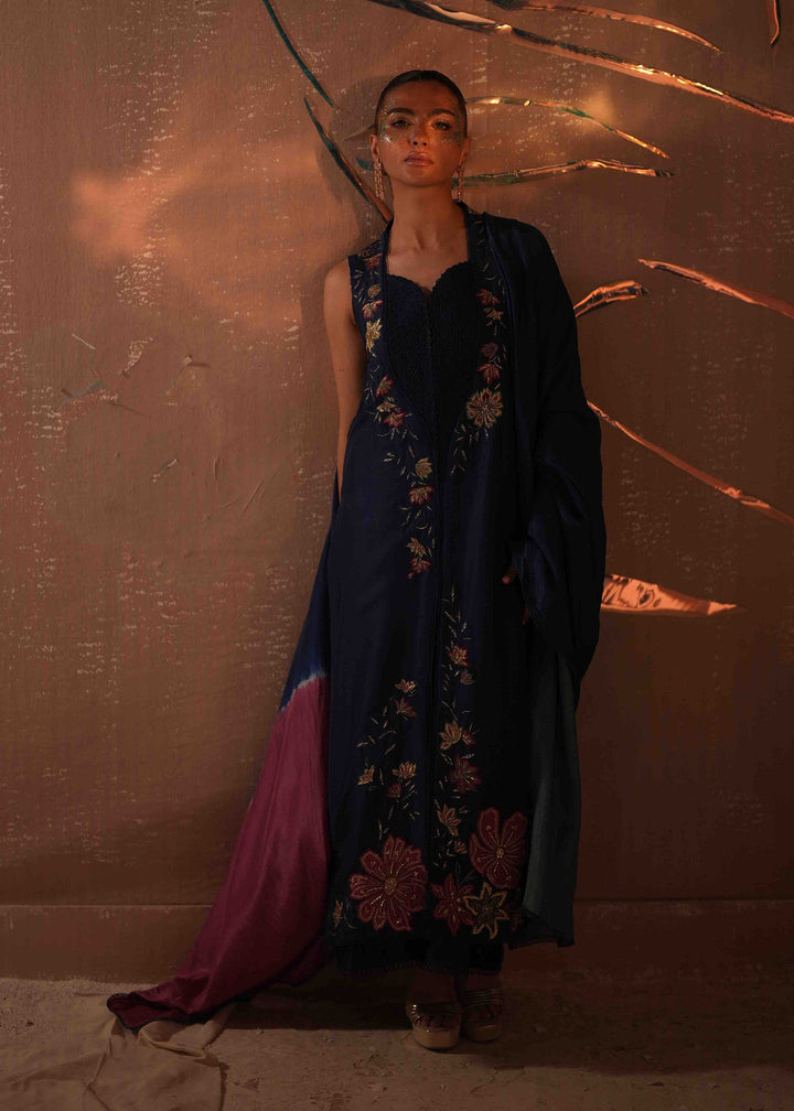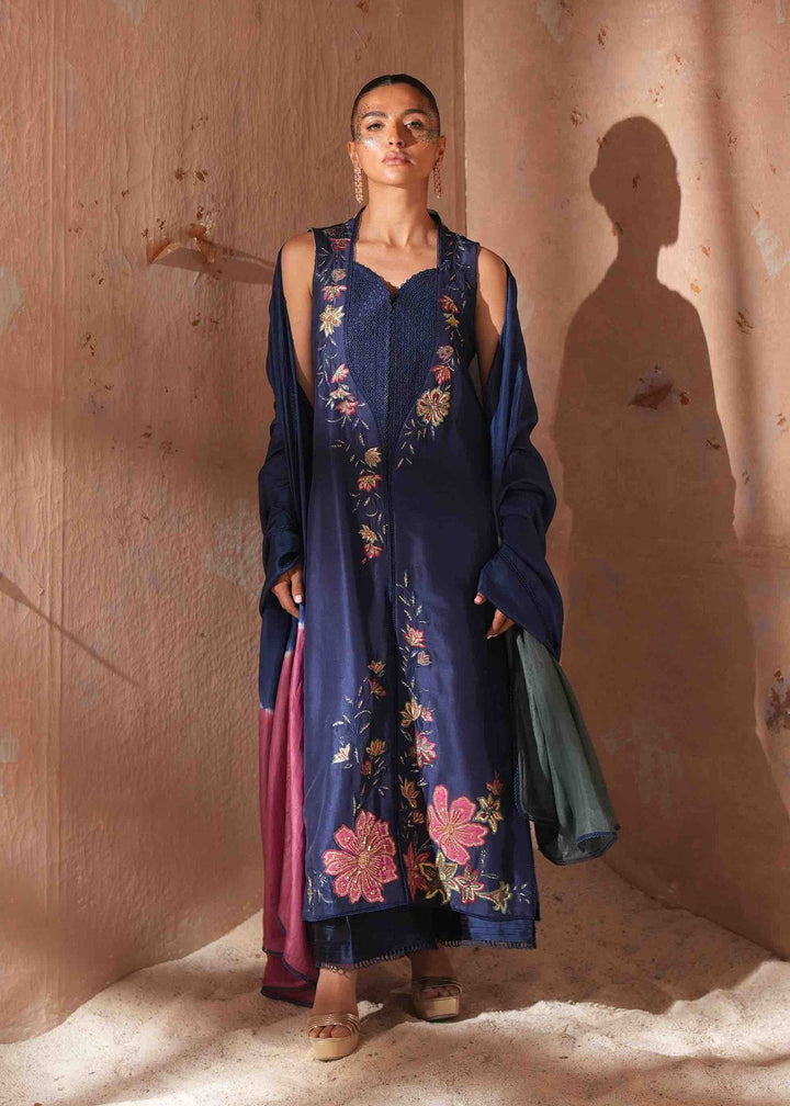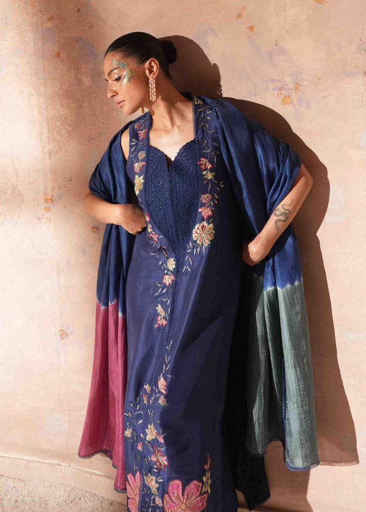 A breathtaking raw silk ensemble with intricate detailing, matching pants, and a flowing silk dupatta for sophisticated elegance.