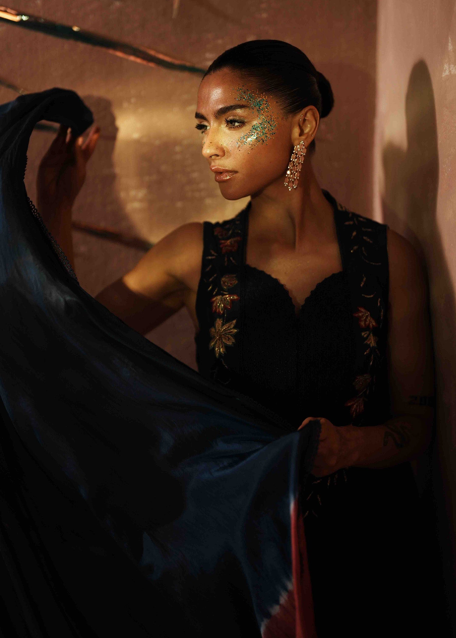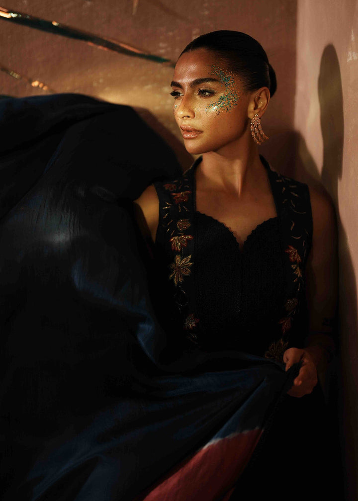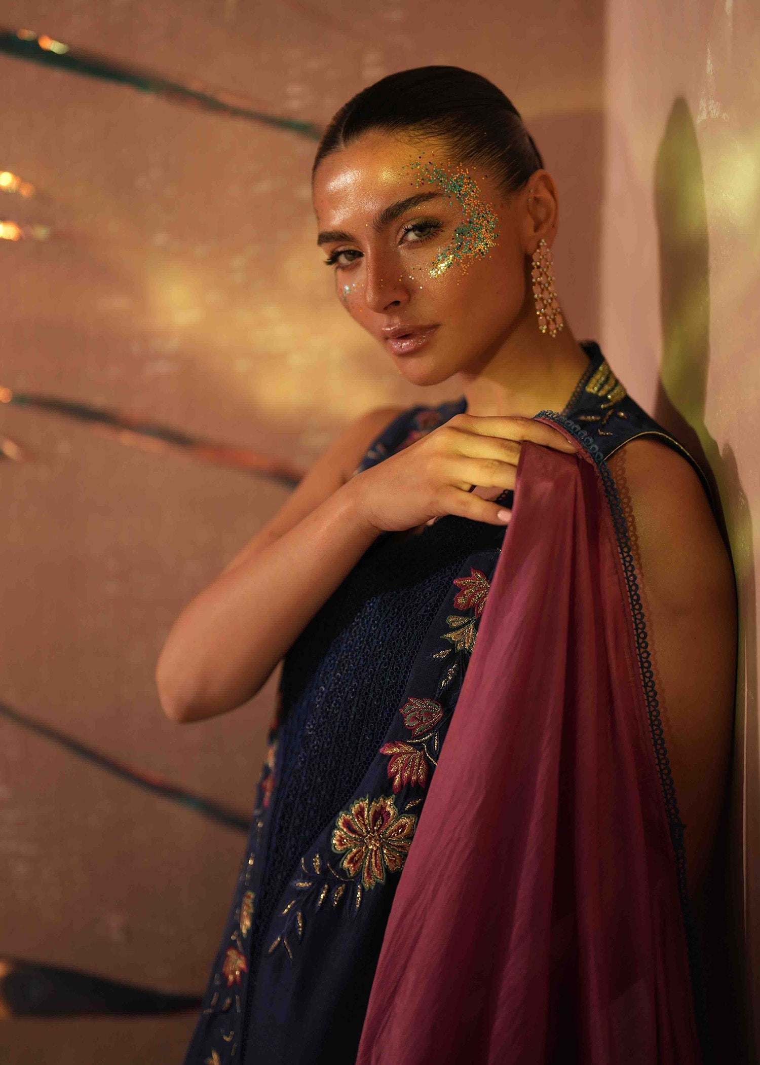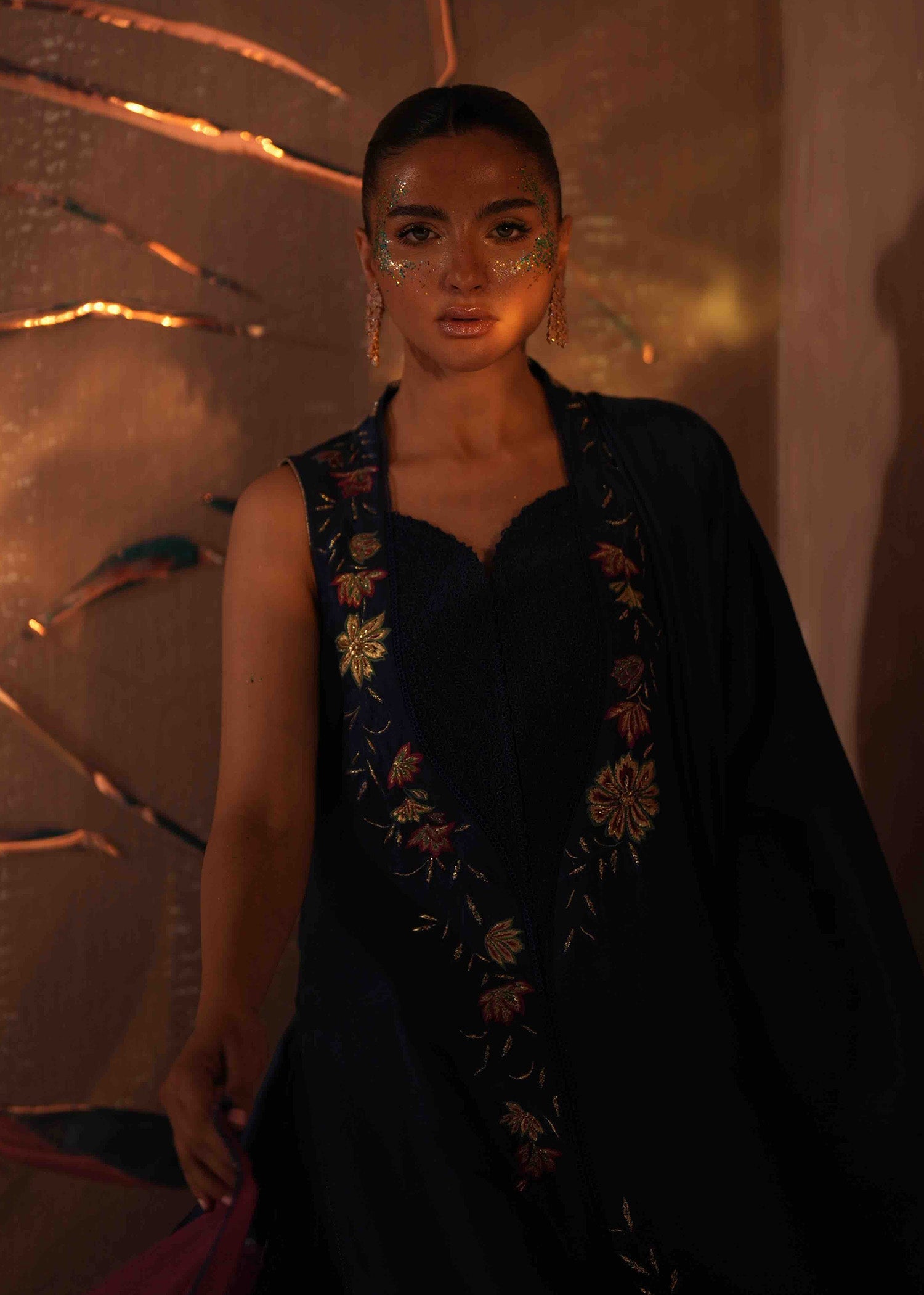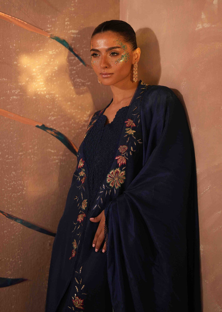 A breathtaking raw silk ensemble with intricate detailing, matching pants, and a flowing silk dupatta for sophisticated elegance.