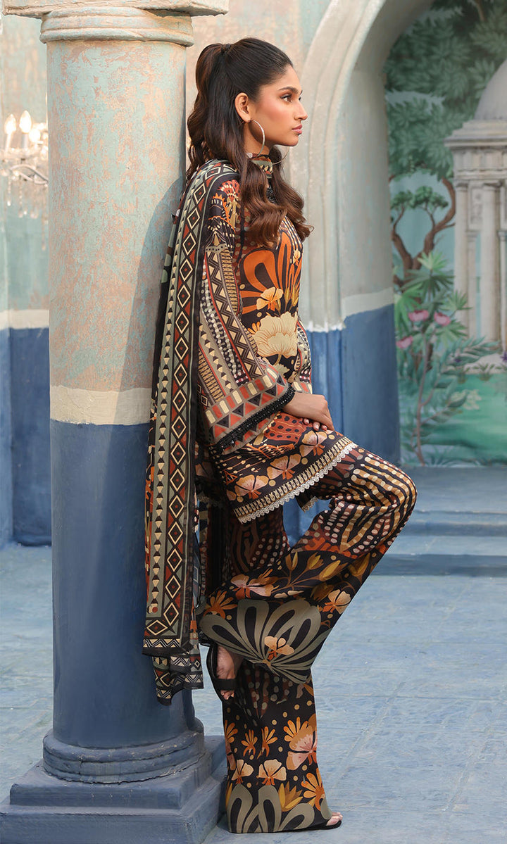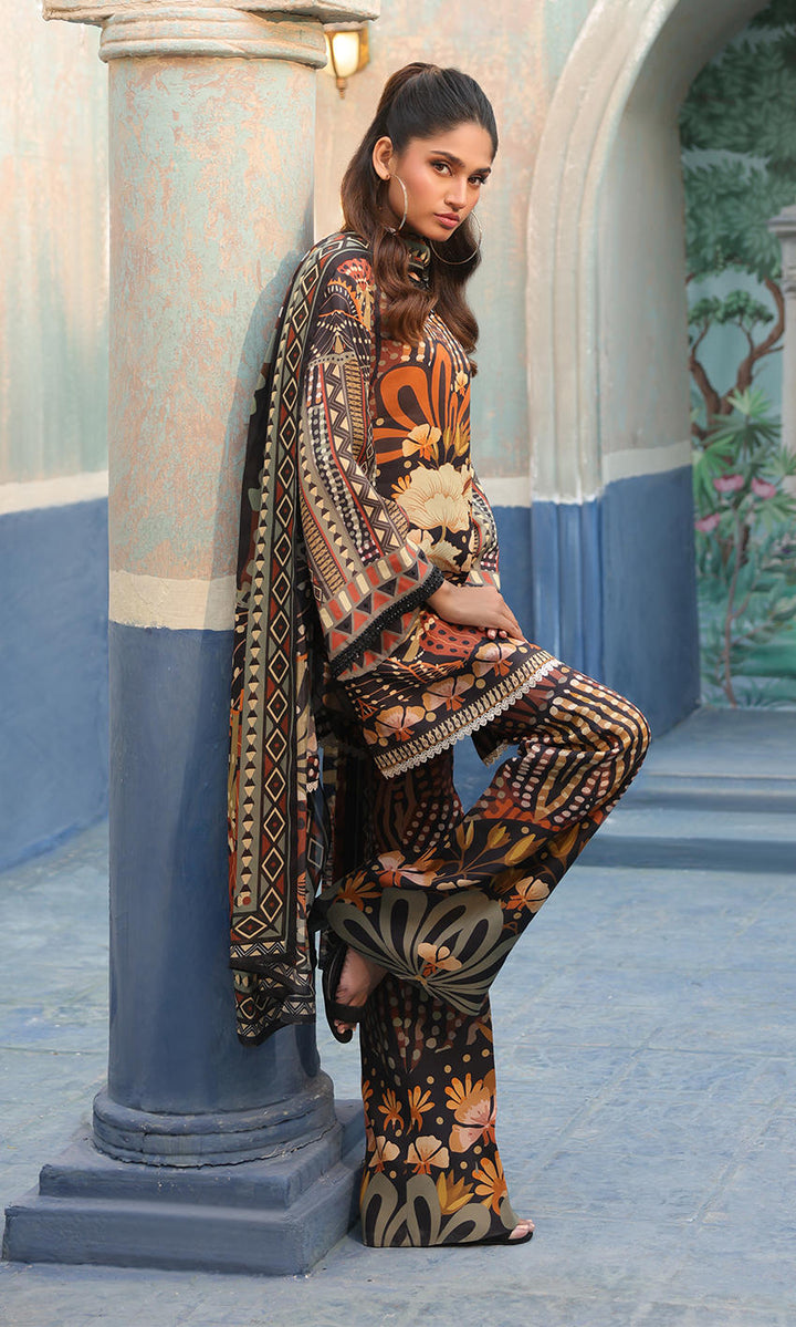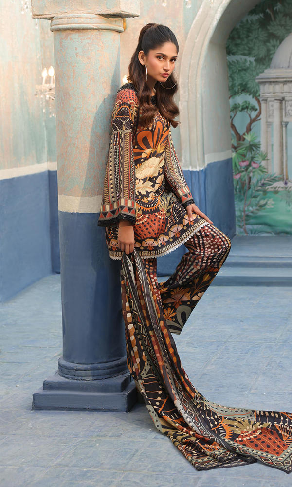 Bedazzled with black crystals, this chic printed three piece ensemble is a breezy number.