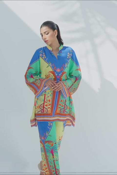 A striking ode to playful artistry, this crepe ensemble is bathed in vibrant azure, calming aquamarine, and pale yellow tones, with azure fringe accents on the flowing sleeves. The relaxed top, adorned with a botanical print and avian accents, drapes effortlessly, exuding bohemian elegance. It pairs beautifully with matching culottes featuring a vibrant tropical print.